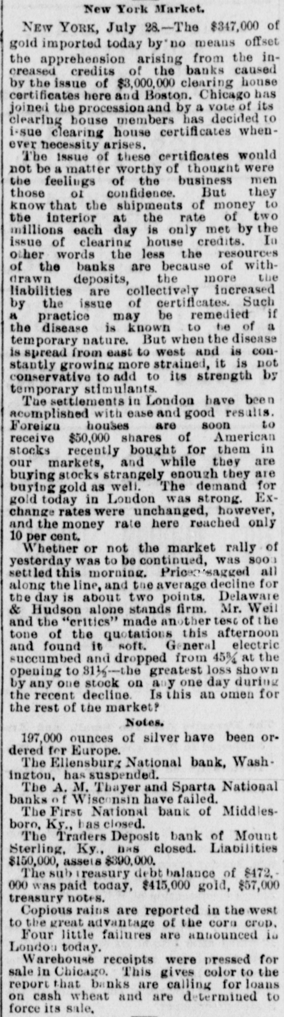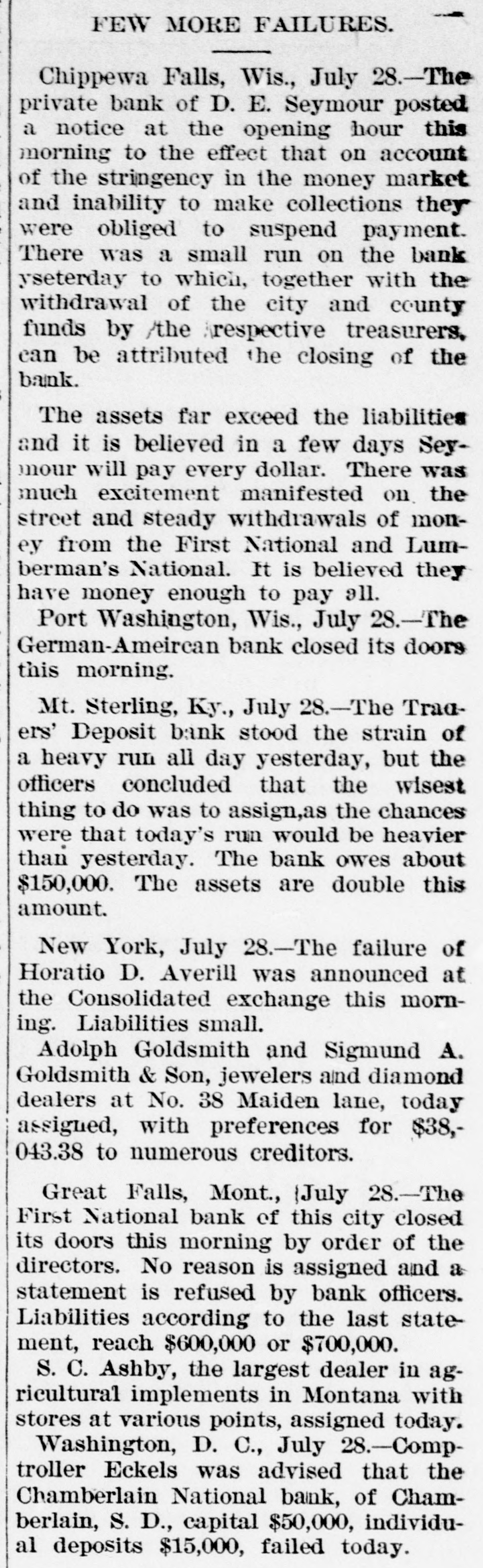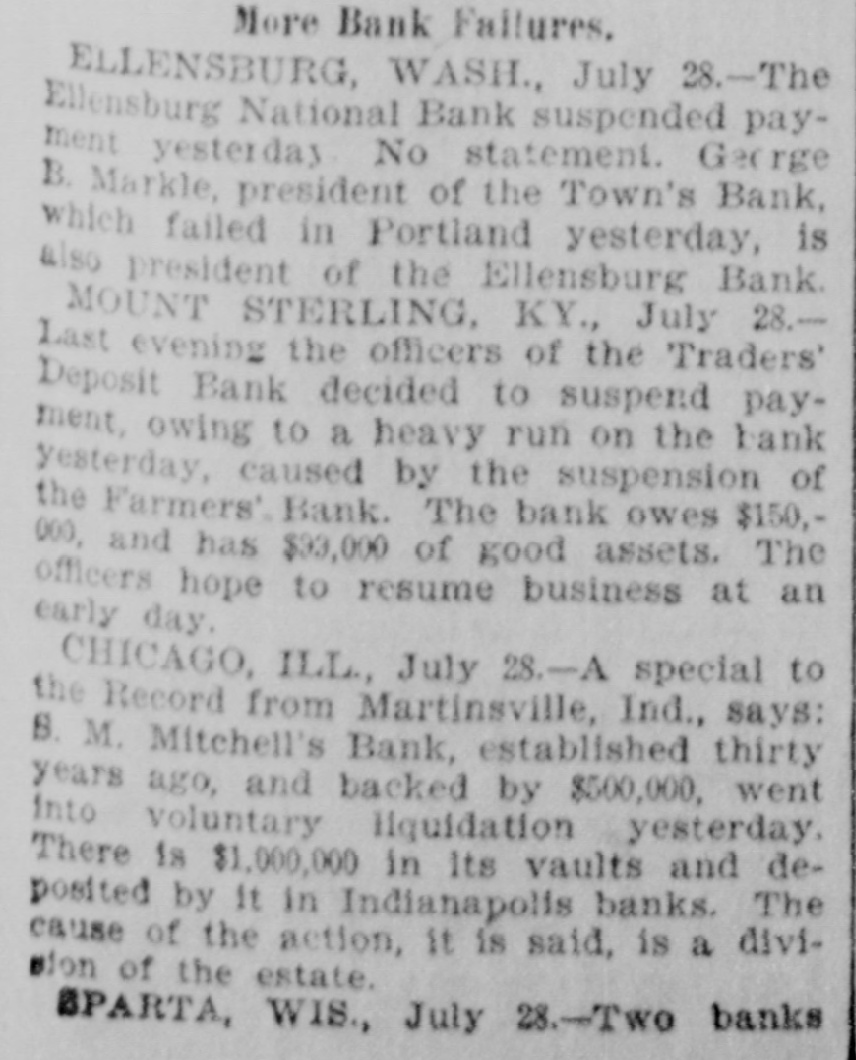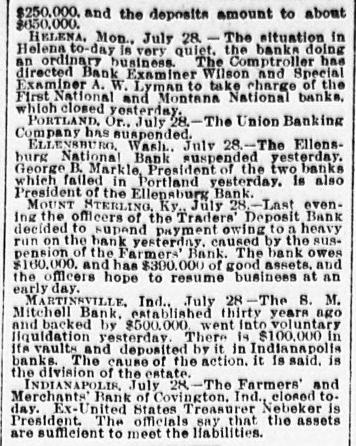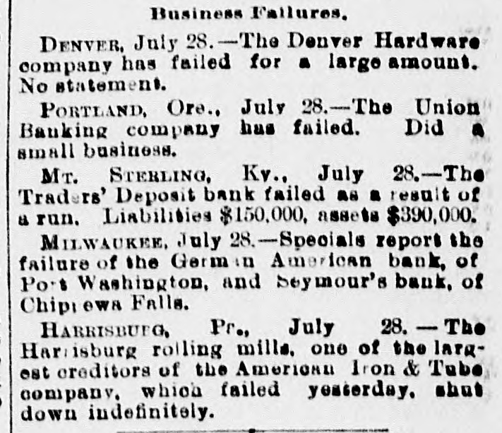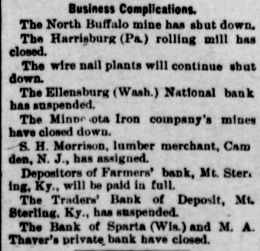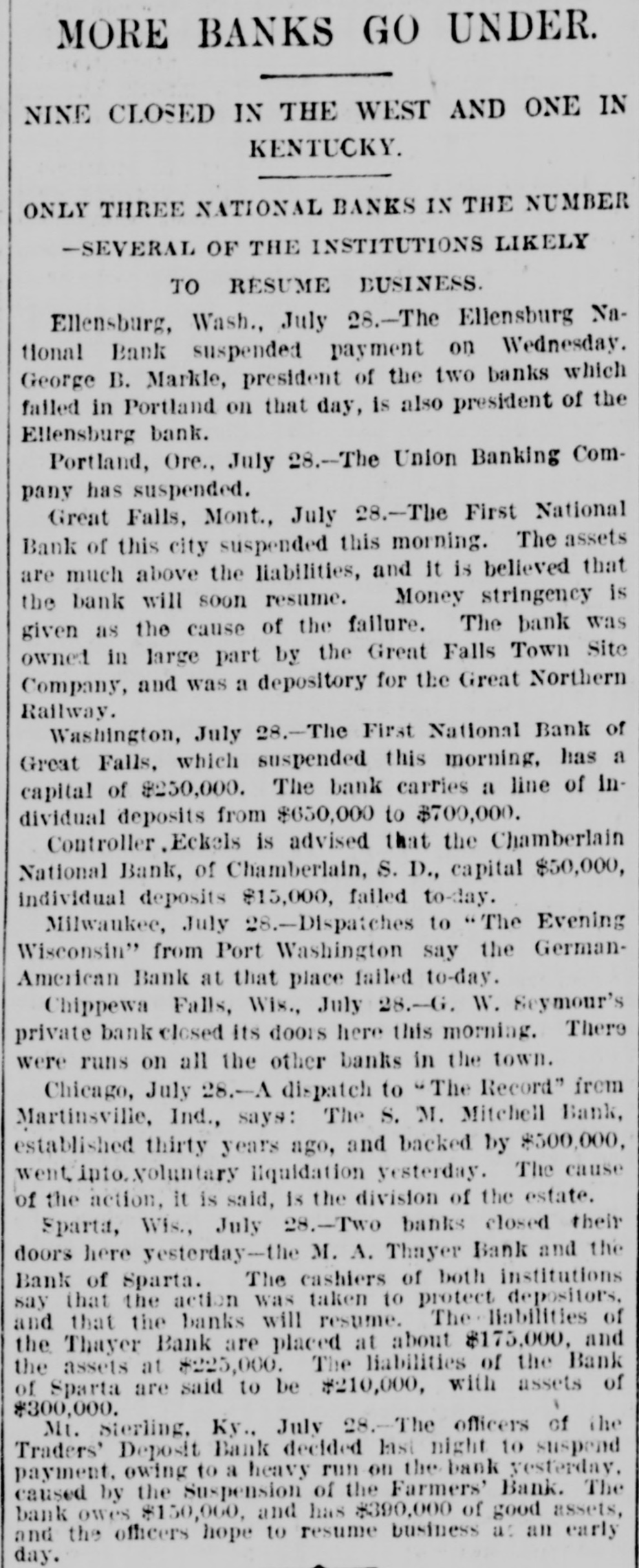 Lowell in the Procession, BOSTON, July 28.-At a meeting of the directors of the Tremont and Suffolk Mills at Lowell, Mass., held in this city today, it was voted to operate these mills on half time beginning Monday next. In the Iron Fields. DULUTH, Minn., July 28.-The Minnesota Iron company will close all mining operations at hand in the ore mines of the company until further notice. NAGAUNEE, Mich., July 28-The North Buffalo mine of the Buffalo-Mining company closed down Wednesday night. ISHPEMING, Mich., July 27.-The Lake Superior Mining company, which laid off 250 men ten days will close down section 16 of the mine, throwing 200 more men out Saturday night. Wire Nail Mills Closed. PITTSBURG, Pa., July 28.-The wire nail manufacturers held a meeting here yesterday and in view of the depressed condition of business it was. decided to continue the shut down until September 1. All wire nail factories in the United States are shut down at present. Failures Reported Yesterday. The S. M. Mitchell bank, Martinville, Ind., has gone into voluntary liquidation. It has been backed by $500,000. The Ellensburg (Wash.) National Bank has suspended. The Traders' Deposit Bank, Mt. Sterling, Ky., has been closed during a run; liabilities $150,000; assets, $390,000. The First National Bank of Great Falls, Mont., has assets much above liabilities but has been forced to close. Two Sparta, Wis., banks have closed, the M. A. Thayer bank, liabilities $175,000; assets $225,000; and the Bank of Sparta, liabilities, $210,000; assets, $300,000. Big Figures These. PITTSBURG, Pa., July 28.-The liabilities of the American Iron and Tube company of Harrisburg are placed at $1,250,000; the assets exceed $2,000,000. The Shut Down at Waltham. WALTHAM, Mass., July 28.-Today it was announced that Green's department at the Americsn Watch factory would not start up at all on August 7th.Green's department has about 60 hands. All other departments would be affected more or less. Oldtown Concerns Closed. OLDTOWN, July 28.-Itlooks as if Oldtown would suffer some from the general business depression. Mr. Herbert Gray, proprietor of the valise factory in this city, has a large stock on hand and as the orders are not coming in as fast as usual at this season of the year, Mr. Gray expects to close the factory for a time. Carlton & Jellison's shingle mill is closed, and Mr. E. W. Conant, owner of another shingle mill, says his mill will run but a short time longer, as there is such a small demand for shingles. Four Hundred Lost Work. HARRISBURG, Pa., July 28.-The Harrisburg Rolling Mill Company, one of the largest creditors of the American Tube and Iron Company, which yesterday went into the hands of receivers, shut down last evening and will be closed indefinitely. Over 400 men were