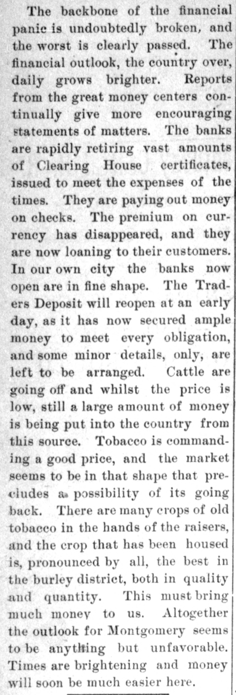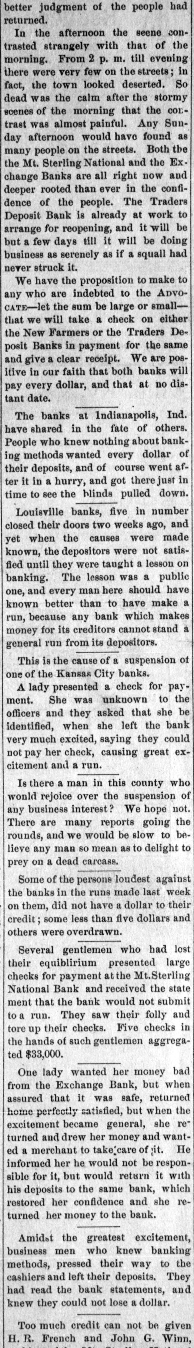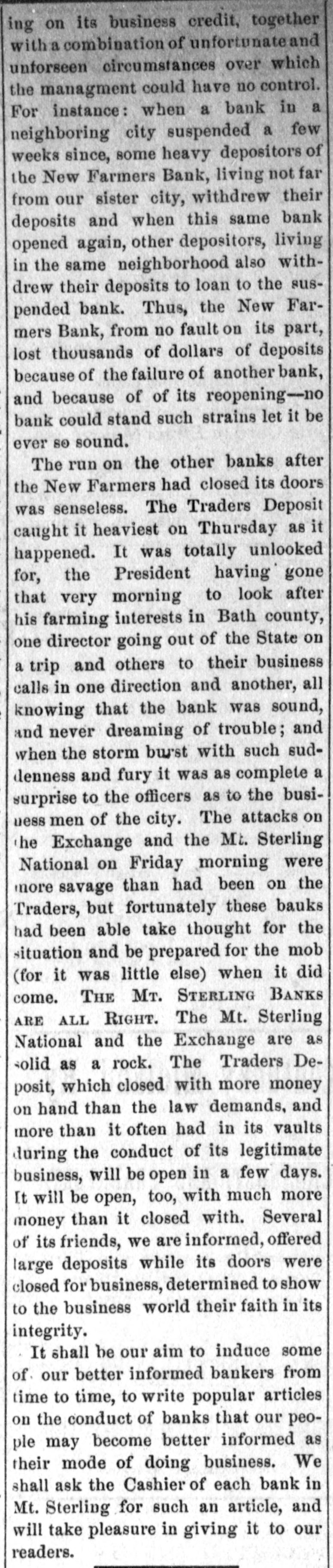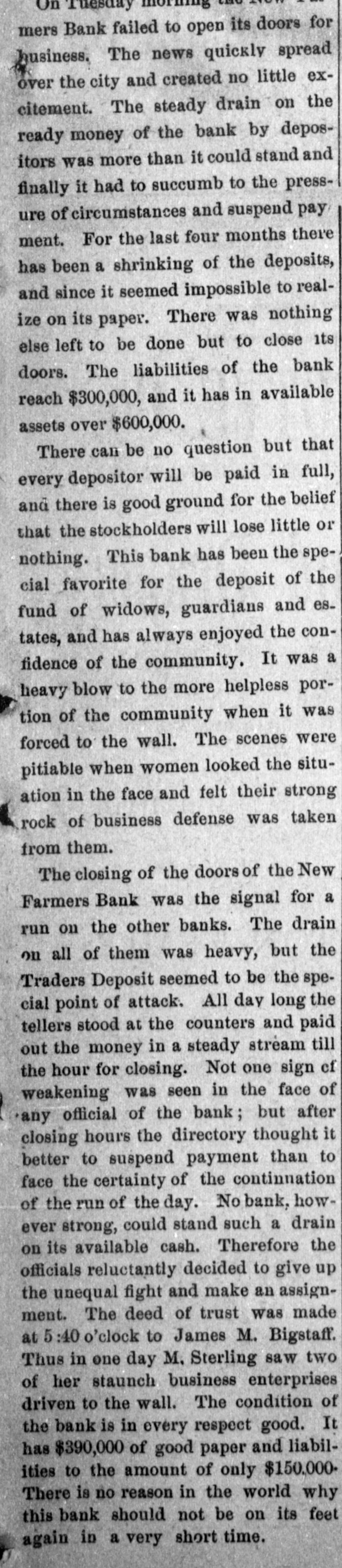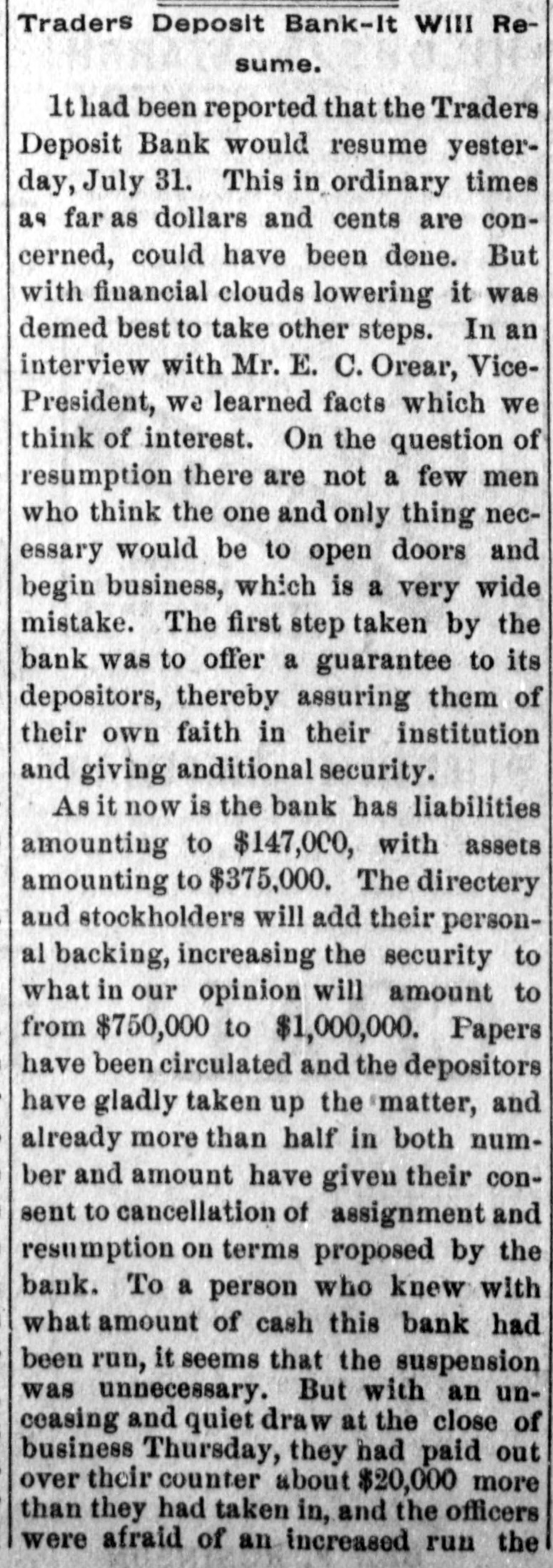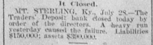 Lowell in the Procession, BOSTON, July 28.-At a meeting of the directors of the Tremont and Suffolk Mills at Lowell, Mass., held in this city today, it was voted to operate these mills on half time beginning Monday next. In the Iron Fields. DULUTH, Minn., July 28.-The Minnesota Iron company will close all mining operations at hand in the ore mines of the company until further notice. NAGAUNEE, Mich., July 28-The North Buffalo mine of the Buffalo-Mining company closed down Wednesday night. ISHPEMING, Mich., July 27.-The Lake Superior Mining company, which laid off 250 men ten days will close down section 16 of the mine, throwing 200 more men out Saturday night. Wire Nail Mills Closed. PITTSBURG, Pa., July 28.-The wire nail manufacturers held a meeting here yesterday and in view of the depressed condition of business it was. decided to continue the shut down until September 1. All wire nail factories in the United States are shut down at present. Failures Reported Yesterday. The S. M. Mitchell bank, Martinville, Ind., has gone into voluntary liquidation. It has been backed by $500,000. The Ellensburg (Wash.) National Bank has suspended. The Traders' Deposit Bank, Mt. Sterling, Ky., has been closed during a run; liabilities $150,000; assets, $390,000. The First National Bank of Great Falls, Mont., has assets much above liabilities but has been forced to close. Two Sparta, Wis., banks have closed, the M. A. Thayer bank, liabilities $175,000; assets $225,000; and the Bank of Sparta, liabilities, $210,000; assets, $300,000. Big Figures These. PITTSBURG, Pa., July 28.-The liabilities of the American Iron and Tube company of Harrisburg are placed at $1,250,000; the assets exceed $2,000,000. The Shut Down at Waltham. WALTHAM, Mass., July 28.-Today it was announced that Green's department at the Americsn Watch factory would not start up at all on August 7th.Green's department has about 60 hands. All other departments would be affected more or less. Oldtown Concerns Closed. OLDTOWN, July 28.-Itlooks as if Oldtown would suffer some from the general business depression. Mr. Herbert Gray, proprietor of the valise factory in this city, has a large stock on hand and as the orders are not coming in as fast as usual at this season of the year, Mr. Gray expects to close the factory for a time. Carlton & Jellison's shingle mill is closed, and Mr. E. W. Conant, owner of another shingle mill, says his mill will run but a short time longer, as there is such a small demand for shingles. Four Hundred Lost Work. HARRISBURG, Pa., July 28.-The Harrisburg Rolling Mill Company, one of the largest creditors of the American Tube and Iron Company, which yesterday went into the hands of receivers, shut down last evening and will be closed indefinitely. Over 400 men were