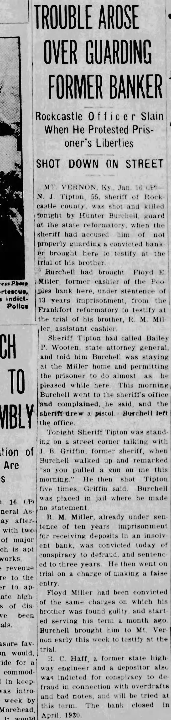 TROUBLE AROSE OVER GUARDING FORMER BANKER Rockcastle Slain When He Protested Prisoner's Liberties SHOT DOWN ON STREET N J Tipton 55. sheriff of Rock castle county. was shot and killed tonight by Hunter Burchell, guard at the state reformatory. when the sheriff had accused him of not properly guarding convicted bank er brought here to testify at the trial of his brother Burchell had brought Floyd E. Miller former cashier of the Peo ples bank here, under stentence of 13 years imprisonment, from the Frankfort reformatory to testify at the trial of his brother, R. M. Mil- ler, assistant cashier Sheriff Tipton had called Bailey P. Wooten, state attorney general, and told him Burchell was staying at the Miller home and permitting the prisoner to do almost as he pleased while here. This morning Burchell went to the sheriff's office and complained. he said, and the sheriff-drew a pistol Burcheil left the office Tonight Sheriff Tipton was standing on street corner talking with J. B. Griffin. former sheriff, when Burchell walked up and remarked "so you pulled a gun on me this morning.' He then shot Tipton five times, Griffin said. Burchell was placed in jail where he made no statement R. M. Miller, already under sen tence of ten years imprisonment for receiving deposits in an insolv ent bank, was convicted today of conspiracy to defraud. and sentenc ed to three years. He then went on trial on a charge of making a false entry Floyd Miller had been convicted of the same charges on which his brother was found guilty, and start ed serving his term a month ago Burchell brought him to Mt. Ver non early this week to testify at the trial. R. C. Haff, a former state high way engineer and a depositor also was indicted for conspiracy to de fraud in connection with overdrafts and bad notes, and will be tried at this term. The bank closed in April, 1930