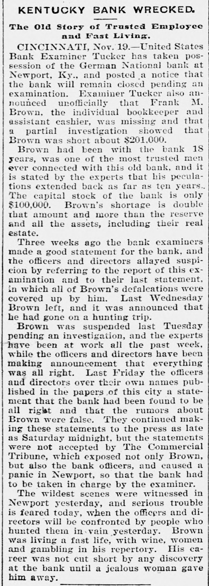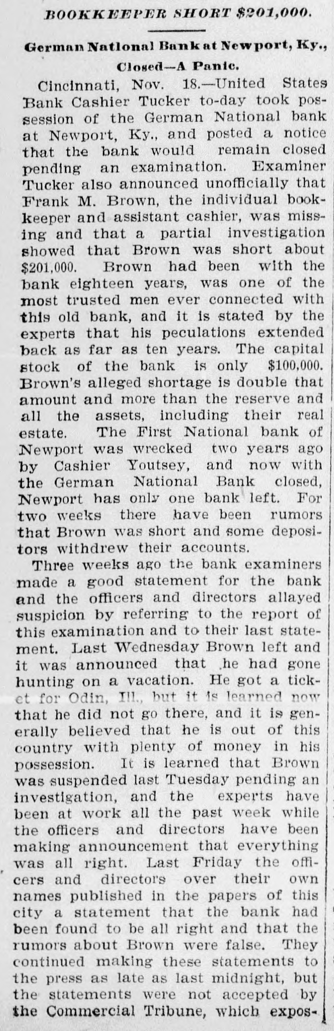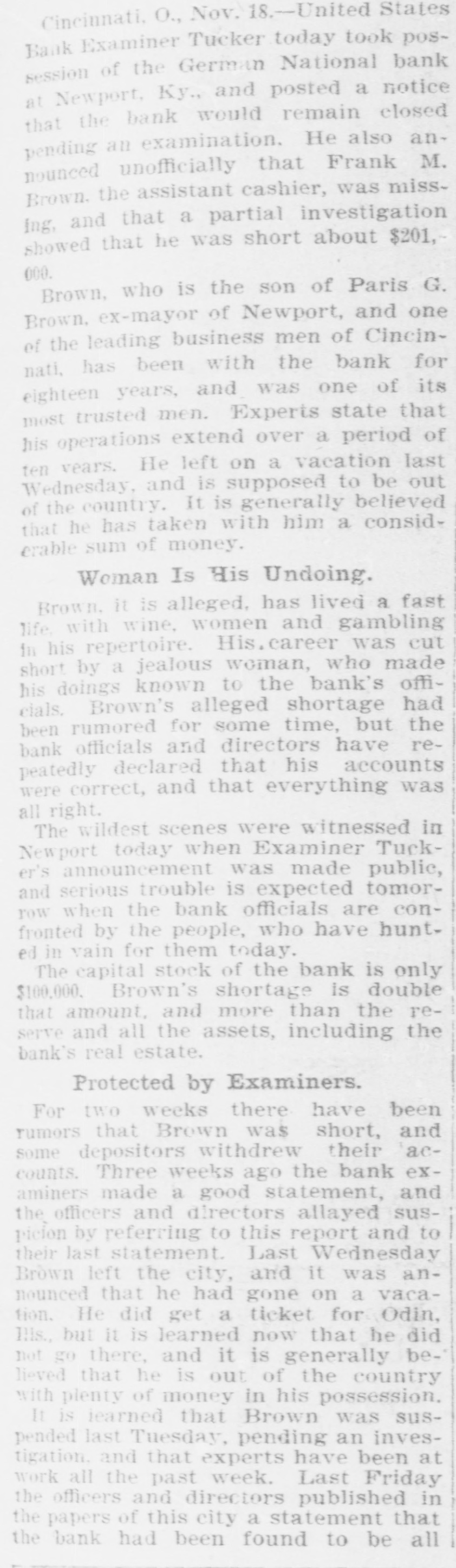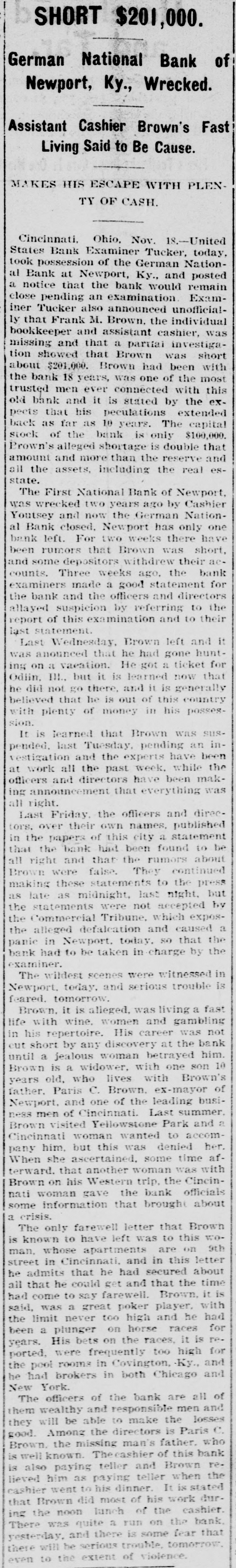 SHORT $201,000. German National Bank of Newport, Ky., Wrecked. Assistant Cashier Brown's Fast Living Said to Be Cause. MAKES HIS ESCAPE WITH PLENTY OF CASH. Cincinnati, Ohio, Nov. 18.-United States Bank Examiner Tucker, today, took possession of the German National Bank at Newport, Ky., and posted a notice that the bank would remain close pending an examination Examiner Tucker also announced unofficially that Frank M. Brown, the individual bookkeeper and assistant cashier, was missing and that a partial investigation showed that Brown was short about $201,000. Brown had been with the bank 18 years, was one of the most trusted men ever connected with this old bank and it is stated by the expects that his peculations extended back as far as 10 years. The capital stock of the bank is only $100,000. Prown's alleged shortage is double that amount and more than the reserve and all the assets, including the real esstate. The First National Bank of Newport, was wrecked two years ago by Cashier Youtsey and now the German National Bank closed. Newport has only one bank left. For two weeks there have been rumors that Brown was short, and some depositors withdrew their accounts. Three weeks ago, the bank examiners made a good statement for the bank and the officers and directors allayed suspicion by referring to the