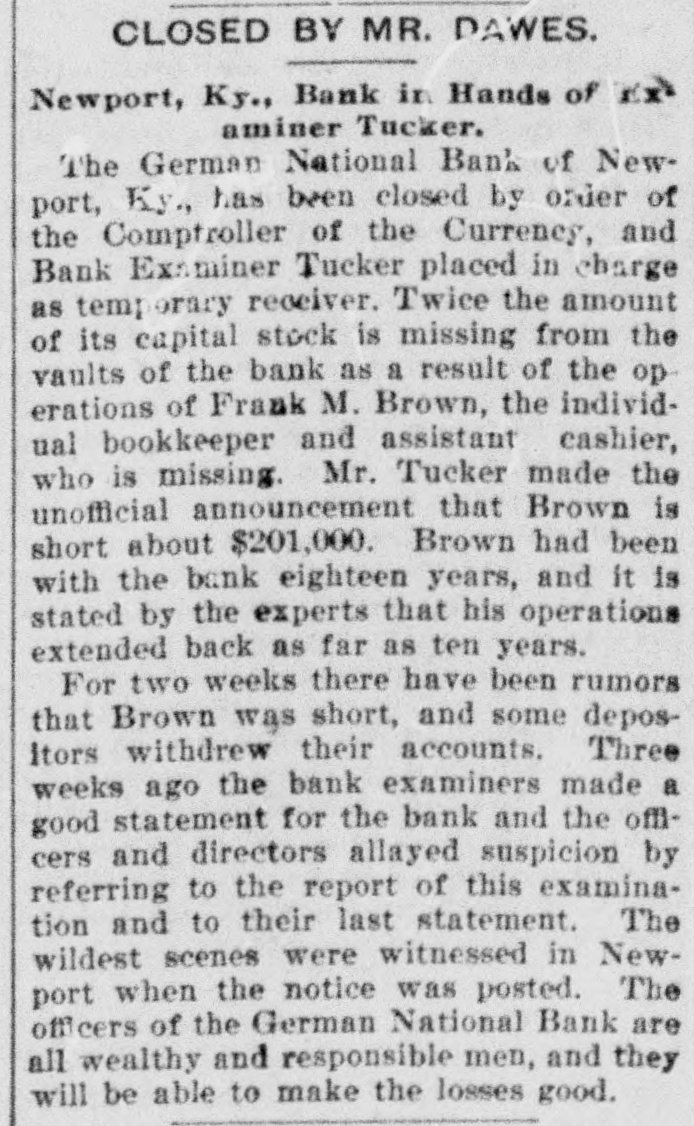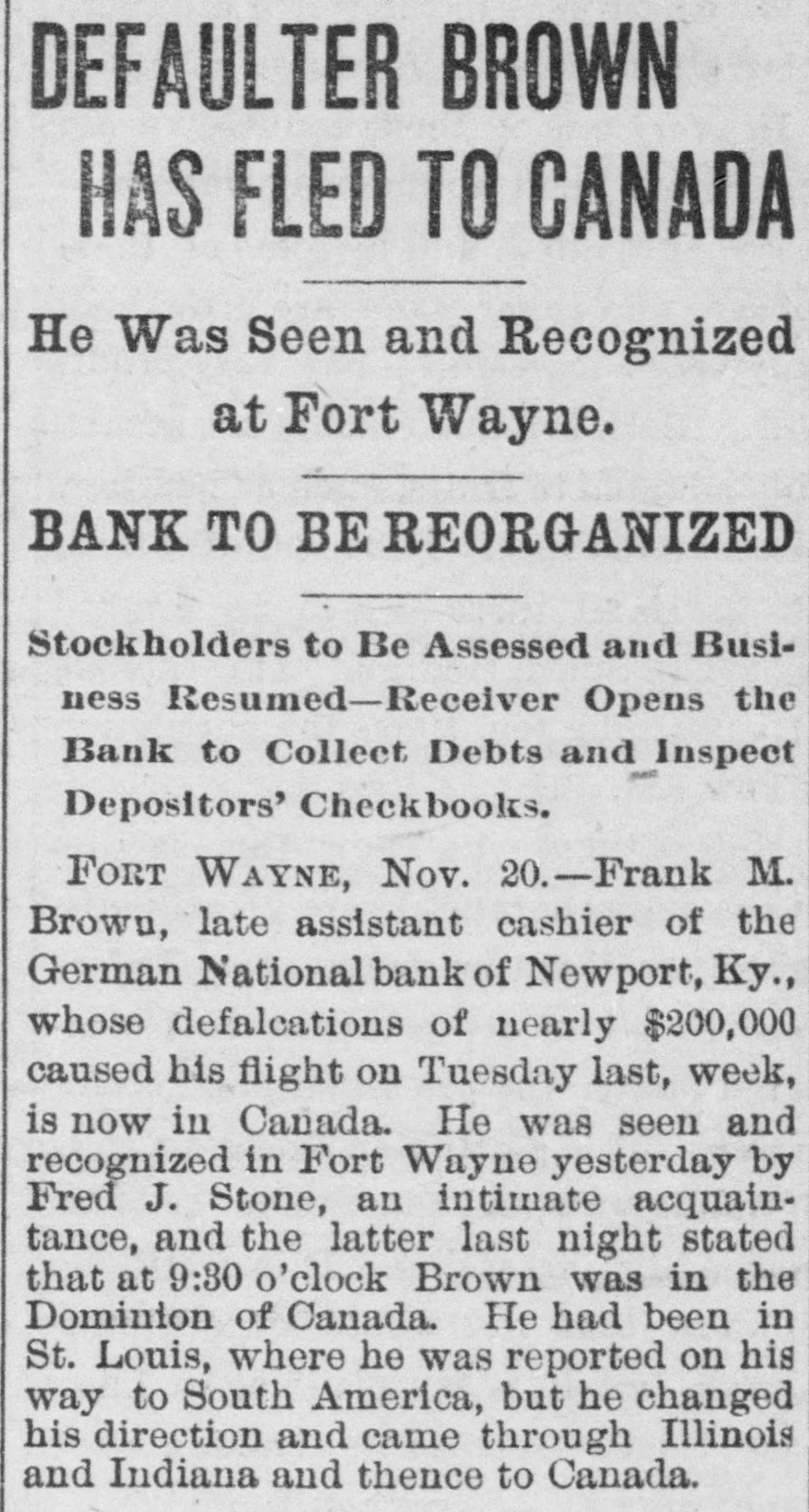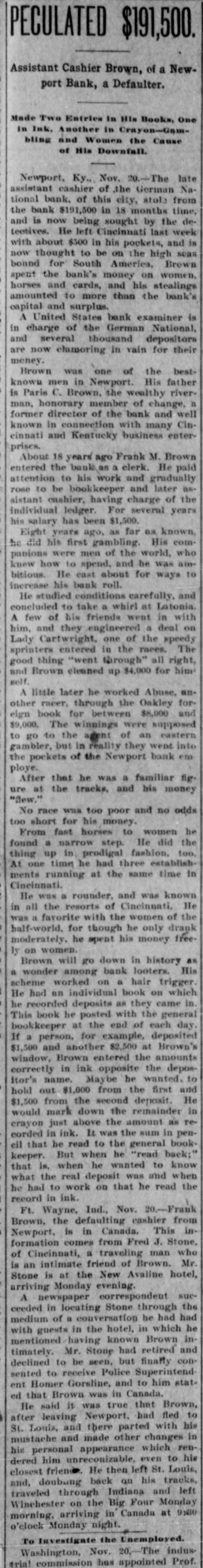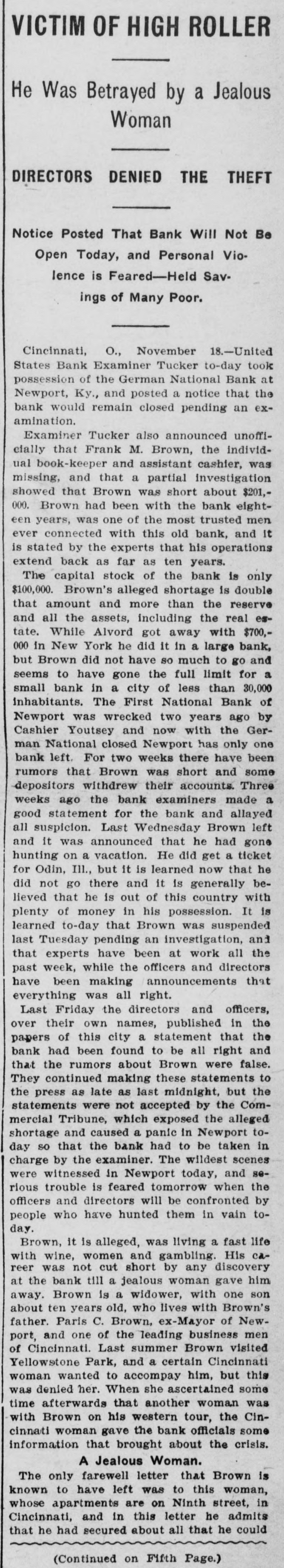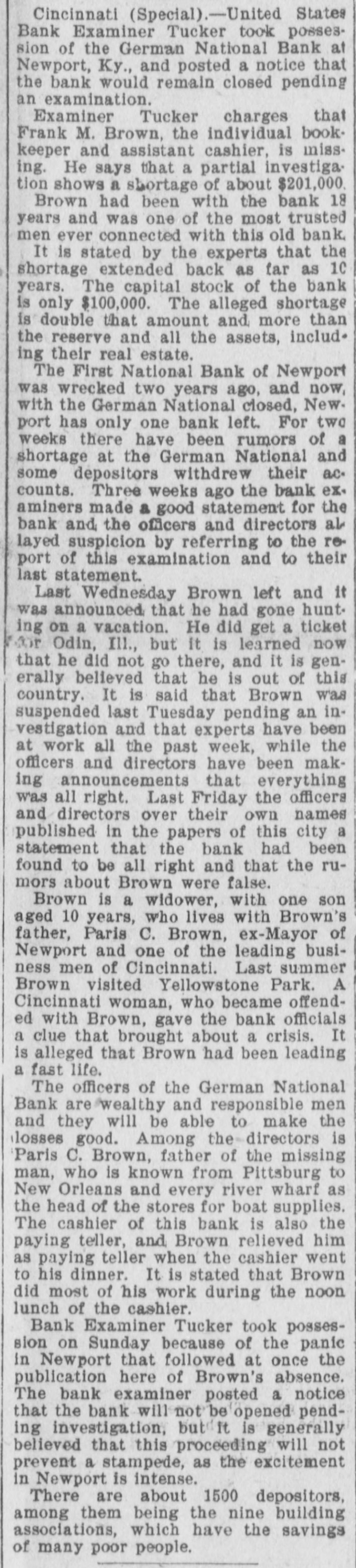 SHORT $201,000. German National Bank of Newport, Ky., Wrecked. Assistant Cashier Brown's Fast Living Said to Be Cause. MAKES HIS ESCAPE WITH PLENTY OF CASH. Cincinnati, Ohio, Nov. 18.-United States Bank Examiner Tucker, today, took possession of the German National Bank at Newport, Ky., and posted a notice that the bank would remain close pending an examination Examiner Tucker also announced unofficially that Frank M. Brown, the individual bookkeeper and assistant cashier, was missing and that a partial investigation showed that Brown was short about $201,000. Brown had been with the bank 18 years, was one of the most trusted men ever connected with this old bank and it is stated by the expects that his peculations extended back as far as 10 years. The capital stock of the bank is only $100,000. Prown's alleged shortage is double that amount and more than the reserve and all the assets, including the real esstate. The First National Bank of Newport, was wrecked two years ago by Cashier Youtsey and now the German National Bank closed. Newport has only one bank left. For two weeks there have been rumors that Brown was short, and some depositors withdrew their accounts. Three weeks ago, the bank examiners made a good statement for the bank and the officers and directors allayed suspicion by referring to the