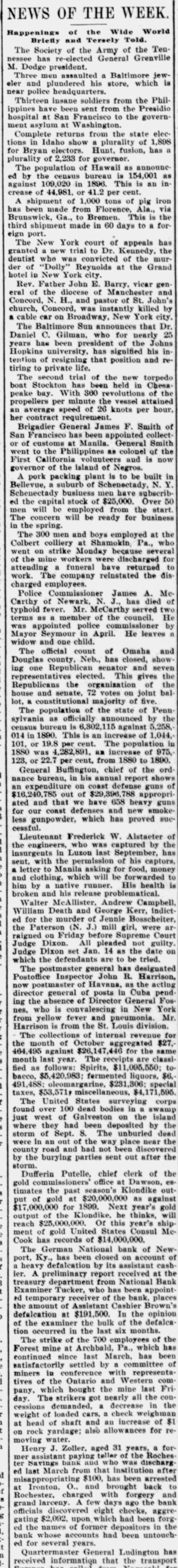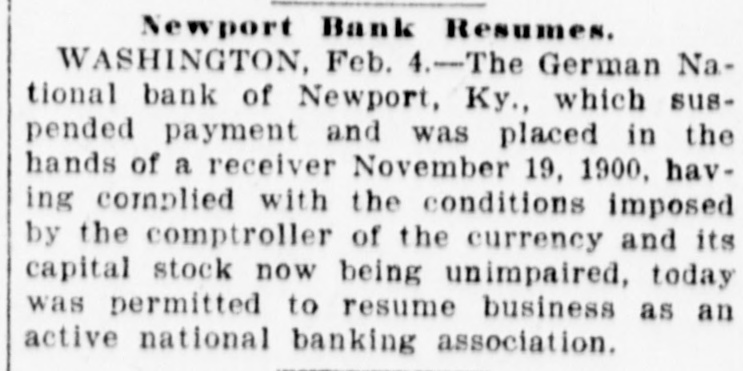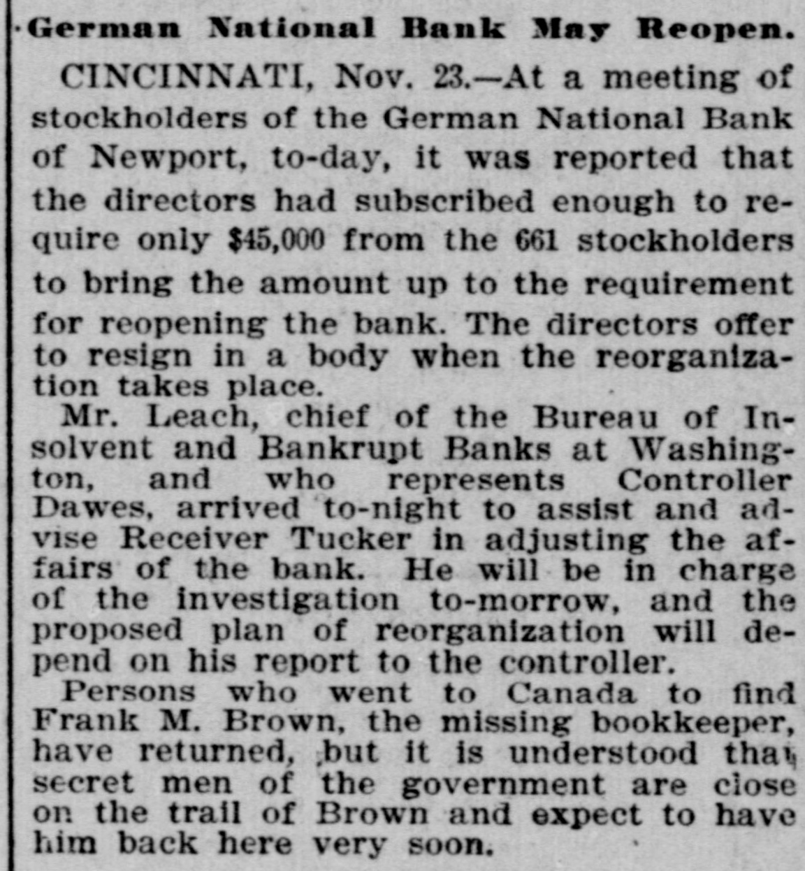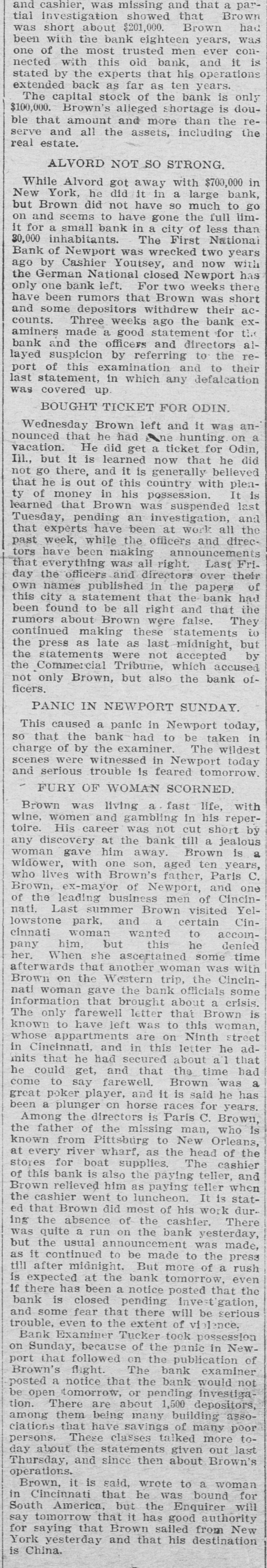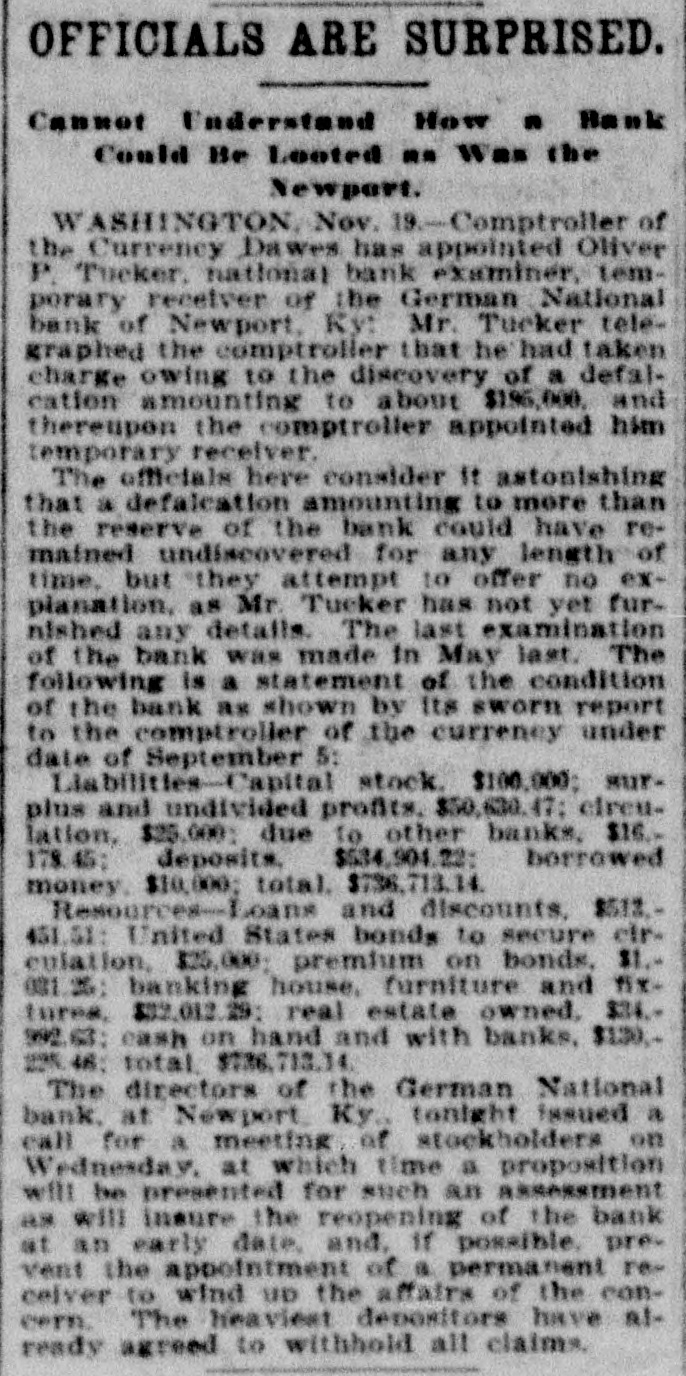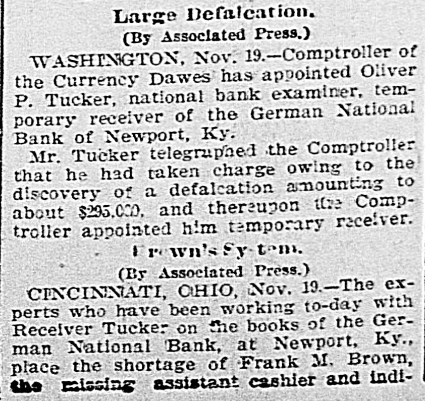 SHORT $201,000. German National Bank of Newport, Ky., Wrecked. Assistant Cashier Brown's Fast Living Said to Be Cause. MAKES HIS ESCAPE WITH PLENTY OF CASH. Cincinnati, Ohio, Nov. 18.-United States Bank Examiner Tucker, today, took possession of the German National Bank at Newport, Ky., and posted a notice that the bank would remain close pending an examination Examiner Tucker also announced unofficially that Frank M. Brown, the individual bookkeeper and assistant cashier, was missing and that a partial investigation showed that Brown was short about $201,000. Brown had been with the bank 18 years, was one of the most trusted men ever connected with this old bank and it is stated by the expects that his peculations extended back as far as 10 years. The capital stock of the bank is only $100,000. Prown's alleged shortage is double that amount and more than the reserve and all the assets, including the real esstate. The First National Bank of Newport, was wrecked two years ago by Cashier Youtsey and now the German National Bank closed. Newport has only one bank left. For two weeks there have been rumors that Brown was short, and some depositors withdrew their accounts. Three weeks ago, the bank examiners made a good statement for the bank and the officers and directors allayed suspicion by referring to the