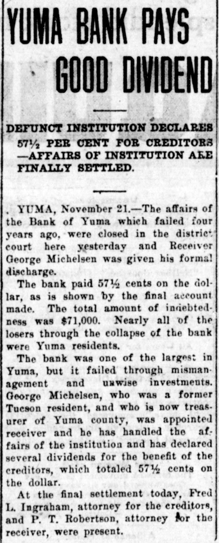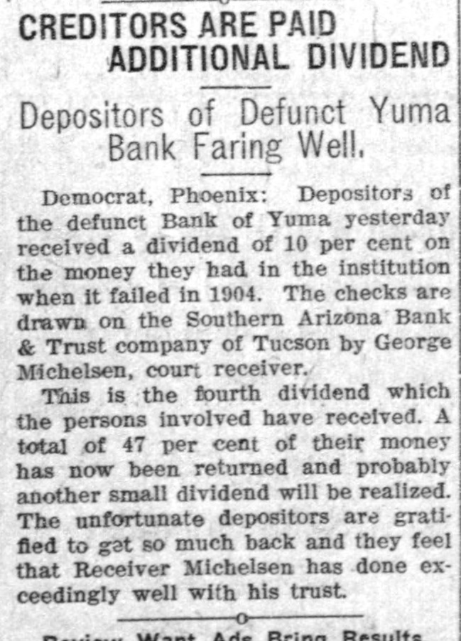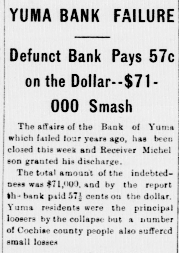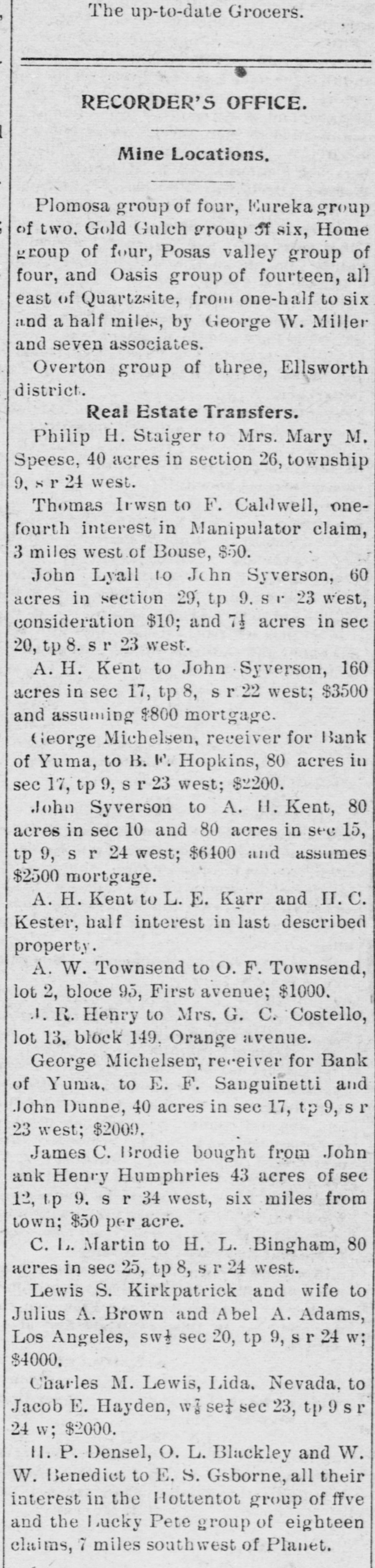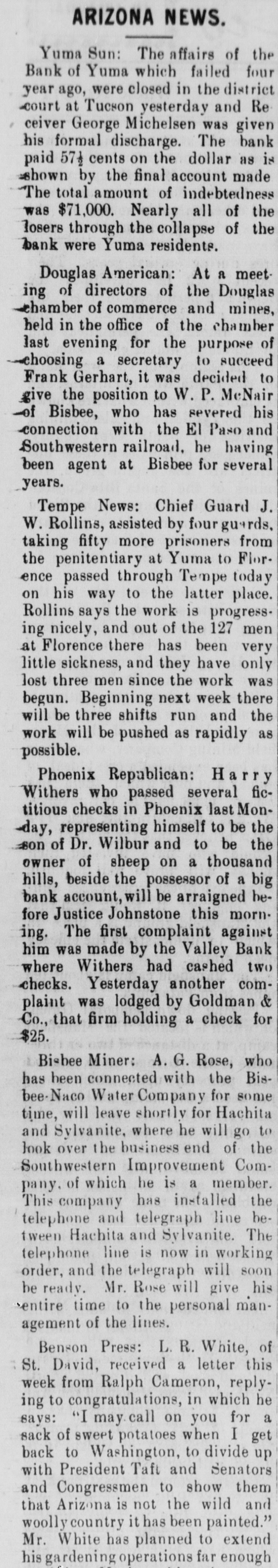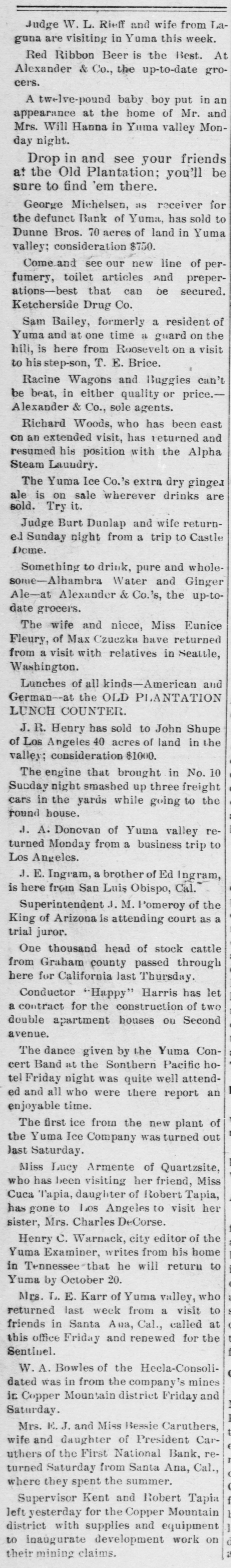 Judge W. L. Rieff and wife from Laguna are visiting in Yuma this week. Red Ribbon Beer is the Best. At Alexander & Co., the up-to-date grocers. A twelve-pound baby boy put in an appearance at the home of Mr. and Mrs. Will Hanna in Yuma valley Monday night. Drop in and see your friends at the Old Plantation; you'll be sure to find 'em there. George Michelsen, as receiver for the defunct Bank of Yuma, has sold to Dunne Bros. 70 acres of land in Yuma valley; consideration $750. Come.and see our new line of perand fumery, toilet articles preperations-best that can be secured. Ketcherside Drug Co. Sam Bailey, formerly a resident of at one time a on the visit hili, Yuma is and here from Roosevelt guard on a to his step-son, T. E. Brice. Racine Wagons and Buggies can't be beat, in either quality or price.Alexander & Co., sole agents. Richard Woods, who has been east on an extended visit, has returned and resumed his position with the Alpha Steam Laundry. The Yuma Ice Co.'s extra dry ginger ale is on sale wherever drinks are sold. Try it. Judge Burt Dunlap and wife returned Sunday night from a trip to Castle Deme. Something to drink, pure and wholesome-Albambra Water and Ginger Ale-at Alexander & Co.'s, the up-todate grocers. The wife and niece, Miss Eunice Fleury, of Max Czuezka have returned from a visit with relatives in Seattle, Washington. Lunches of all kinds-American and German--at the OLD PLANTATION LUNCH COUNTER. J. R. Henry has sold to John Shupe of Los Angeles 40 acres of land in the valley; consideration $1000. The engine that brought in No. 10 smashed three Sunday night up freight cars in the yards while going to the round house. J. A. Donovan of Yuma valley returned Monday from a business trip to Los Angeles. J. E. Ingram, a brother of Ed Ingram, is here from San Luis Obispo, Cal. Superintendent J. M. Pomeroy of the King of Arizona is attending court as a trial juror. One thousand head of stock cattle county through last from here for Graham California passed Thursday. Conductor "Happy" Harris has let a contract for the construction of two double apartment houses on Second avenue. The dance given by the Yuma Concert Band at the Sonthern Pacific hotel Friday night was quite well attended and all who were there report an enjoyable time. The first ice from the new plant of the Yuma Ice Company was turned out last Saturday. Miss Lucy Armente of Quartzsite, who her Miss of Robert Cuca has Tapia, been daughter visiting friend, Tapia, has gone to Los Angeles to visit her sister, Mrs. Charles DeCorse. Henry C. Warnack, city editor of the Yuma Examiner, writes from his home in Tennessee that he will return to Yuma by October 20. Mrs. T. E. Karr of Yuma valley, who returned last week from a visit to friends in Santa Ana, Cal., called at this office Friday and renewed for the Sentinel. W.A. Bowles of the Hecla-Consolidated was in from the company's mines in Copper Mountain district Friday and Saturday. Mrs. E.J. and Miss Bessie Caruthers, wife and daughter of President Caruthers of the First National Bank, returned Saturday from Santa Ana, Cal., where they spent the summer. Supervisor Kent and Robert Tapia left yesterday for the Copper Mountain 1 district with supplies and equipment d to inaugurate development work on a their mining claims.