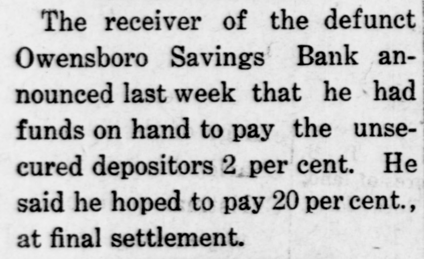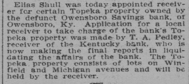Elias Shull was today appointed receiver for certain Topeka property owned by the defunct Owensboro Savings bank, of Owensboro, Ky. Application for a local receiver to take charge of the bank's Topeka property was made- by T. A. Pedley, receiver of the Kentucky bank, who is now making the final reports in liquidating the affairs of the bank. The Topeka. property consists of lots on Winfield and Michigan avenues and will be held by the receiver.