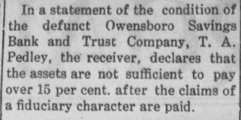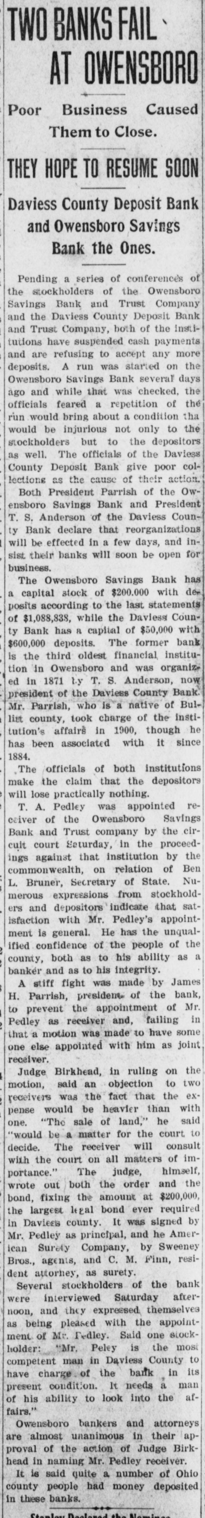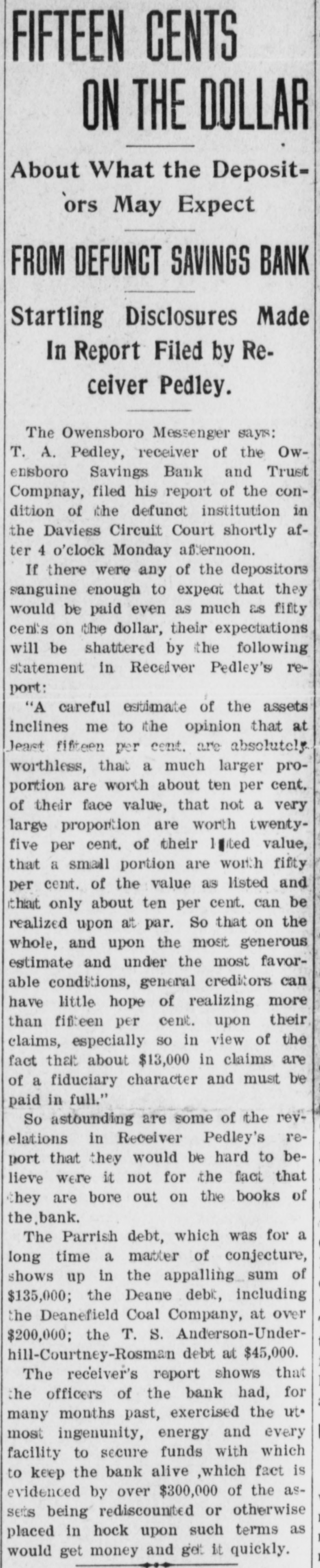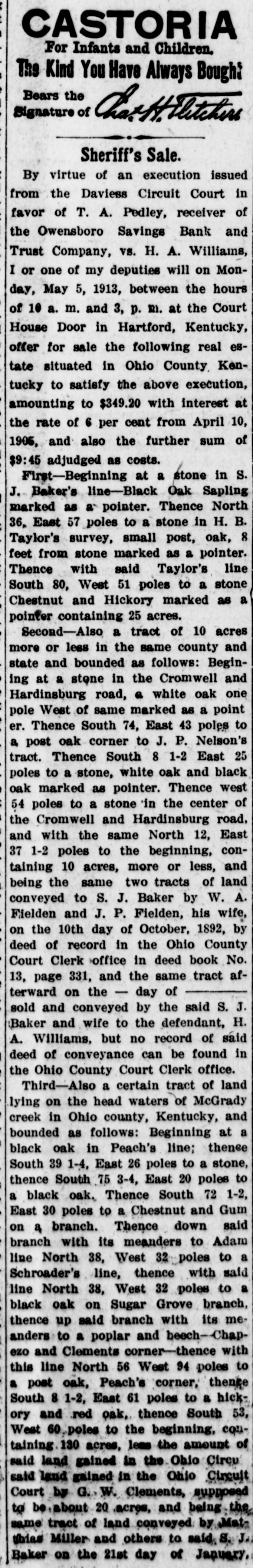 By virtue of an execution issued from the Daviess Circuit Court in favor of T. A. Pedley, receiver of the Owensboro Savings Bank and Trust Company, vs. H. A. Williams, I or one of my deputies will on Monday, May 5, 1913, between the hours of 10 a. m. and 3, p. m. at the Court House Door in Hartford, Kentucky, offer for sale the following real estate situated in Ohio County, Kentucky to satisfy the above execution, amounting to $349.20 with interest at the rate of 6 per cent from April 10, 1905, and also the further sum of $9:45 adjudged as costs.