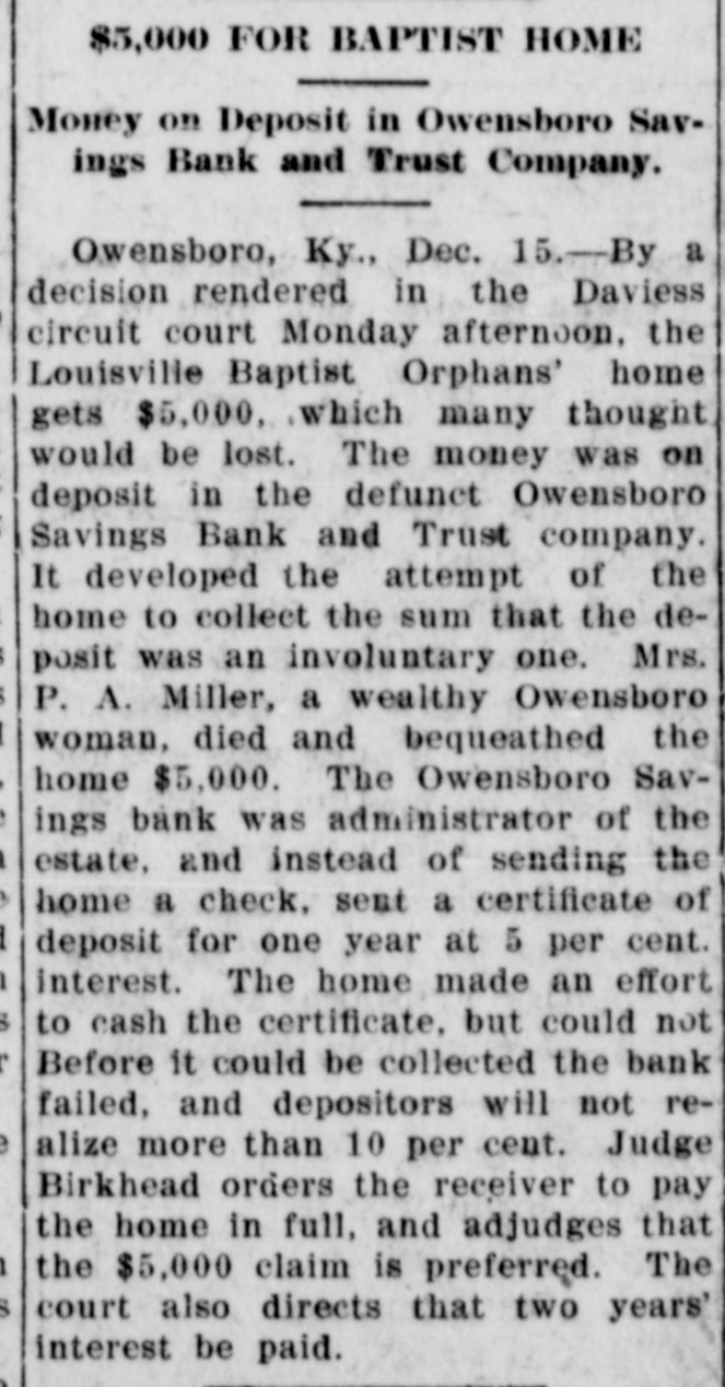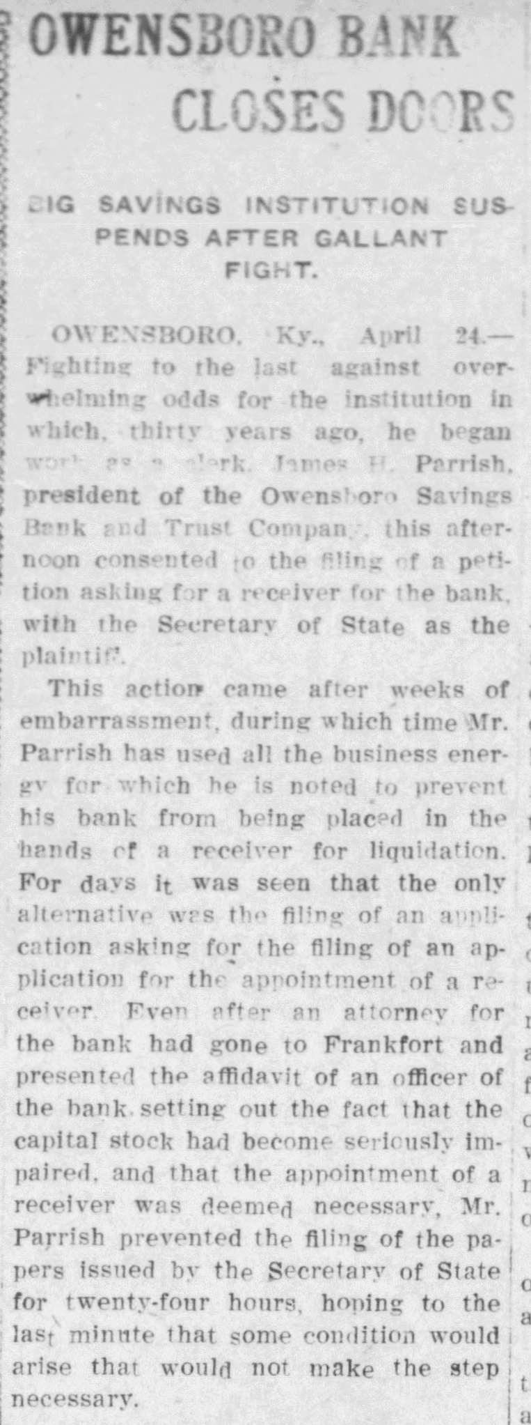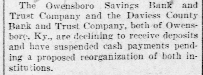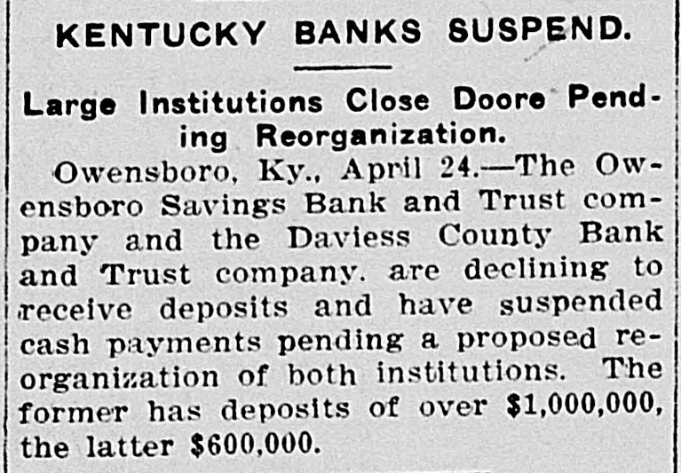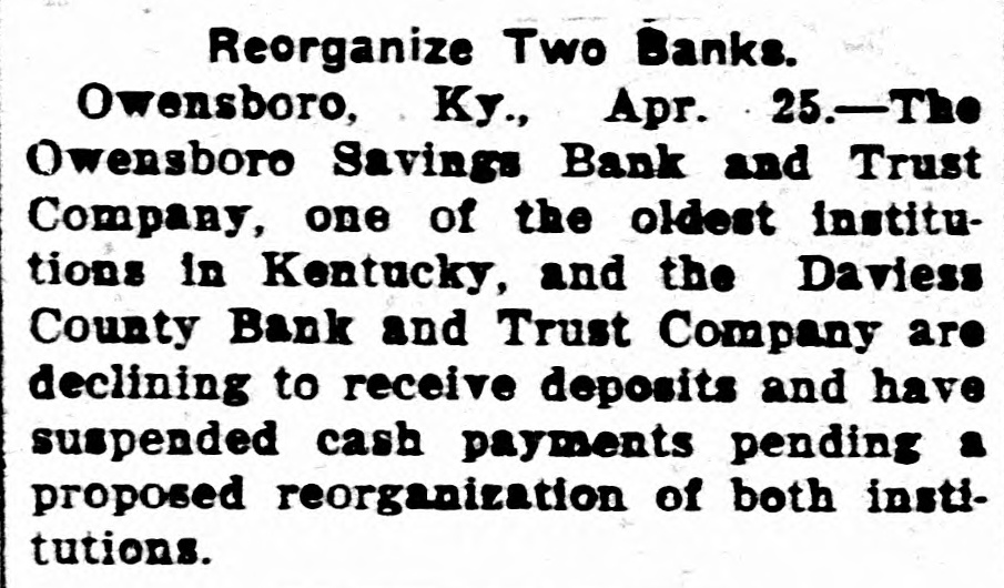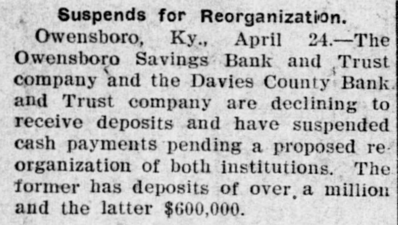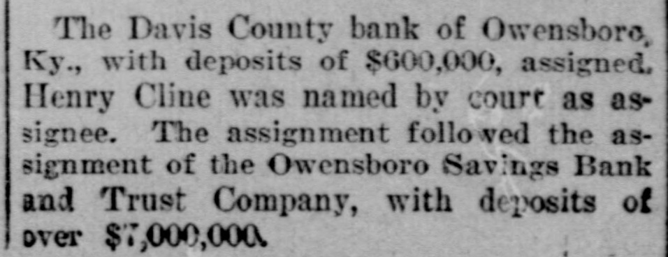 By virtue of an execution issued from the Daviess Circuit Court in favor of T. A. Pedley, receiver of the Owensboro Savings Bank and Trust Company, vs. H. A. Williams, I or one of my deputies will on Monday, May 5, 1913, between the hours of 10 a. m. and 3, p. m. at the Court House Door in Hartford, Kentucky, offer for sale the following real estate situated in Ohio County, Kentucky to satisfy the above execution, amounting to $349.20 with interest at the rate of 6 per cent from April 10, 1905, and also the further sum of $9:45 adjudged as costs.