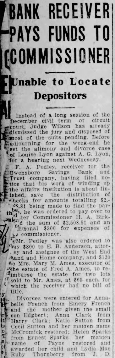 BANK RECEIVER PAYS FUNDS TO Unable to Locate Depositors Instead of a long session of the December civil term of circuit court, Judge Wilson has already dismissed the jury and disposed of most of the suits pending. Before adjourning for the week-end he set the alimony and divorce case of Louise Lyon against A. G. Lyon, for a hearing next Wednescay A. Pedley, receiver for the :Owensboro Savings Bank and Trust company, having filed notice that work of winding up the affairs institution is about finished, save the distribution of checks for amounts totalling $2. 98.81 being made to find the parhe was ordered to pay over to ter Commissioner H. Birkthe sum of $2,508.81 and an "litional $300 for expenses commissioner. sMr. Pedley was also ordered to way $800 to E. B. Anderson, attorey and assignee of the West End eand and Home company. and $130 ao Mrs. Mary M. Ames. executor of 'the estate of Fred A. Ames, to re"imburse the estate for two lots "sold to Mr. Ames, at $65 each. for which the receiver had no bill of title. Divorces were entered for Annabelle French from Emery French and the mother given the small son Edgbert Anna Clark from Harry Clark: Katie Sutton from Cecil Sutton and her maiden name McCromick Helen Sparks from Ernest Sparks her maiden name Payne restored and awarded her child and Lydia Mae Ruby Thornberry from D