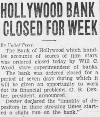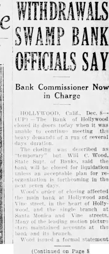 The Bank of Hollywood ... was ordered closed today by Will C. Wood, state banking commissioner. The bank was ordered closed for period of seven days