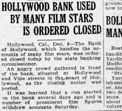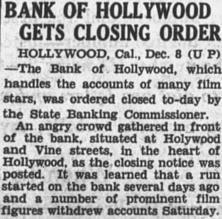 Hollywood, Cal., Dec. 8-The Bank of Hollywood, which handles the acfilm stars, was order counts many ed closed today by the state banking commissioner. An angry crowd gathered in front reading the bank, situated at and Vine streets in Holthe closing notice was lywood, as and posted. learned that run started several days ago and number prominent film figures about withdrew accounts Saturday.