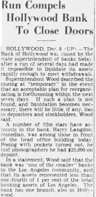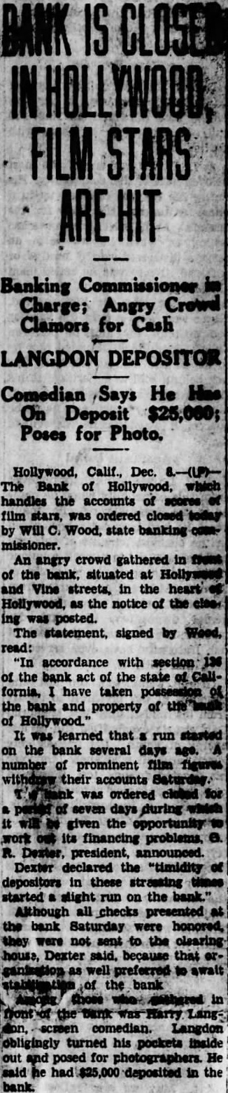 Hollywood, Calif., Dec. The Bank of Hollywood, which handles the accounts of scores film stars, was ordered closed today c. Wood, state banking An angry crowd gathered in them of the bank. situated at and Vine streets, in the heart Hollywood, as the notice of the class ing was posted. The statement, signed by Wood, read: "In accordance with section of the bank act of the state of Callfornia, have taken possession the bank and property of Hollywood.' It was learned that run started on the bank several days age. number of prominent film figures withdraw their accounts Saturday was ordered for of seven days during be given the opportunity work out its financing problems, R. Dexter, president, announced. Dexter declared the "timidity depositors in these times started slight run on the Although all checks presented the bank Saturday were they were sent to the clearing house, Dexter said, because that well preferred to await the bank those screen comedian. Langdon obligingly turned his pockets out and posed for He said he deposited in the bank.