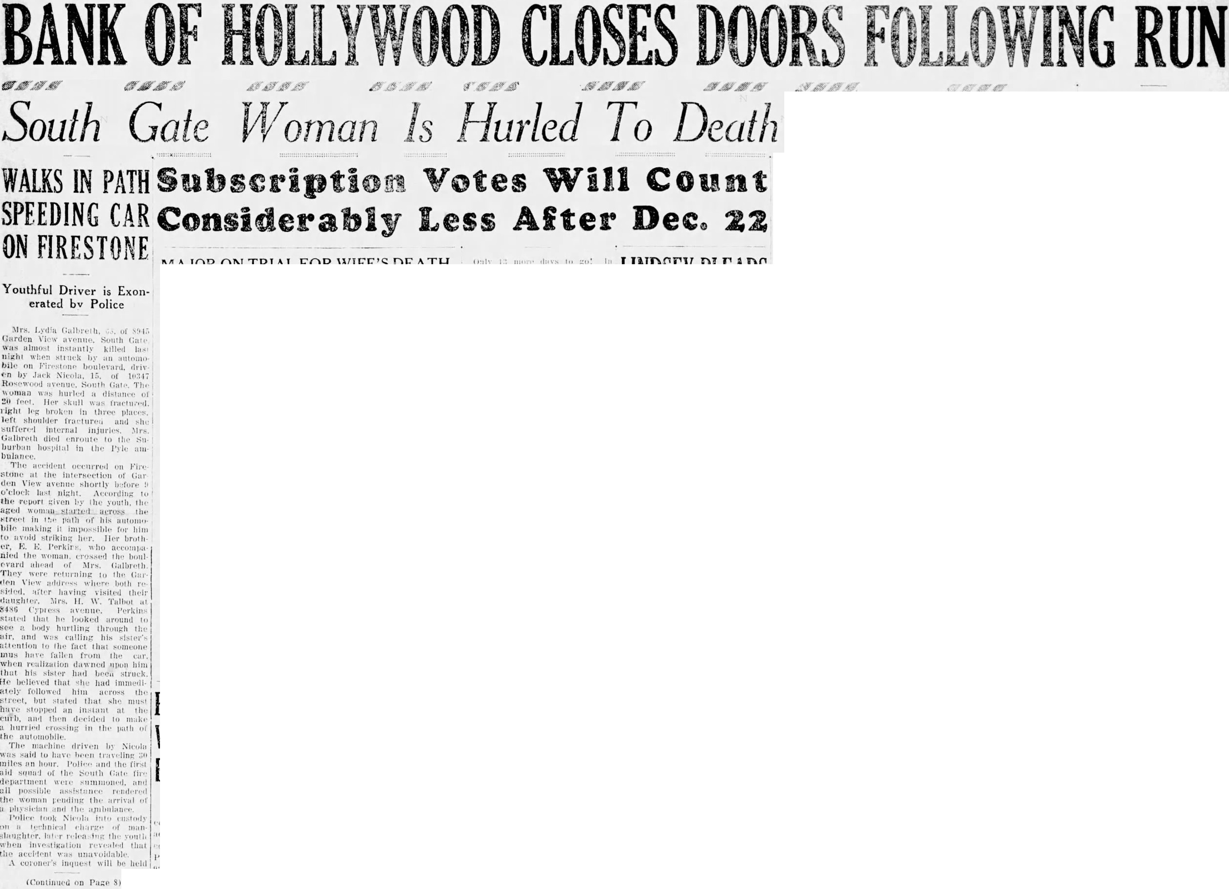 Mrs. Lydia Galbreth. GS. of 8945 Garden View avenue, South Gate was almost instantly killed last night when struck by an automo bile on Firestone boulevard. driv en by Jack Nicola, 15. of 10347 Rosewood avenue. South Gate. The woman was hurled distance of 20 feet. Her skull was fractured right leg broken in three places. left shoulder fractured and she suffered internal injuries. Mrs. Galbreth died enroute to the Su burban hospital in the Pyle am The accident occurred on Fire stone at the intersection of Gar den View avenue shortly before o'clock last night. According to the report given by the youth. the aged woman_started across the street in the path of his automo bile making it impossible for him to avoid striking her. Her broth er. E. E. Perkins, who accompa nied the woman. crossed the boul evard ahead of Mrs. Galbreth They were returning to the Gar den View address where both re sided. after having visited their daughter. Mrs. H. W. Talbot at 8486 Cypress avenue. Perkins stated that he looked around to see body hurtling through the air. and was calling his sister's attention to the fact that someone mus have fallen from the car. when realization dawned upon him that his sister had been struck. He believed that she had immediately followed him across the street, but stated that she must have stopped an instant at the curb. and then decided to make a hurried crossing in the path of the The machine driven by Nicola was said to have been traveling 30 miles an hour. Police and the first aid squad of the South Gate fire department were summoned. and all possible assistance rendered the woman pending the arrival of a physician and the apubulance Police took Nicola into custody on technical charge of manslaughter. later the youth when investigation revealed that the accident was unavoidable A coroner's inquest will be held