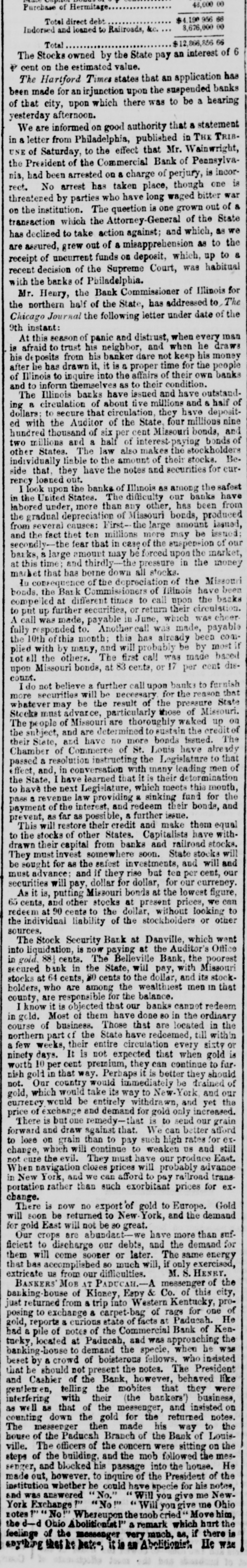 00 000'84 Purchase of Hermitage. 99 996 061 Total direct debt 00 000'949'8 Indorsed and loaned to Railroads, &c. 99 [W10] The Stocks owned by the State pay an interest of 6 + cent on the estimated value. The Hartford Times states that an application has been made for an injunction upon the suspended banks of that city, upon which there was to be a hearing yesterday afternoon. We are informed on good authority that a statement in a letter from Philadelphia, published in THE TRIBUNE of Saturday, to the effect that Mr. Wainwright, the President of the Commercial Bank of Pennsylvania, had been arrested on & charge of perjury, is incorrect. No arrest has taken place, though one is threatened by parties who have long waged bitter war on the institution. The question is one grown out of & transaction which the Attorney-General of the State has declined to take action against; and which, as we are assured, grew out of a misapprehension as to the receipt of uncurrent funds on deposit, which, up to & recent decision of the Supreme Court, was habitual with the banks of Philadelphia. Mr. Henry, the Bank Commissioner of Illinois for the northern half of the State, has addressed to, The Chicago Journal the following letter under date of the instant: 426 At this season of panic and distrust, when every man is afraid to trust his neighbor, and when he draws his de posits from his banker dare not keep his money after he has drawn it, it is a proper time for the people of Illinois to inquire into the affairs of their own banks and to inform themselves as to their condition. The Illinois banks have issued and have outstandjo JIEY 9 pus every mooth Jo B But dollars: to secure that circulation, they have deposited with the Auditor of the State, four millions nine hundred thousand of six per cent Missouri bonds, and two millions and a half of interest-paying bonds of other States. The law also makes the stockholders individually liable to the amount of their stocks. Beside that. they have the notes and securities for currency loaned out. I look upon the banks of Illinois as among the safest in the United States. The difficulty our banks have labored under, more than any other, has been from the gradual depreciation of Missouri bonds, produced "penser qunour and the fact thet ten millions more may be issued: secondly-the fear that in case of the suspension of our banks, 8 large amount may be forced upon the market, Aenour em u! pressure pus sign 18 STOOLS 118 пмор bonee has 1891 meals In consequence of the depreciation of the Missouri bonds, the Bar Commissioners of Illinois have been compelled at different times to call upon the backs to put up further securities, or return their circulation. above SUM 4014M 'aunf III perable 'epear SUM call V fully responded to. Another call was made, payable the 10th ofthis month; this has already been comII 1sour Aq 09 II!M pus 'Xueur &q mith paid Lot all the others. The first call was made based upon Missouri bonds, at 83 cents, or 17 per cent dis"yrnoo do not believe a further call upon banks to furnish more securities will be necessary for the reason that whatever may be the result of the pressure State Stocks must advarce, particularly those of Missouri. The people of Missouri are thoroughly waked up on the subject, and are determined to sustain the credit of our 'penssi spuoq erout ou have pus State their Speeds easy 78 Jo Commentee Jo passed a resolution instructing the Legislature to that effect, and, in conversation with many leading men of the State, I have learned that it is their determination to have the next Legislature, which meets this month, pass a revenue law providing a sinking fund for the pue 'spuoq them reperm pus the JO payment 'enset further B dessible se JUJ SB This will restore their credit and make them equal to the stocks of other States. Capitalists have withdrawn their capital from banks and railroad stocks. They must invest somewhere soon. State stocks will be sought for as the safest investments, and will and must advance: and if they rise but ten per cent, our securities will pay, dollar for dollar, for our currency. As it is, putting Missouri bonds at the lowest figure, 65 cents, and other stocks at present prices, we can 04 Burgoof mouth 'Jenop the 01 centre 06 18 redeem 10 em 10 the sources. The Stock Security Bank at Danville, which went into liquidation, is now paying at the Auditor's Office in gold, 881 cents. The Belleville Bank, the poorest secured bank in the State, will pay, with Missouri 811 pus 'IPNOP the 01 cents 08 cents, 19 78 stocks the ui new the Suous 929 OUM county, are responsible for the balance. I know it is objected that our banks cannot redeem in gold. Most of them have done 80 in the ordinary course of business. Those that are located in the northern part of the State have redeemed, till within a few weeks, their entire circulation every sixty or ninety days. It is not expected that when gold is worth 10 per cent premium, they can continue to far. nish gold in that way. Perhaps it is better they should go eq prom Country "O" "100 gold, which would take its way to New. York and our currency would be entirely withdrawn, and yet the price of exchange and demand for gold only increased. unable mo 02 ST эпо mq To proge better use in That Map pus PIEMIOJ -XO 10; Tates 4214 gons And 01 than upong uo [ 01 11138 pus so medical 02 enumue IIIM your change not cure the evil. They must have our produce East. When navigation closes prices will probably advance in New York, and we can afford to pay railroad trans portation rather than such exorbitant prices for exchange. There is now no export 'of gold to Europe. Gold will SOOR be returned to New York, and the demand great 08 99 you IIIM 19"H pios 10J Our crops are abundact-we have more than sufJOJ pusmep em puu debts, Juo discharge 01 them will come sooner or later. The same energy that bas accomplished 80 much will, if only exercised, HEREY 'S "If mo moy sn extreste BANKER