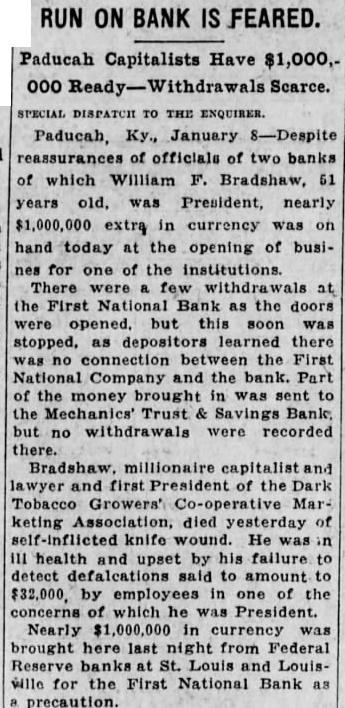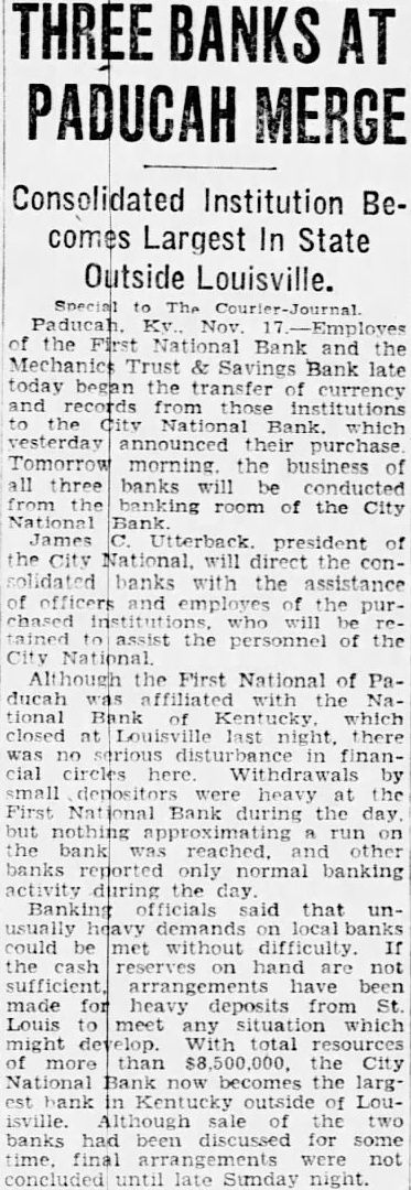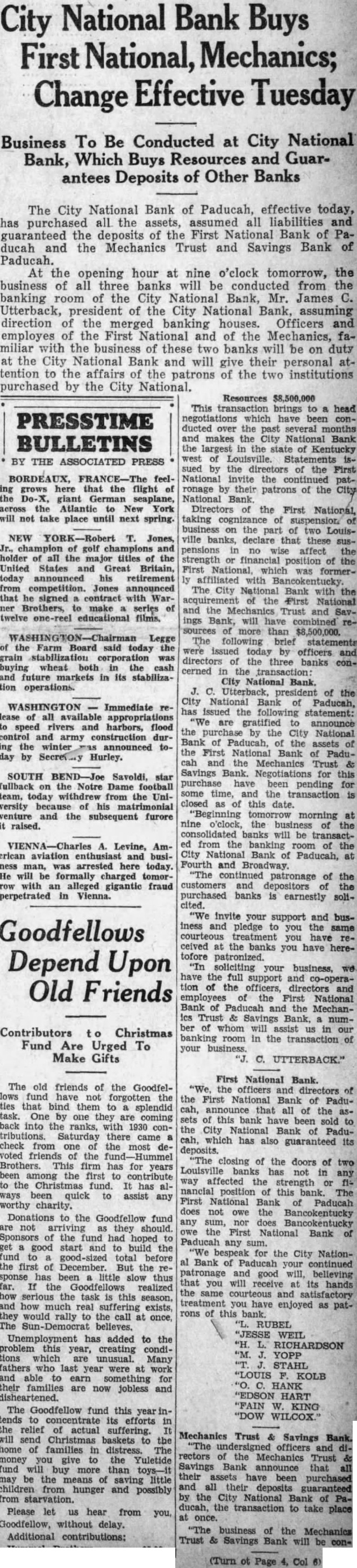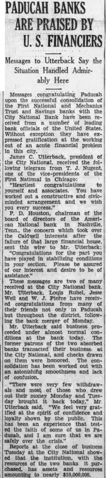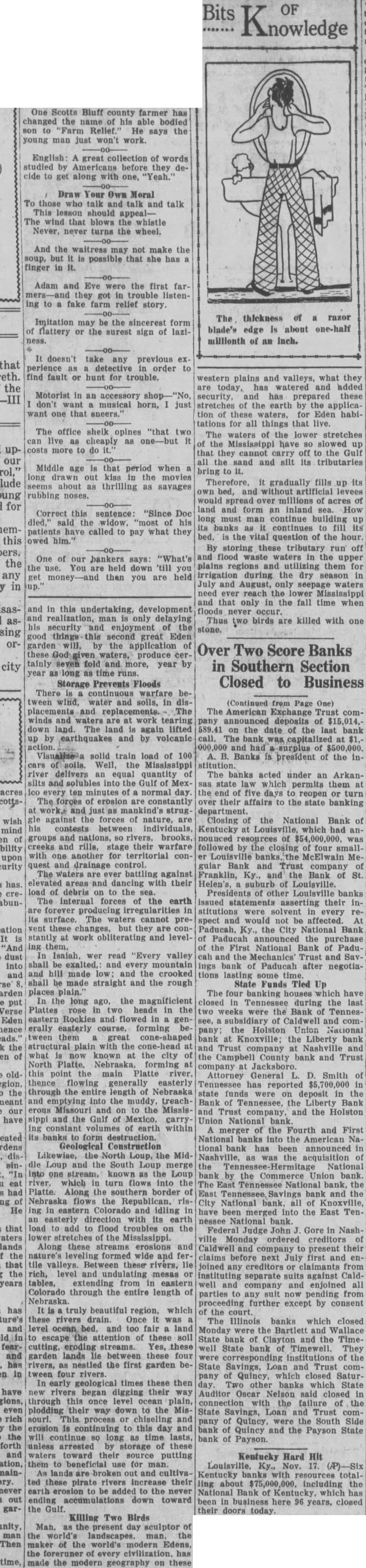 One our bankers says: "What's You are held down 'till then you are held western plains and valleys, what they today, has watered added security, and has prepared these stretches the earth by the application these waters, for Eden habitations for all things that live. The waters of the lower stretches the Mississippi have 80 slowed up that they cannot carry off the Gulf the sand and silt its tributaries bring to gradually fills up its bed, and without levees over of acres land and form inland sea. How must man continue banks continues fill the vital question the hour. By storing these tributary run off flood waste waters in the upper plains regions utilizing them for irrigation during the dry season in and August, only seepage waters need ever reach the lower Mississippi that only in the fall time when in this undertaking, development floods never occur. realization, man only delaying Thus two birds are killed with one security enjoyment of stone. good second great Eden garden will, by the application Over Score Banks waters, produce seven fold and more, year by in Southern Section year as long as time runs. Closed to Business Storage Prevents Floods There continuous warfare bewind, water and in (Continued from Page One) placements and The The American Exchange Trust waters are at work tearing announced deposits of land. The land again lifted the date of the bank earthquakes and by volcanie call. bank capitalized of solid train load of 100 Banks president of the Well, the Mississippi stitution. delivers equal quantity The banks acted under an Arkansilts and solubles into the Gulf of Mex- state permits them every ten minutes normal day of five days reopen or turn The forces of erosion are constantly their affairs to the state banking work. and mankind's strug- department. against the forces of nature, Closing of the National Bank of contests between individuals, Kentucky which had angroups and nations, rivers, brooks, nounced resources creeks and rills, stage their warfare followed closing of four smallwith one another for territorial Louisville quest and drainage control. guiar Bank Trust company The waters are ever battling against Franklin, and the Bank of and dancing with their Helen's, suburb of Louisville. load of debris on the Presidents of other Louisville banks The internal forces of the earth issued asserting their inforever producing stitutions were solvent in every The cannot spect and would not affected. At vent these changes, but they are Paducah, Ky., the City National Bank stantly at work obliterating and level- Paducah the them. the First National Bank PaduIn Isaiah, wer read "Every valley and the Mechanics' Trust and shall be and every mountain bank Paducah after negotiaand made and the crooked tions lasting some time. shall made straight and the rough State Funds Tied Up The four banking which have In the long ago, the magnificient closed Tennessee during the last Plattes rose heads in the weeks the Bank TennesRockies and flowed in subsidiary of and comerally easterly course, forming the Holston Union tween them great bank the Liberty bank structural plain with the Trust and company what known at the city Campbell County bank and Trust North Platte. Nebraska, forming company this point the main Platte river. Attorney General Smith thence flowing generally easterly has reported through the entire length of Nebraska in the funds were deposit emptying into the muddy, treach- Bank Bank Tennessee, the Missouri and the Missis- Trust and the Holston and the Gulf of carry- Union of earth within of the Fourth and First banks form destruction. National banks into the American Na Construction tional been announced Likewise, North Loup, the Midas was the acquisition Loup and the South Loup the one stream. known the Loup bank by the Commerce Union bank. which turn flows into East National bank, the Platte. Along border East Tennessee Savings bank and the flows the of City National eastern Colorado and idling in have been merged into the East Tenwith its earth National bank. nessee load to flood troubles the John Gore in NashJudge stretches the Mississippi. Monday ordered creditors Along these streams erosions Caldwell and company present their formed wide and claims before next July first and valleys. these rivers, lie joined creditors claimants from rich, level and or instituting separate suits against Caldtables, extending from eastern and company and enjoined all Colorado through the entire length parties any now pending from Nebraska. proceeding further except by consent truly beautiful region, which the these rivers drain. Once The Illinois banks which closed level ocean and too fair land Monday were the Bartlett and escape the attention of these soil State bank Clayton and the Timecutting, eroding streams. Yes, these State bank Timewell. They garden lands between these four corresponding institutions the nestled the first garden beState Savings, Loan Trust comfour rivers. pany Quincy, which closed In early geological times these then Two other banks which State rivers began digging their way Auditor Oscar Nelson said closed through this once level ocean plain, connection the failure of the plodding their way down to the MisState Loan and Trust This process chiseling and pany Quincy, were the South Side is continuing to this day and of Quincy and the Payson State continue long time lasts, bank Payson. unless arrested by storage these waters toward their source putting Kentucky Hard Hit them to beneficial for Louisville, As lands broken out and cultivaKentucky banks with totalthese pirate rivers increase their ling about including the erosion be added to the never National Bank of which ending accumulations down toward been business here 96 years, closed the Gulf. their doors