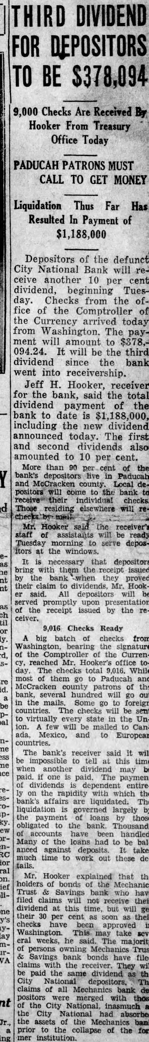 THIRD DIVIDEND FOR DEPOSITORS TO BE $378,094 9,000 Checks Are Received By Hooker From Treasury Office Today PADUCAH PATRONS MUST CALL TO GET MONEY Liquidation Thus Far Has Resulted In Payment of $1,188,000 Depositors of the defunct City National Bank will receive another 10 per cent dividend. beginning Tuesday. Checks from the office of the Comptroller of the Currency arrived today from Washington. The payment will amount to $378,094.24. It will be the third dividend since the bank went into receivership. Jeff H. Hooker, receiver for the bank, said the total dividend payment of the bank to date is $1,188,000, including the new dividend announced today. The first and second dividends also amounted to 10 per cent. More than 90 per cent of the bank's depositors live in Paducah and McCracken county. Local positors will come to the bank to individual checks. Those residing elsewhere will Mr. Hooker said the receiver's staff of assistants will be ready Tuesday to serve depositors at the windows. It necessary that depositors bring with them receipt issued by bank -when they proved their claim to dividends, Mr. Hooker said. All depositors will be served promptly upon presentation of the receipt issued by the receiver. 9,016 Checks Ready A big batch of checks from bearing the signature of the of the Currency, reached Mr. office today. The checks total 9,016. While most of them go to Paducah and patrons of the bank, several will go out in the mails. Some go to foreign countries. The checks will be to virtually every state in the Union. few will mailed Canada, Mexico, and to European countries. The bank's receiver said it will be impossible to tell this time when another dividend may be paid. one is paid. The payment of dividends dependent entireon the rapidity with which the bank's affairs liquidated. The liquidation is governed largely by payment loans by those obligated to the bank. Thousands of accounts have been handled. Many of the loans had to be balanced against deposits. takes much time to work out these details. Mr. Hooker explained that the holders of bonds of the Mechanics Trust Savings bank have filed claims will not receive their dividend at this time, but will get their 30 per cent as soon their checks been approved in Washington. This take several weeks, he said. The majority of persons owning Mechanics Trust Savings bank bonds have filed claims with the receiver. They will be paid the same dividend the City National depositors. The claims of all Mechanics bank depositors were merged with those the City National, inasmuch the City National had absorbed the assets of the Mechanics bank prior to the collapse of the former institution.