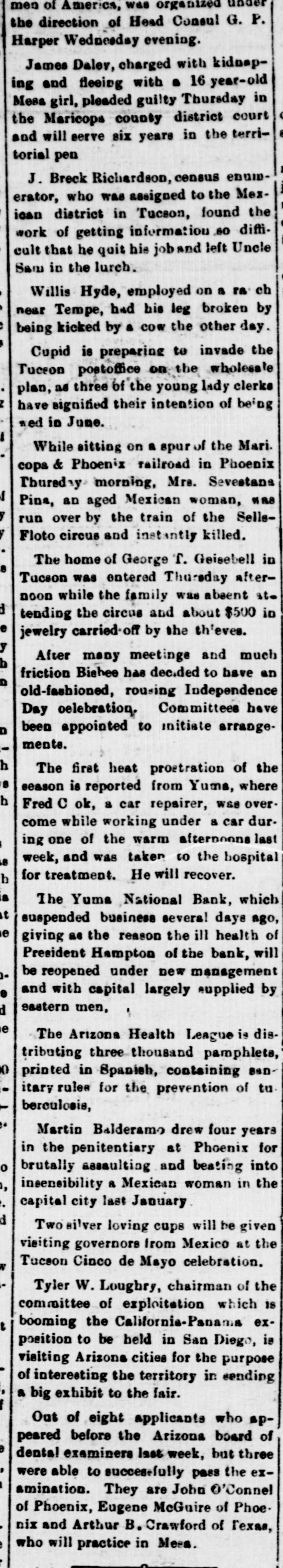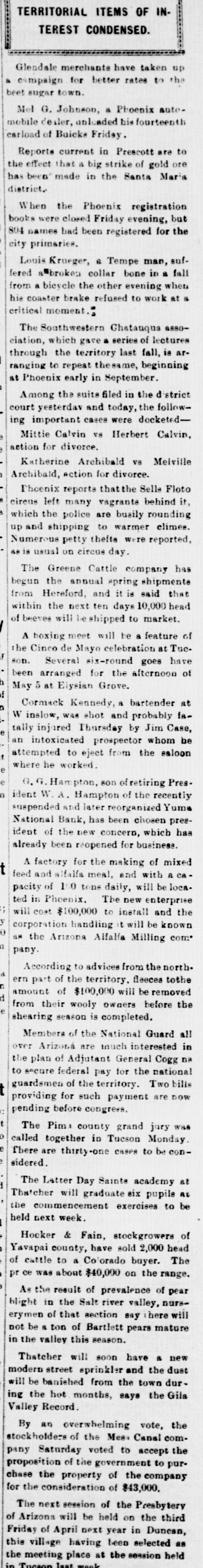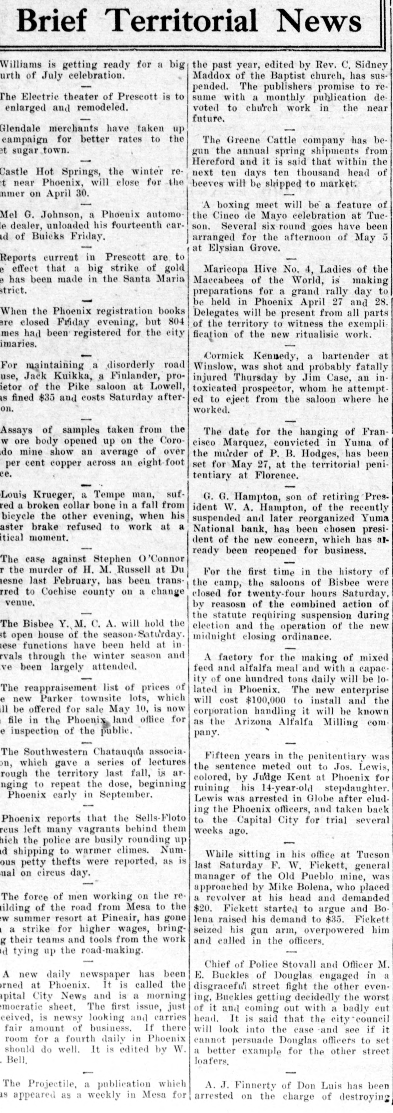 Brief Territorial News lliams is getting ready for a big the past year, edited by Rev. C. Sidney Maddox of the Baptist church, has susof July celebration. pended. The publishers promise to reElectric theater of Prescott is to sume with a monthly publication devoted to church work in the near alarged and remodeled. future. endale merchants have taken up mpaign for better rates to the The Greene Cattle company has betown. gun the annual spring shipments from Hereford and it is said that within the Hot Springs, the winter renext ten days ten thousand head of near Phoenix, will close for the beeves will be shipped to market. on April 30. A boxing meet will be a feature of G. Johnson, a Phoenix automothe Cinco de Mayo celebration at Tucdealer, unloaded his fourteenth carson. Several six round goes have been of Buicks Friday. arranged for the afternoon of May 5 at Elysian Grove. current in Prescott are to effect that a big strike of gold Maricopa Hive No. 4, Ladies of the been made in the Santa Maria Maccabees of the World, is making preparations for a grand rally day to 1 be held in Phoenix April 27 and 28. the Phoenix registration books Delegates will be present from all parts closed Friday evening, but 804 of the territory to witness the exemplification of the new ritualisic work. had been registered for the city Cormick Kennedy, a bartender at maintaining a disorderly road Winslow, was shot and probably fatally Jack Kuikka, a Finlander, proinjured Thursday by Jim Case, an inof the Pike saloon at Lowell, toxicated prospector, whom he attempt$35 and costs Saturday aftered to eject from the saloon where he worked. I of samples taken from the The date for the hanging of Franore body opened up on the Corocisco Marquez, convicted in Yuma of mine show an average of over the mu'rder of P. B. Hodges, has been cent copper across an eight foot set for May 27, at the territorial penitentiary at Florence. Krueger, a Tempe man, sufG. G. Hampton, son of retiring Presa broken collar bone in a fall from ident W. A. Hampton, of the recently the other evening, when his suspended and later reorganized Yuma brake refused to work at a National bank, has been chosen presimoment. dent of the new concern, which has already been reopened for business. case against Stephen 'Connor he murder of H. M. Russell at Du For the first time in the history of last February, has been transthe camp, the saloons of Bisbee were to Cochise county on a change closed for twenty-four hours Saturday, by reasosn of the combined action of the statute requiring suspension during Bisbee Y. M. C. A. will hold the election and the operation of the new house of the season-Saturday. midnight closing ordinance. functions have been held at in through the winter season and A factory for the making of mixed been largely attended. feed and alfalfa meal and with a capacity of one hundred tons daily will be loreappraisement list of prices of lated in Phoenix. The new enterprise new Parker townsite lots, which will cost $100,000 to install and the be offered for sale May 10, is now corporation handling it will be known in the Phoenix land office for as the Arizona Alfalfa Milling com inspection of the public. pany. Southwestern Chatauqu'a associaFifteen years in the penitentiary was which gave a series of lectures the sentence meted out to Jos. Lewis, the territory last fall, is arcolored, by Judge Kent at Phoenix for to repeat the dose, beginning ruining his 14-year-old stepdaughter. Phoenix early in September. Lewis was arrested in Globe after eluding the Phoenix officers, and taken back oenix reports that the Sells-Floto to the Capital City for trial several left many vagrants behind them weeks ago. I the police are busily rounding up shipping to warmer climes. NumWhile sitting in his office at Tueson petty thefts were reported, as is last Saturday F. W. Fickett, general on circus day. manager of the Old Pueblo mine, was approached by Mike Bolena, who placed force of men working on the rea revolver at his head and demanded of the road from Mesa to the $20. Fickett started to argue and Bosummer resort at Pineair, has gone lena raised his demand to $35. Fickett strike for higher wages, bringseized his gun arm, overpowered him their teams and tools from the work and called in the officers. I tying up the road-making. Chief of Police Stovall and Officer M. new daily newspaper has been E. Buckles of Douglas engaged in a at Phoenix. It is called the disgraceful street fight the other evenCity News and is a morning ing, Buckles getting decidedly the worst peratic sheet. The first issue, just of it and coming out with a badly cut is newsy looking and carries head. It is said that the city council amount of business. If there will look into the case and see if it for a fourth daily in Phoenix cannot persuade Douglas officers to set do well. It is edited by W. a better example for the other street loafers, Projectile, a publication which A. J. Finnerty of Don Luis has been appeared as a weekly in Mesa for arrested on the charge of destroying
