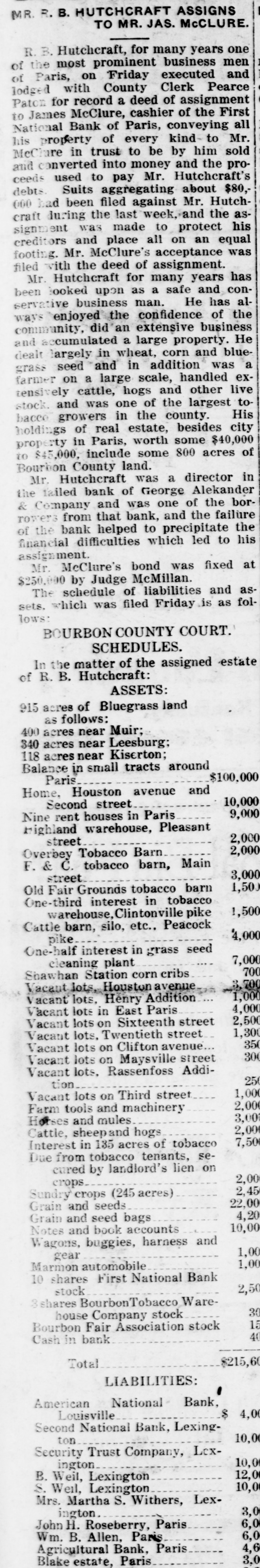 R. B. Hutchcraft, for many years one of the most prominent business men of Paris, on Friday executed and lodged with County Clerk Pearce Paton for record a deed of assignment to James McClure, cashier of the First National Bank of Paris, conveying all his property of every kind to Mr. McClure in trust to be by him sold and converted into money and the proceeds used to pay Mr. Hutchcraft's debts. Suits aggregating about $80,000 had been filed against Mr. Hutchcraft during the last week, and the assignment was made to protect his creditors and place all on an equal footing. Mr. McClure's acceptance was filed with the deed of assignment.