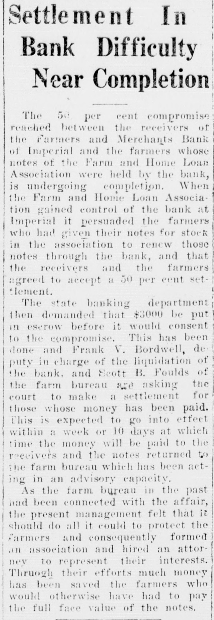 WOOD ISSUES STATEMENT ON CLOSING OF IMPERIAL BANK of repairing it. and in view of Following is a statement rethe frozen condition of the bank ceived by the Press this mornthat has continued over a period ing from Will C. Wood, state of years without appreciable imsuperintendent of banks, relaprovement, T was obliged under tive to his action in closing the the law to take over the bank Farmers and Merchants bank at and proceed toward liquidation Imperial last Monday: of the assets. "The Farmers and Merch"We shall liquidate as rapants Bank of Imperial was idly as possible and shall pav closed by me on October 10, the depositors and other cred1927, in accordance with the itors dividends from time to Bank Act which requires the time, the amount being dependsuperintendent of banks to take ent upon how much we can realpossession of the property and ize out of the assets. Until the business of any bank whenever receiver has had opportunity to he is satisfied that the capital make a careful analysis of the of any such bank is impaired or assets, it wi llbe impossible for that it is unsafe and inexpedient us to estimate what percentage to permit it to continue busiof the total deposits can be ness. paid." "The Farmers and Merchants Signed, WILL C. WOOD, Bank at Imperial was last ex"Supt. of Banks." amined by us on September 3, Inquiry conducted by the 1927. Before that date howPress among several Imperial businessmen shows that there ever, we had determined from is considerable dissatisfaction reports and conferences that the capital of the bank was impairamong them because the bank ed. Accordingly, on August 31, was permitted to open for a 1927 I levied an assessment of short period last Monday $50,000 on the stockholders of just sufficiently long to get deposits from merchants who the bank to repair the capital. had sums carried over from SatSubsequently one of the chief stockholders of the bank went furday. into voluntary bankruptey, makIn several cases, it is alleged, ing it apparent that the amount the bank's action in accepting necessary to make up the imthese deposits. seriously crippairment could not be raised. pled business by tying up funds In view of the large impairment which were to be used in payof capital and the improbability ing current debts.