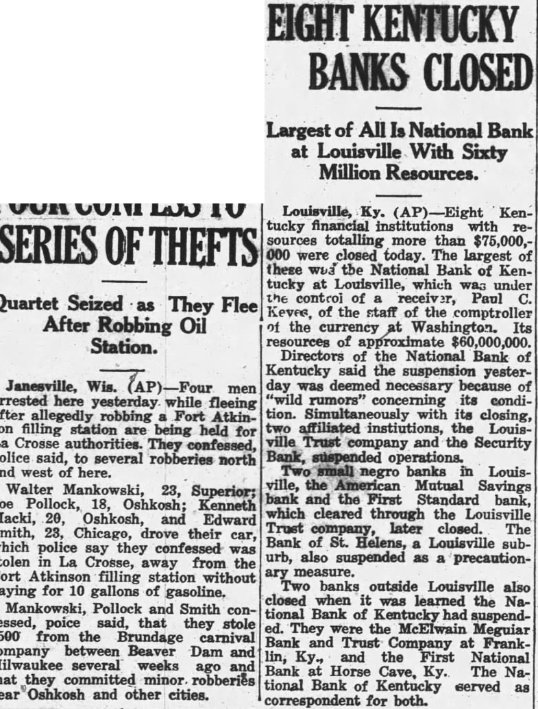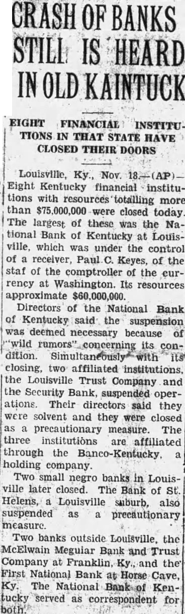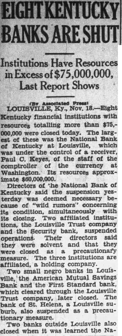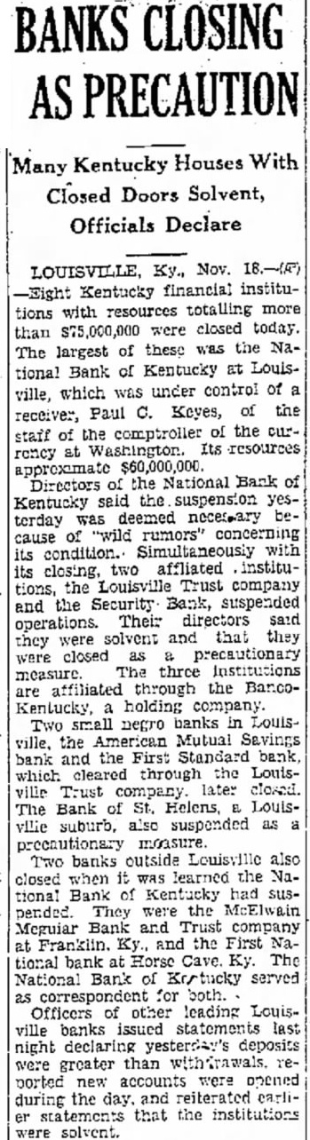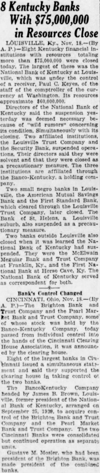 Kentucky Banks With $75,000,000 in Resources Close LOUISVILLE, Ky., Nov. Kentucky financial institutions resources totaling more than $75,000,000 were closed today. The largest of these was the National Bank Kentucky at Louisville, which under the control of receiver, Paul Keyes, of the staff of the comptroller of the currency Washington. Its resources approximate Directors of the National Bank of Kentucky the suspension yesterday necessary because of rumors" concerning its with its closing. Two affiliated institutions, the Louisville Trust Company and the Security Bank, operations. Their directors said they were solvent and that they closed as precautionary measure. The three institutions affiliated through the holding comTwo small negro banks in Louisville, the Mutual Savings Bank and the First Standard Bank, which cleared the Trust Company, later closed. The Bank of St. Helens, Louisville suburb, also suspended as precautionary Two banks Louisville also closed when learned the National Bank had suspended. They were the McElwain Megular Trust Company at Franklin, Ky. and the First National Bank Cave, Ky. The National Bank of Kentucky served as correspondent for both. Bank's Control Changed Brighton Bank and Trust Company and the Pearl MarRet Bank and Trust Company, whose was held by the Company, today passed from individual control into the hands the Clearing House Association. was announced by the clearing Eight the largest banks in Cin ment said they supported the clearing house in taking control of the two The Company headed by James B. Brown. Louisformer president of the National Bank Kentucky, arranged on September 1939, acquire control of the Brighton Bank and Trust Company and Pearl Market Bank and Trust Company The two Banks were consolidated but continued operation as separate units. Gustave M. Mosler who had been president the Brighton Bank was made president of the combined banks.
