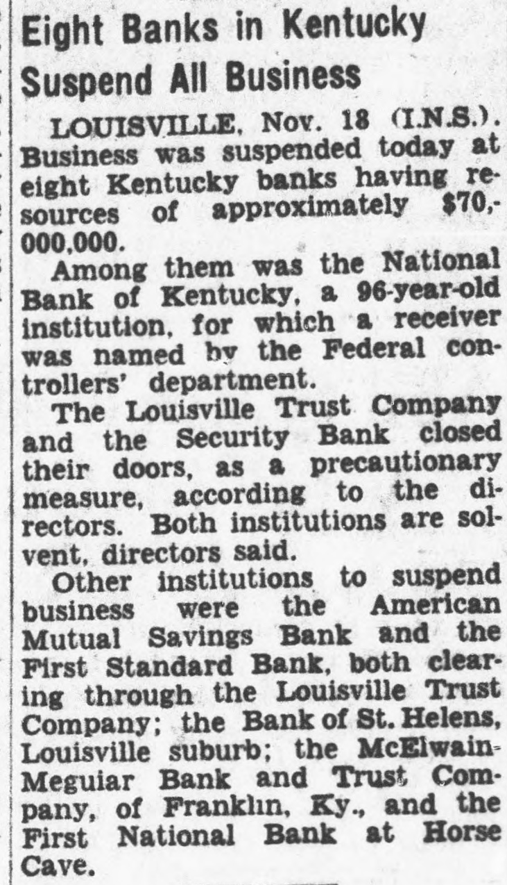 EIGHT KENTUCKY BANKS CLOSED Largest of All National Bank at Louisville With Sixty Million Resources. Louisville, Ky. Kentucky financial institutions with totalling more than $75,000,000 were closed today. The largest of these was the National Bank of Kentucky at Louisville, which was under control of Paul Keves, of the staff of the comptroller the currency Washington. Its resources of approximate Directors of the National Bank of Kentucky said the suspension yesterday was deemed necessary because of concerning its condition. with its closing, two affiliated instiutions, the LouisTrust company and the Security Bank, suspended operations. Two small negro banks in Louisville, the American Mutual Savings bank and the First Standard bank, which cleared through the Louisville Trust company, later closed. The Bank of St. Helens, Louisville suburb, also suspended as a precautionTwo banks outside Louisville closed when was learned the National Bank of suspendThey were the McElwain Meguiar Bank and Trust Company Franklin, and the First National Bank Horse Cave, Ky. The National Bank of Kentucky served correspondent for both.