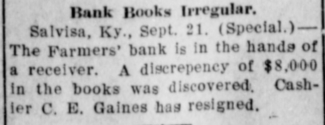 Bank Books Irregular. Salvisa, Ky., Sept. 21. (Special.)- The Farmers' bank is in the hands of a receiver. A discrepency of $8,000 in the books was discovered. Cashier C. E. Gaines has resigned. |