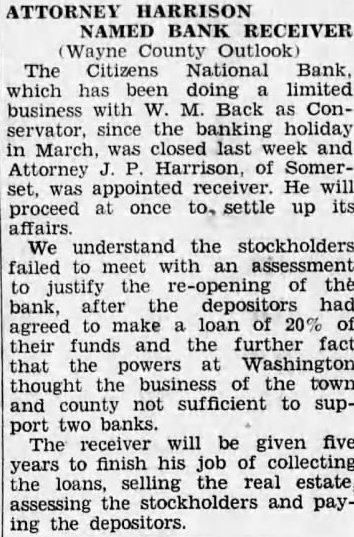 ATTORNEY HARRISON NAMED BANK RECEIVER County Outlook) The Citizens National Bank, which has been doing limited business with W. M. Back Conservator, since the holiday March, was closed week and Attorney Harrison, of Somerset, appointed receiver. He proceed once settle up its affairs. We understand the stockholders failed to meet with an assessment justify re-opening of the bank, after the depositors had agreed make loan of 20% their funds and the further fact that at Washington thought business of the town sufficient to two banks. The receiver will be given five years to finish his job collecting selling the real estate, the stockholders and assessing the depositors.