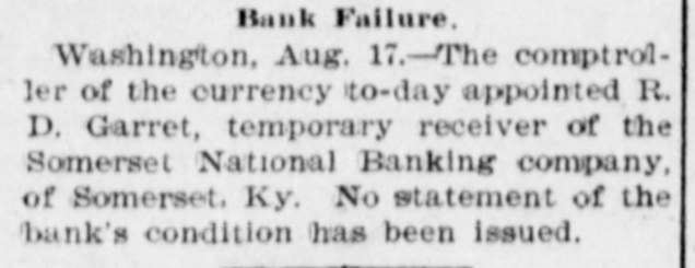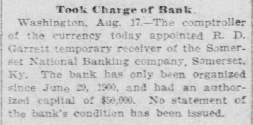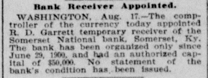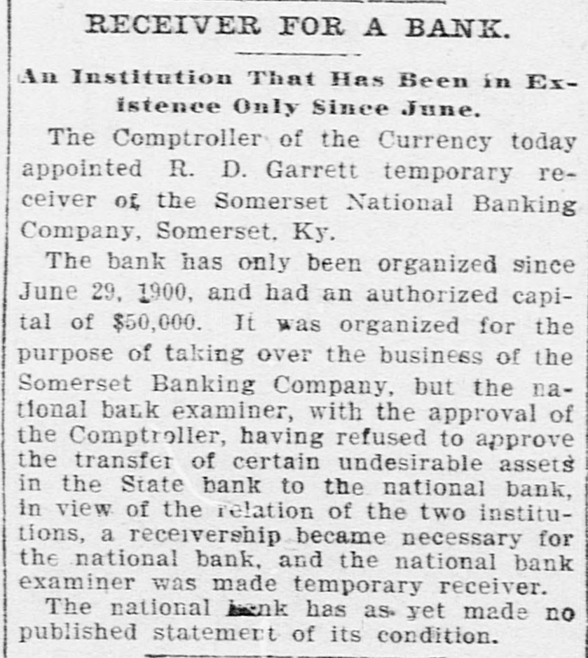 RECEIVER FOR A BANK. An Institution That Has Been in Existence Only Since June. The Comptroller of the Currency today appointed R. D. Garrett temporary receiver of the Somerset National Banking Company, Somerset, Ky. The bank has only been organized since June 29, 1900, and had an authorized capital of $50,000. It was organized for the purpose of taking over the business of the Somerset Banking Company, but the national baLk examiner, with the approval of the Comptroller, having refused to approve the transfer of certain undesirable assets in the State bank to the national bank, in view of the relation of the two institutions, a receivership became necessary for the national bank, and the national bank examiner was made temporary receiver. The national bank has as- yet made no published statement of its condition.