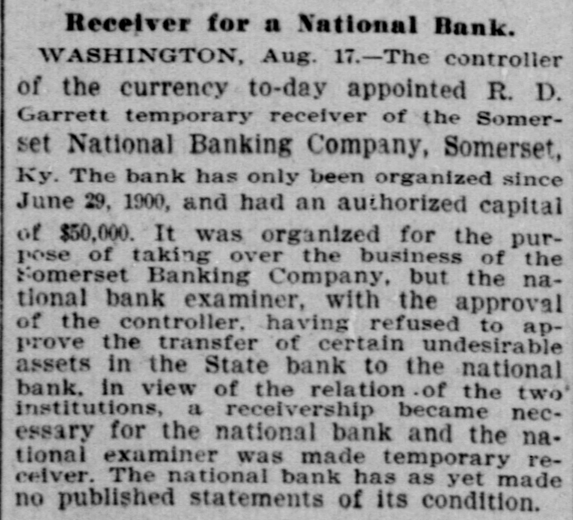 Receiver for a National Bank. WASHINGTON, Aug. 17.-The controller of the currency to-day appointed R. D. Garrett temporary receiver of the Somerset National Banking Company, Somerset, Ky. The bank has only been organized since June 29, 1900, and had an authorized capital of $50,000. It was organized for the purpose of taking over the business of the Nomerset Banking Company, but the national bank examiner, with the approval of the controller, having refused to approve the transfer of certain undesirable assets in the State bank to the national bank, in view of the relation of the two institutions, a receivership became necessary for the national bank and the national examiner was made temporary receiver. The national bank has as yet made no published statements of its condition.