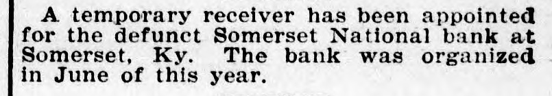A temporary receiver has been appointed for the defunct Somerset National bank at Somerset, Ky. The bank was organized in June of this year.