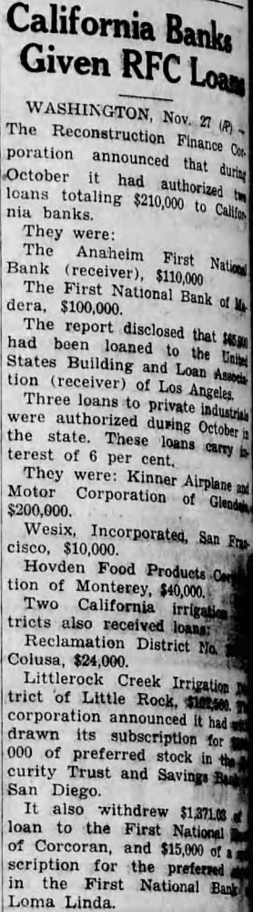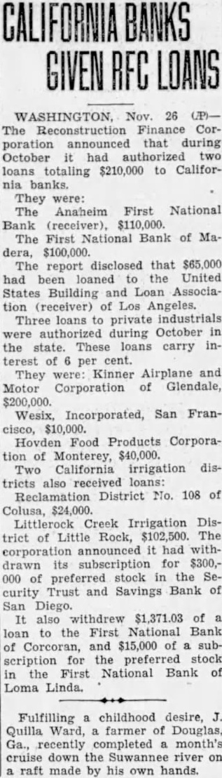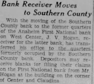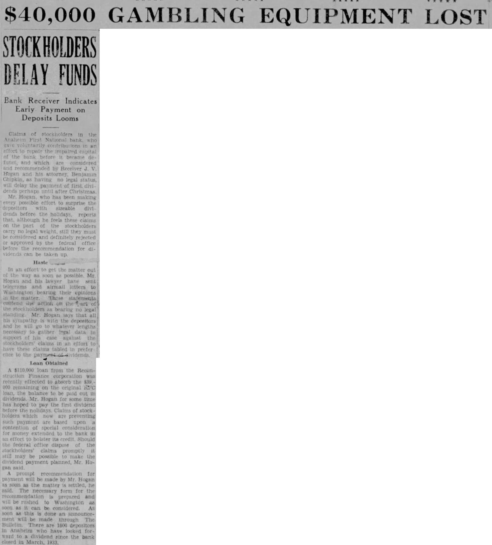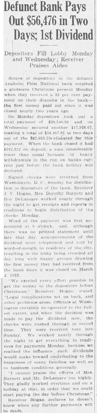 BANK DIRECTORS APPROVE OF REORGANIZATION Stockholders to Consider New Plan Monday Evening; $25,000 Paid Tentatively approved by the board of directors, plan to reorganize the Anaheim First National bank will be submitted to stockholders by the at joint meeting to be held Monday evening the bank. This decision was reached at meeting Tuesday evening when directors threshed several plans reorganize, deciding upon one which will call for raising of a substantial amount of additional capital. If the stockholders approve this plan, it will be sent to Washington for approval of the comptroller of currency. "We have high hopes of successful reorganization," President William A. Dolan states. "Depreciation of certain bonds is what caused all trouble. Since the bank was placed under receivership last week, these bonds appreciated $28,000 by Wednesday. This increase in capital, plus additional capital which believe we can raise in the community, would put us on what believe would be solid financial footing. Of course, if our bank is reorganized and thus opened, all accounts under $2500 would be guaranteed by the govWe still retain our national ernment. charter." In the advent that the bank is not reorganized soon, Receiver Hogan will speed up liquidation, according to Dolan. At the time the comptroller of currency placed the bank under a receiver, it was carrying an average of $50,000 in new accounts, all held in cash, government bonds or as deposits with the federal reserve bank. Receiver Hogan issued call for all depositors of new accounts (those who have deposited money or opened accounts since the bank holidaye) to appear this week and get federal reserve bank checks for their entire balance. During Monday and Tuesday approximately $25,000 were issued to about half the new debalance must be positors. All the drawn out, with indications Wednesday pointing to the necessity of sending out to new depositors additional warnings come and get their money in full.