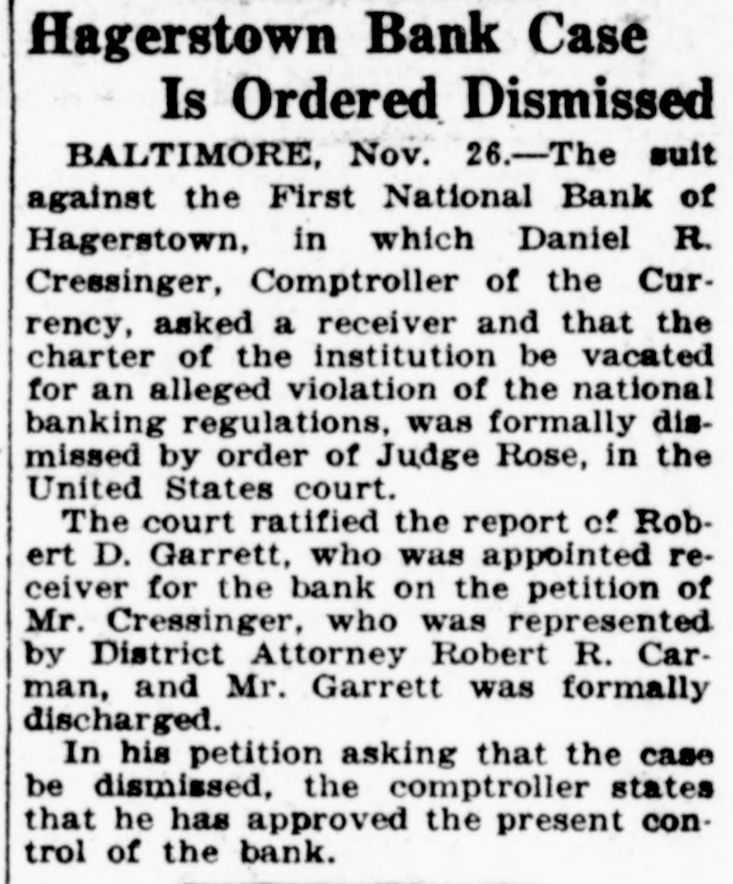 CAPITAL TRACTION NETS $98,097 FOR MONTH OF AUGUST July's Profits Amount to $113,984 and $102,147 Last Year. OU L OTHER LOCAL NOTES Hagerstown Bank's Charter Threatened in Suit Entered In Baltimore. Capital Traction lines operated at a net income of $95,007 during the month.of August, according to rereceived by the Public Utillties Commission for the period ports receipts yesterday. in question Total amounted to $433,698, while expenses totaled $335,601. These figures compare with $102.147 for the corresponding period one year ago, and with $113,984, which represents the net income for July of the present year. Bank May Lose Charter. A suit was entered in the United States Court at Baltimore yesterday by the United States attorney, in the name of the Comptroller of the Currency, to forfeit the charter of the First National Bank of Hagerstown, Md., for violations of the national banking laws. Pending a hearing of the case, the court appointed Robert D. Garrett as temporary receiver in order to conserve the assets of the bank in the interest of the depositors and stockholders. Acting Comptroller T. P. Kane stated that this bank has been a most persistent violator of the banking laws for the past several years. Its management not only deliberately ignored the intructions of the national bank examiners at each examiantion, but has openly defied the admonitions and warnings of the Comptroller until nothing remained for the Comptroller to to to for revocation the is Kane do but further of apply states bank's the that charter. court this only the second case in the history of the national banking system in which forfeiture proceedings have been instituted by the Comptroller for violations of law. In addition to the agricultural loan agencies previously announced by the War Finance Corporation, the following committee, with headquarters at Atlanta, has been appointed to receive applications from Sanks in its district for advances under the recently enacted Section 24 of the War Finance Corporation act, and to make recommendations as to these advances to the War Finance Corporation: Chairman. John K. Ottley; L. R. Adams, C. W. Skinner, Mills B. Lane, Augustus E. Young. W. F. Coachman, D. M. Lowry and T. L. Wilson. Personal. William D. Hoover, president of the National Savings and Trust Company, returned to his desk yesterday morning after an extended vacation spent in the mountains of West Virginia. Local Securities. Trading on the Washington Stock Exchange failed to emerge from the slump which has been prevalent for the past several days in yesterday's listless period. Washington Gas 5s showed considerable strength, $1.00. face value. selling at 82 and 821/4. Capital Traction 5s failed to change their position, $500 selling at 87% In the stock list 25 shares of Capital Traction sold at 86% Call money ruled at 7 per cent asked, with brokers bidding 5 1/2 per cent. .