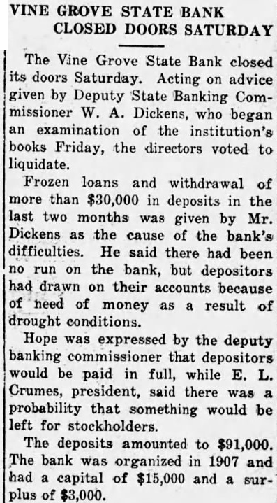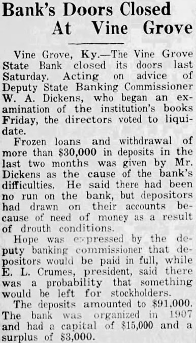 VINE GROVE STATE BANK CLOSED DOORS SATURDAY The Vine Grove State Bank closed its doors Saturday. Acting on advice given by Deputy State Banking Commissioner W. A. Dickens, who began an examination of the institution's books Friday, the directors voted to liquidate. Frozen loans and withdrawal of more than $30,000 in deposits in the last two months was given by Mr. Dickens as the cause of the bank's difficulties. He said there had been no run on the bank, but depositors had drawn on their accounts because of need of money as a result of drought conditions. Hope was expressed by the deputy banking commissioner that depositors would be paid in full, while E. L. Crumes, president, said there was a probability that something would be left for stockholders. The deposits amounted to $91,000. The bank was organized in 1907 and had a capital of $15,000 and a surplus of $3,000.