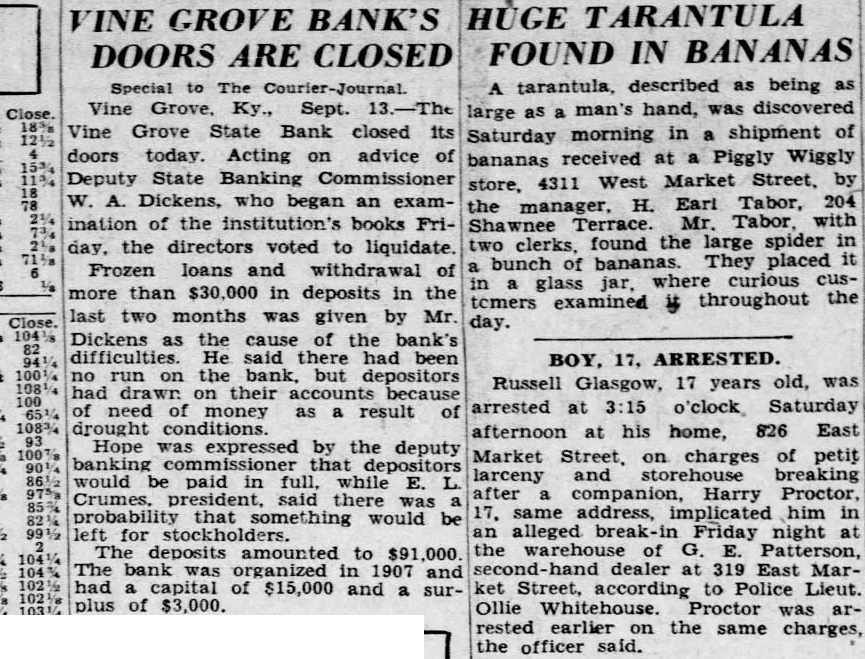 VINE GROVE BANK'S HUGE TARANTULA DOORS ARE CLOSED FOUND IN BANANAS Special to The Vine Ky., Sept. Close. Vine Grove State Bank closed its doors today. Acting on advice of Deputy State Banking Commissioner W. A Dickens, who began an examination of the institution's books Friday. the directors voted to liquidate. Frozen loans and withdrawal of more than $30,000 in deposits in the last two months was given by Mr. Dickens as the cause of the bank's difficulties. He said there had been the bank, but depositors on their accounts of money as result of conditions. expressed by the deputy that depositors be in E. said there was probability that would deposits amounted to bank organized in 1907 and capital of $15,000 and plus of $3,000. A tarantula, described as being as man's hand, was discovered large as Saturday morning in a shipment of bananas received at Piggly Wiggly West Market Street, by store, 4311 Earl Tabor, 204 the manager, H. Shawnee Terrace. Mr. Tabor. with found the large spider two bunch of bananas. They placed it where curious cusglass tomers examined # throughout the day. BOY, 17. ARRESTED Russell Glasgow, 17 years old, arrested at 3:15 o'clock Saturday afternoon at his home, 826 East Market Street, on charges of petit larceny and storehouse breaking after companion, Harry Proctor, same address, implicated him an alleged break-in Friday night the warehouse of G. E. Patterson, second dealer at 319 East MarStreet, according to Police Lieut. Ollie Whitehouse. Proctor was rested earlier on the same charges, the officer said.