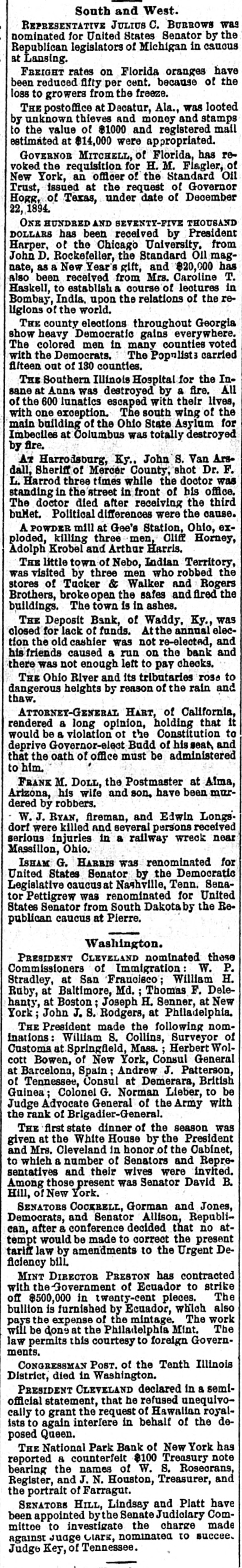 South and West. REPRESENTATIVE JULIUS C. BURROWS was nominated for United States Senator by the Republican legislators of Michigan in caucus at Lansing. FREIGHT rates on Florida oranges have been reduced fifty per cent. because of the loss to growers from the freeze. THE postoffice at Decatur, Ala., was looted by unknown thieves and money and stamps to the value of 81000 and registered mail estimated at $14,000 were appropriated. GOVERNOR MITCHELL, of Florida, has revoked the requisition for H. M. Flagler, of New York, an officer of the Standard Oil Trust, issued at the request of Governor Hogg, of Texas, under date of December 22, 1894. ONE HUNDRED AND SEVENTY-FIVE THOUSAND DOLLARS has been received by President Harper, of the Chicago University. from John D. Rockefeller, the Standard On magnate, as a New Years gift, and $20,000 has also been received from Mrs. Caroline T. Haskell, to establish a course of lectures in Bombay, India. upon the relations of the religions of the world. THE county elections throughout Georgia show heavy Democratic gains everywhere. The colored men in many counties voted with the Democrats. The Populists carried fifteen out of 130 counties. THE Southern Illinois Hospital for the Insane at Anna was destroyed by a fire. All of the 600 lunatics escaped with their lives, with one exception. The south wing of the main building of the Ohio State Asylum for Imbeciles at Columbus was totally destroyed by fire. AT Harrodsburg, Ky.. John S. Van Arsdall, Sheriff of Mercer County, shot Dr. F. L. Harrod three times while the doctor was standing in the street in front of his office. The doctor died after receiving the third buMet. Political differences were the cause. A POWDER mill at Gee's Station, Ohio, exploded, killing three men, Cliff Horney, Adolph Krobel and Arthur Harris. THE little town of Nebo, Indian Territory, was visited by three men who robbed the stores of Tucker & Walker and Rogers Brothers, brokeopen the safes and fired the buildings. The town is in ashes. THE Deposit Bank, of Waddy. Ky., was closed for lack of funds. At the annual election the old cashier was not re-elected, and his friends caused a run on the bank and there was not enough left to pay checks. THE Ohio River and its tributaries rose to dangerous heights by reason of the rain and thaw. ATTORNEY-GENERAL HART, of California, rendered a long opinion, holding that it would be a violation of the Constitution to deprive Governor-elect Budd of his seat, and that the oath of office must be administered to him. FRANK M. DOLL, the Postmaster at Alma, Arizona, his wife and son, have been murdered by robbers. W. J. RYAN, fireman, and Edwin Longsdorf were killed and several persons received serious injuries in a railway wreck near Massillon, Ohio. ISHAM G. HARRIS was renominated for United States Senator by the Democratic Legislative caucusat Nashville, Tenn. Senator Pettigrew was renominated for United States Senator from South Dakotaby the Republican caucus at Pierre. Washington. PRESIDENT CLEVELAND nominated these Commissioners of Immigration W. P. Stradley, at San Francisco; William H. Ruby, at Baltimore, Md. Thomas F. Delehanty, at Boston; Joseph H. Senner, at New York; John J. S. Rodgers, at Philadelphia. THE President made the following nominations: William S. Collins, Surveyor of Customs at Springfield, Mass. Herbert Wolcott Bowen, of New York, Consul General at Barcelona, Spain Andrew J. Patterson, of Tennessee, Consul at Demerara, British Guinea; Colonel G. Norman Lieber, to be Judge Advocate General of the Army with the rank of Brigadier-General. THE first state dinner of the season was given at the White House by the President and Mrs. Cleveland in honor of the Cabinet, to which a number of Senators and Representatives and their wives were invited. Among those present was Senator David B. Hill, of New York. SENATORS COCKRELL, Gorman and Jones, Democrats, and Senator Allison, Republican, after a conference decided that no attempt would be made to correct the present tariff law by amendments to the Urgent Deficiency bill. MINT DIRECTOR PRESTON has contracted with the Government of Ecuador to strike off $500,000 in twenty-cent pieces. The bullion is furnished by Ecuador, which also pays the expense of the mintage. The work will be done at the Philadelphia Mint. The law permits this courtesy to foreign Governments. CONGRESSMAN Posr. of the Tenth Illinois District, died in Washington. PRESIDENT CLEVELAND declared in a semiofficial statement, that he refused unequivocally to grant the request of Hawaiian royalists to again interfere in behalf of the deposed Queen. THE National Park Bank of New York has reported a counterfeit $100 Treasury note bearing the names of W. S. Rosecrans, Register, and J. N. Houston, Treasurer, and the portrait of Farragut. SENATORS HILL, Lindsay and Platt have been appointed by the Senate Judiciary Committee to investigate the charge made against Judge Clark, nominated to succee. Judge Key, of Tennessee.