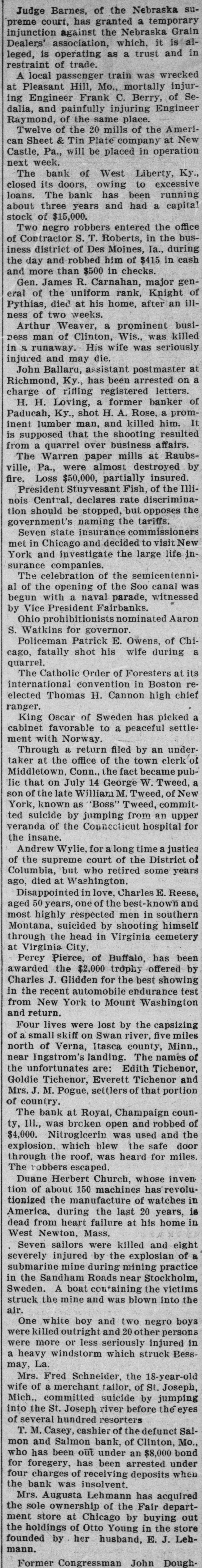 Judge Barnes, of the Nebraska supreme court, has granted a temporary injunction against the Nebraska Grain Dealers' association, which, it is alleged, is operating as a trust and in restraint of trade. A local passenger train was wrecked at Pleasant Hill, Mo., mortally injuring Engineer Frank C. Berry, of Sedalia, and painfully injuring Engineer Raymond, of the same place. Twelve of the 20 mills of the American Sheet & Tin Plate company at New Castle, Pa., will be placed in operation next week. The bank of West Liberty, Ky., closed its doors, owing to excessive loans. The bank has been running about three years and had a capital stock of $15,000. Two negro robbers entered the office of Contractor S. T. Roberts, in the business district of Des Moines, Ia., during the day and robbed him of $415 in cash and more than $500 in checks. Gen. James R. Carnahan, major general of the uniform rank, Knight of Pythias, died at his home, after an illness of two weeks. Arthur Weaver, a prominent business man of Clinton, Wis., was killed in a runaway. His wife was seriously injured and may die. John Ballard, assistant postmaster at Richmond, Ky., has been arrested on a charge of rifling registered letters. H. H. Loving, a former banker of Paducah, Ky., shot H. A. Rose, a prominent lumber man, and killed him. It is supposed that the shooting resulted from a quarrel over business affairs. The Warren paper mills at Raubsville, Pa., were almost destroyed by fire. Loss $50,000, partially insured. President Stuyvesant Fish, of the Illinois Central, declares rate discrimination should be stopped, but opposes the government's naming the tariffs. Seven state insurance commissioners met in Chicago and decided to visit New York and investigate the large life insurance companies. The celebration of the semicentennial of the opening of the Soo canal was begun with a naval parade, witnessed by Vice President Fairbanks. Ohio prohibitionists nominated Aaron S. Watkins for governor. Policeman Patrick E. Owens, of Chicago, fatally shot his wife during a quarrel. The Catholic Order of Foresters at its international convention in Boston reelected Thomas H. Cannon high chief ranger. King Oscar of Sweden has picked a cabinet favorable to a peaceful settlement with Norway. Through a return filed by an undertaker at the office of the town clerk of Middletown, Conn., the fact became public that on July 14 George W. Tweed, a son of the late William M. Tweed, of New York, known as "Boss" Tweed, committed suicide by jumping from an upper veranda of the Connecticut hospital for the insane. Andrew Wylie, for a long time a justice of the supreme court of the District of Columbia, but who retired some years ago, died at Washington. Disappointed in love, Charles E. Reese, aged 50 years, one of the best-known and most highly respected men in southern Montana, suicided by shooting himself through the head in Virginia cemetery at Virginia City. Percy Pierce, of Buffalo, has been awarded the $2,000 trophy offered by Charles J. Glidden for the best showing in the recent automobile endurance test from New York to Mount Washington and return. Four lives were lost by the capsizing of a small skiff on Swan river, five miles north of Verna, Itasca county, Minn., near Ingstrom's landing. The names of the unfortunates are: Edith Tichenor, Goldie Tichenor, Everett Tichenor and Mrs. J. M. Pogue, settlers of that portion of country. The bank at Royal, Champaign county, Ill., was broken open and robbed of $4,000. Nitroglcerin was used and the explosion, which blew the safe door through the roof, was heard for miles. The robbers escaped. Duane Herbert Church, whose invention of about 150 machines has revolutionized the manufacture of watches in America, during the last 20 years, is dead from heart failure at his home in West Newton, Mass. Seven sailors were killed and eight severely injured by the explosian of a submarine mine during mining practice in the Sandham Roads near Stockholm, Sweden. A boat containing the victims struck the mine and was blown into the air. One white boy and two negro boys were killed outright and 20 other persons were more or less seriously injured in a heavy windstorm which struck Bessmay, La. Mrs. Fred Schneider, the 18-year-old wife of a merchant tailor, of St. Joseph, Mich., committed suicide by jumping into the St. Joseph river before the eyes of several hundred resorters T. M. Casey, cashier of the defunct Salmon and Salmon bank, of Clinton, Mo., who has been out under an $8,000 bond for foregery, has been arrested under four charges of receiving deposits when