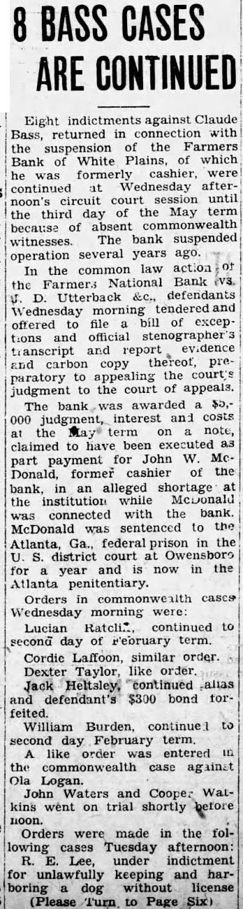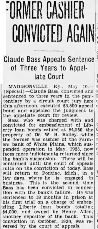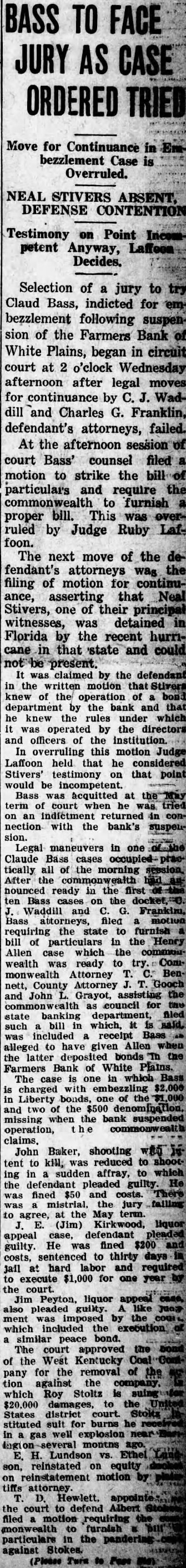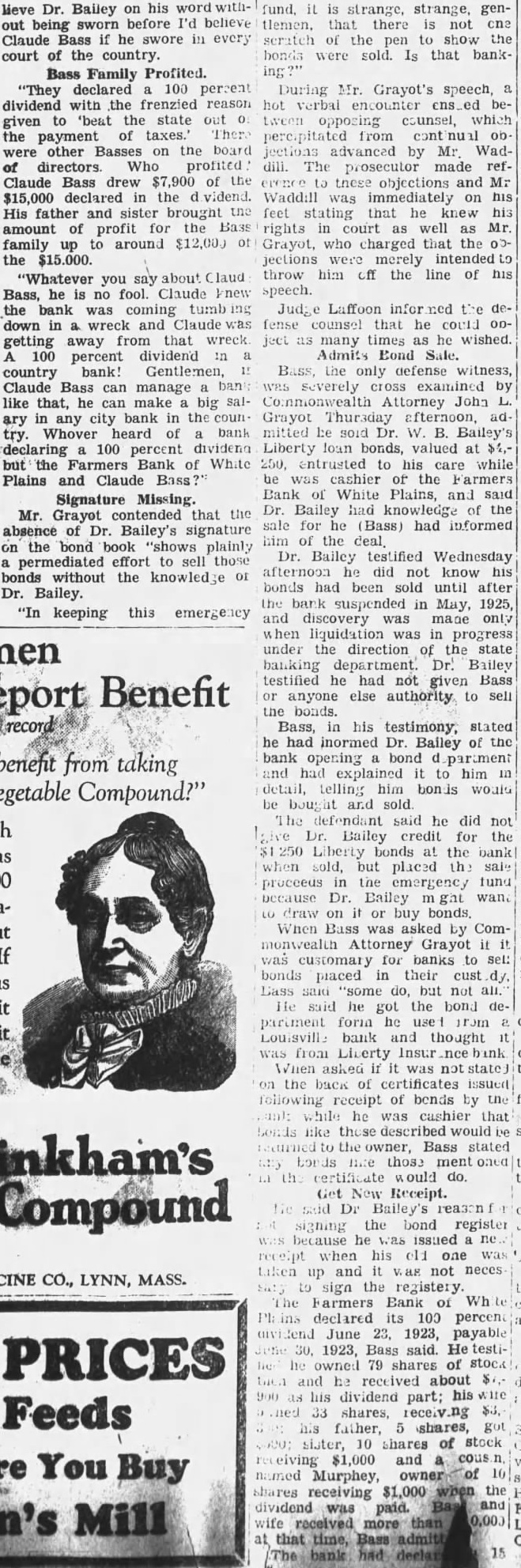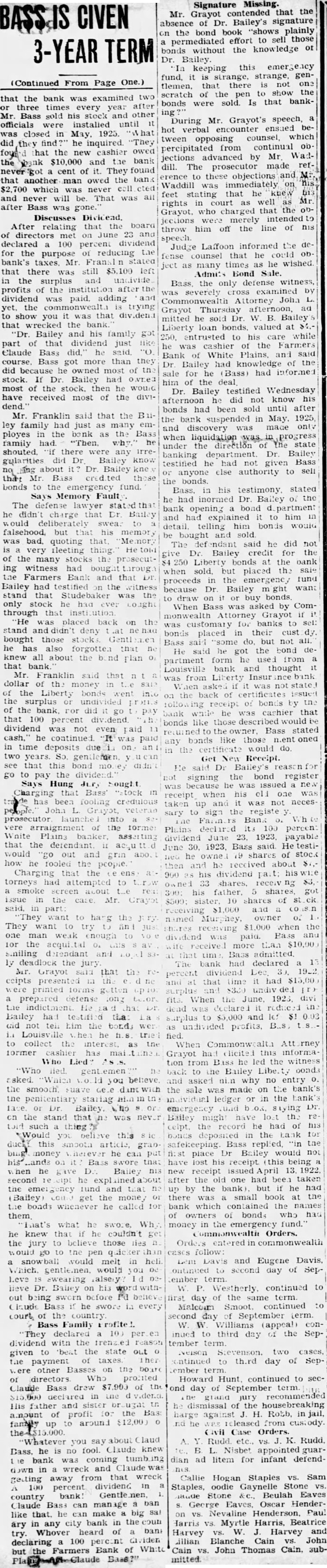Signature Missing. Mr. Grayot contended that the absence of Dr. Bailey's signature on the bond book "shows plainly a permediated effort to sell those bonds without the knowledge of Dr. Bailey. In keeping this emergency fund, it is strange, strange, gentlemen, that there is not one scratch of the pen to show the bonds were sold Is that banking During Mr. Grayot's speech, a hot verbal encounter ensued between opposing counsel, which percipitated from continual ob jections advanced by Mr Waddill. The prosecutor made reference to these objections and Mr. Waddill was immediately on his feet stating that he knew bis rights in court as well as Mr. Grayot, who charged that the 00jections were merely intended to throw him off the line of his speech. Judge Laffoon informed the defense counsel that he could object as many times as he wished. Admits Bond Sale. Bass, the only defense witness, was severely cross examined by Commonwealth Attorney John L. Grayot Thursday afternoon, ad mitted he sold W. B. Bailey Liberty loan bonds. valued at $4.250, entrusted to his care while he was cashier of the Farmers Bank of White Plains, and said Dr. Bailey had knowledge of the sale for he (Bass) had informed him of the Dr. Bailey testified Wednesday afternoon he did not know his bonds had been sold until after the bank suspended in May. 1925, and discovery was made only when liquidation was in progress under the direction of the state banking department. Dr. Bailey testified he had not given Bass or anyone else authority to sell the bonds. Bass, in his testimony. stated he had inormed Dr. Balley OF the bank opening bond d partment and had explained it to him in detail, telling him bonds would be bought and sold The def endant said he did not give Dr. Bailey credit for the $4 250 Liberty bonds at the bank when sold, but placed the saie proceeds in the emergency fund because Dr. Bailey m ght want to draw on it or buy bonds When Bass was asked by Commonwealth Attorney Grayot if it was customary for banks to sel: bonds placed in their cust dy. Bass said "some do, but not all. He said he got the bond department form he used from a Louisville bank and thought it was from Liberty Insur ince bank When asked if it was not state on the back of certificates issued following receipt of bonds by the bank while he was cashier that bonds like those described would be returned to the owner, Bass stated any bonds like those n.ent oned in the certificate would do. Get New Receipt. He said Dr Bailey's reason for not signing the bond register was because he was issued a new receipt when his oll one was taken up and it was not necessary to sign the registe y. Plains declared its 100 percent dividend June 23, 1923, payable June 30, 1923. Bass said He testineo he owned 19 shares of stock then and he received about $7,900 as his dividend pait; his wite owned 33 shares, receiv ng $3, 300: his father, 5 shares, got $500: sister, 10 shares of st ck receiving $1,000 and a consn named Murphey, owner $1,000 when the shares receiving wife received more than at that time Bass admitted The bank had declared a 13 and at that time it had $15.00 fits. When the June, 1923. divi dend was declared it reduced in surplus to $5,000 and lef $1 0.03 as undivided profits,