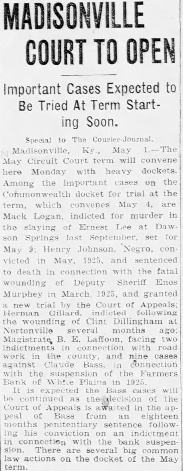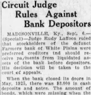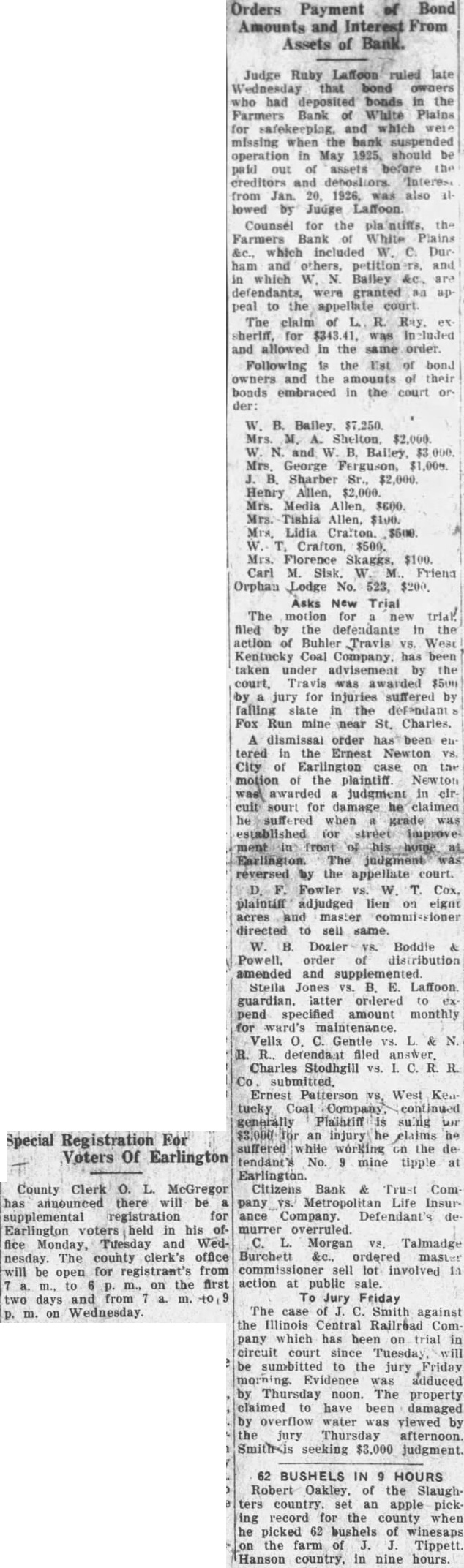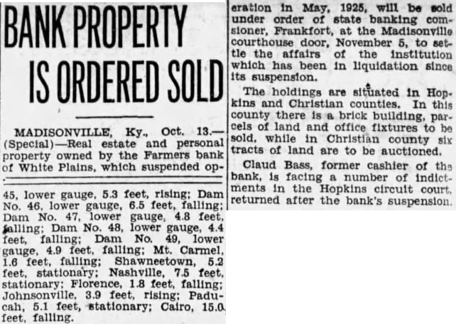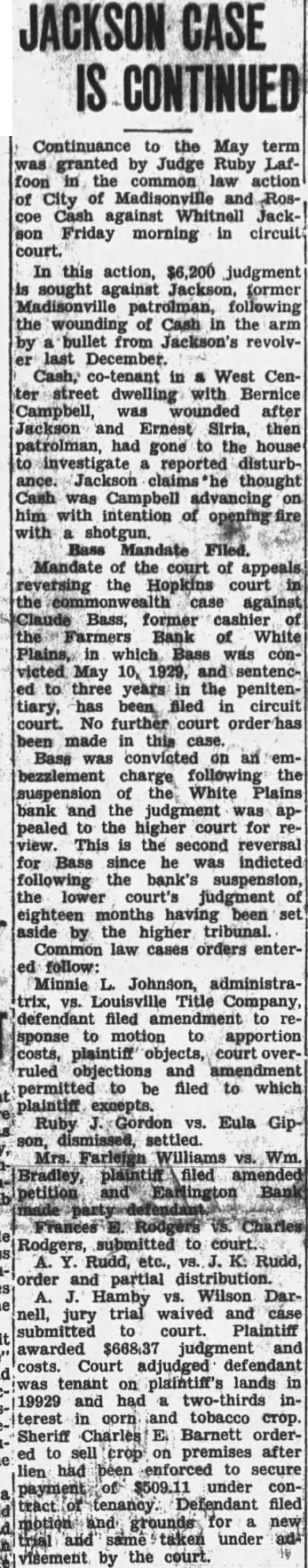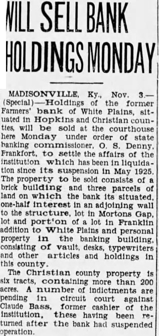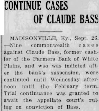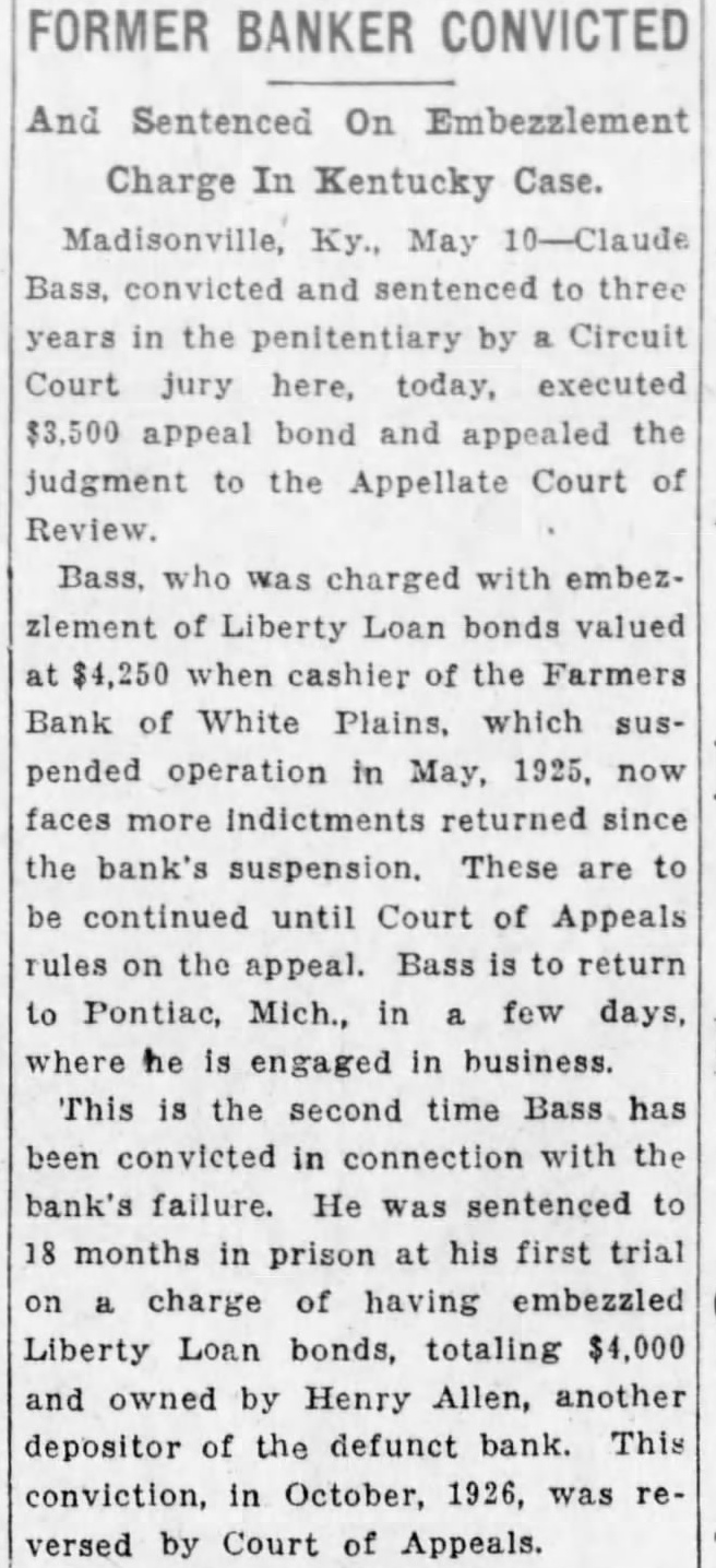 Signature Missing. Mr. Grayot contended that the absence of Dr. Bailey's signature on the bond book "shows plainly a permediated effort to sell those bonds without the knowledge of Dr. Bailey. In keeping this emergency fund, it is strange, strange, gentlemen, that there is not one scratch of the pen to show the bonds were sold Is that banking During Mr. Grayot's speech, a hot verbal encounter ensued between opposing counsel, which percipitated from continual ob jections advanced by Mr Waddill. The prosecutor made reference to these objections and Mr. Waddill was immediately on his feet stating that he knew bis rights in court as well as Mr. Grayot, who charged that the 00jections were merely intended to throw him off the line of his speech. Judge Laffoon informed the defense counsel that he could object as many times as he wished. Admits Bond Sale. Bass, the only defense witness, was severely cross examined by Commonwealth Attorney John L. Grayot Thursday afternoon, ad mitted he sold W. B. Bailey Liberty loan bonds. valued at $4.250, entrusted to his care while he was cashier of the Farmers Bank of White Plains, and said Dr. Bailey had knowledge of the sale for he (Bass) had informed him of the Dr. Bailey testified Wednesday afternoon he did not know his bonds had been sold until after the bank suspended in May. 1925, and discovery was made only when liquidation was in progress under the direction of the state banking department. Dr. Bailey testified he had not given Bass or anyone else authority to sell the bonds. Bass, in his testimony. stated he had inormed Dr. Balley OF the bank opening bond d partment and had explained it to him in detail, telling him bonds would be bought and sold The def endant said he did not give Dr. Bailey credit for the $4 250 Liberty bonds at the bank when sold, but placed the saie proceeds in the emergency fund because Dr. Bailey m ght want to draw on it or buy bonds When Bass was asked by Commonwealth Attorney Grayot if it was customary for banks to sel: bonds placed in their cust dy. Bass said "some do, but not all. He said he got the bond department form he used from a Louisville bank and thought it was from Liberty Insur ince bank When asked if it was not state on the back of certificates issued following receipt of bonds by the bank while he was cashier that bonds like those described would be returned to the owner, Bass stated any bonds like those n.ent oned in the certificate would do. Get New Receipt. He said Dr Bailey's reason for not signing the bond register was because he was issued a new receipt when his oll one was taken up and it was not necessary to sign the registe y. Plains declared its 100 percent dividend June 23, 1923, payable June 30, 1923. Bass said He testineo he owned 19 shares of stock then and he received about $7,900 as his dividend pait; his wite owned 33 shares, receiv ng $3, 300: his father, 5 shares, got $500: sister, 10 shares of st ck receiving $1,000 and a consn named Murphey, owner $1,000 when the shares receiving wife received more than at that time Bass admitted The bank had declared a 13 and at that time it had $15.00 fits. When the June, 1923. divi dend was declared it reduced in surplus to $5,000 and lef $1 0.03 as undivided profits,