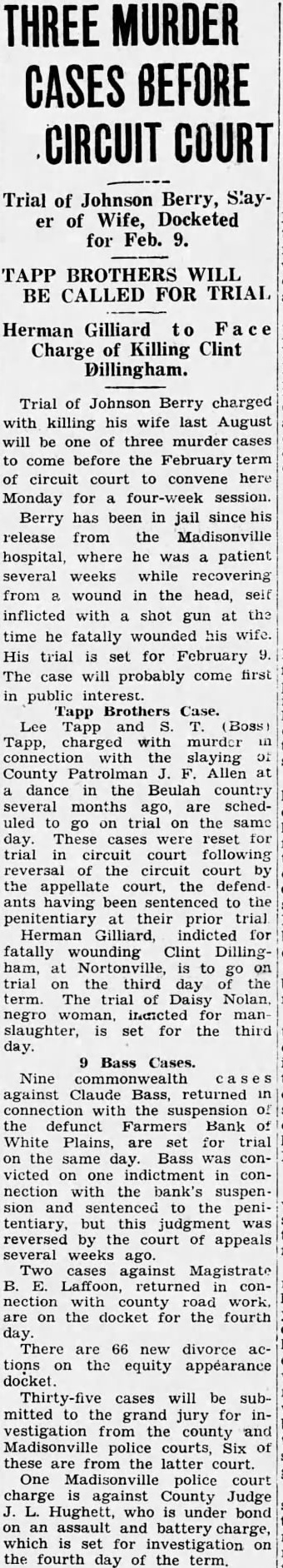 When Commonwealth Attorney Grayot ha: clicited this information from Bass he led the witness back to the Bailey Libe.ty bonds and asked ni.n why no entry O. Bailey might have lost the recelpt. the record he had of his bonds deposited in the tank for safekeeping. Bass replied, "in the first place Dr Bailey would not have lost his receipt (this being new receipt issued April 13, 1922. after the old one had been taken up by the bank) but if he had there was small book at the bank which contained the names of owners 01 bonds who had money in the emergency fund. Commonwealth Orders. Orders entered in commonwealth cases follow: Lem Davis and Eugene Davis, ontinued to second day of Septerm W. P. Westherly, continued to first day of the same term. Malcom Smoot continued to second day of September term. W. W Williams (appeal coninued to third day of the September term Neison Stevenson. two cases, ontinued to th.rd day of September term Howard Hunt. continued to second day of September term. ne grand jury recommended he dismissal of the housebreaking harge against J. H. Robb, in jail, nd he released from custody Civil Case Orders A. Y. Rudd etc., VS. J. K. Rudd. te., B L. Nisbet appointed guardian ad litem for infant defendCallie Hogan Staples vs. Sam Staples, oodie Gaynelle Stone vs. staude Stone &c., Beulah Eaves S. George Eaves. Oscar Henderon VS Nevaline Henderson, Paul Harris vs. Myrtle Harris, Beatrice Harvey vs. W. J. Harvey and Lillian Blanche Cain VS. John Cain vs. John Thomas Cain, sub-