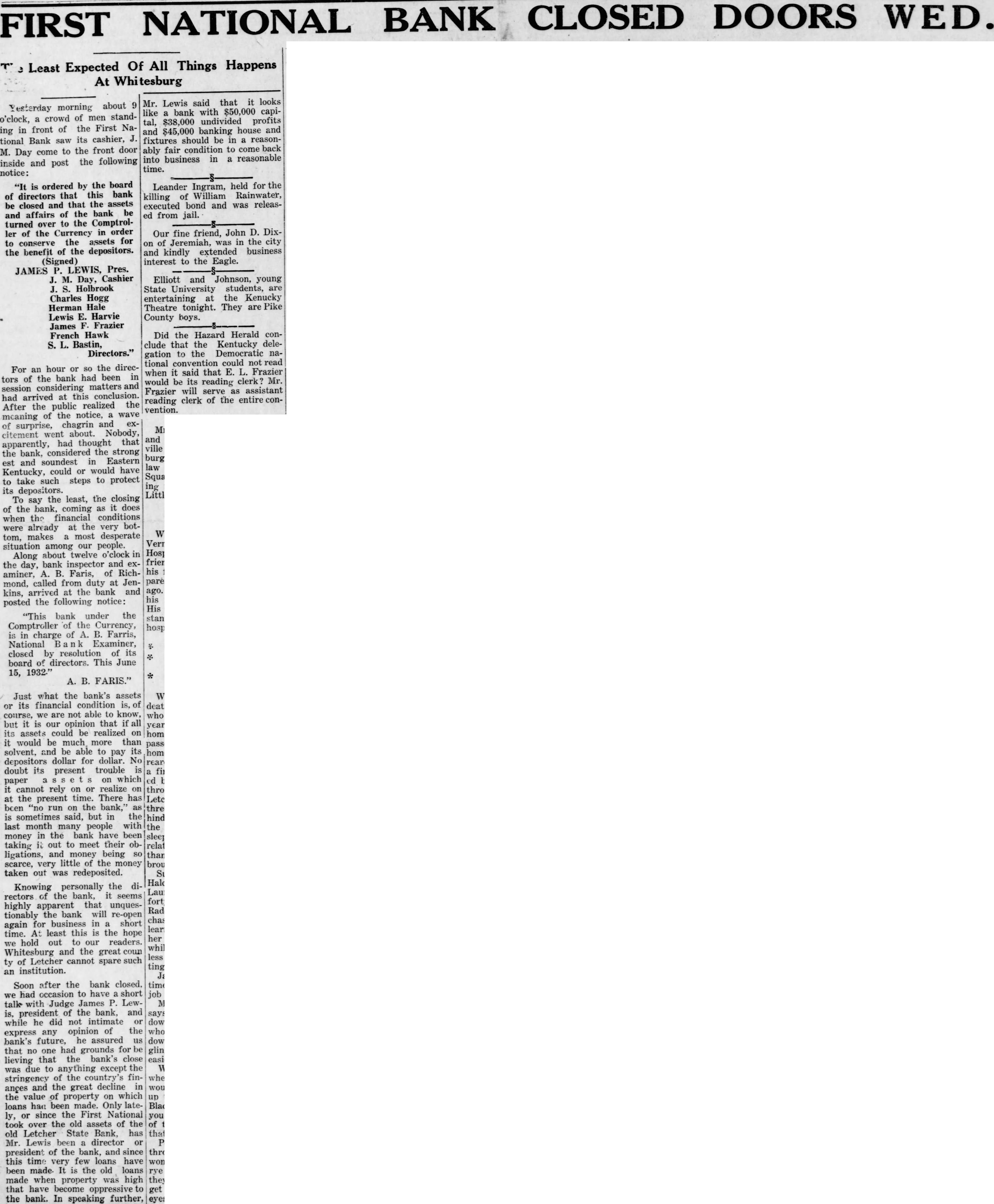 CLOSED DOORS WED. BANK FIRST Of All Things Happens Least Expected At Whitesburg about Yesterday morning of stando'clock, crowd men a the First Nain front of ing its cashier, J. tional Bank saw the front door M. Day come to and the following inside post notice: is ordered by the board that this bank of directors and that the assets be closed and affairs of the bank be turned over to the Comptroller of the Currency in order the assets for to conserve the benefit of the depositors. (Signed) P. LEWIS, Pres. JAMES M. Day, Cashier Holbrook Charles Hogg Herman Hale Lewis E. Harvie James Frazier French Hawk Bastin, Directors." the direcFor an hour or SO tors of the bank had been in matters and session considering arrived this conclusion. had at After the public realized the meaning of the notice, wave of surprise, chagrin and exwent about. Nobody, citement had thought that apparently, considered the strong the bank, and soundest in Eastern Kentucky, could or would have take such steps to protect to its depositors. To say the least, the closing of the bank, coming as it does the financial conditions when were already at the very bottom, makes most desperate situation among our people. Along about twelve o'clock in the day, bank inspector and exA. B. Faris, of Richaminer, mond, called from duty at Jenkins, arrived at the bank and posted the following notice: "This bank under the Comptroller of the Currency, is in charge of A. B. Farris, National Examiner, closed by resolution of its board of directors. This June 15, 1932." A. FARIS." Just what the bank's assets or its financial condition is, of course, we are not able to know, but it is our opinion that all its assets could be realized on would be much, more than solvent, and be able to its pay depositors dollar for dollar. No doubt its present trouble on which paper it cannot rely on or realize on at the time. There has present been run on the bank," is sometimes said, but in the last month people with many in the bank have been money it out to meet their obtaking ligations, and money being SO scarce, very little of the money taken out was redeposited. Knowing personally the rectors of the bank, it seems highly apparent that unquestionably the bank will re-open for business in short again time. At least this is the hope hold out to our readers. Whitesburg and the great coun ty of Letcher cannot an institution. Soon after the bank closed, we had occasion to have short talk with Judge James Lewis. president of the bank, and says while he did not intimate or down opinion of the who express any bank's future, he assured us down had grounds for be that no one gling that the bank's close easier lieving was due to anything except the stringency of the country's when ances and the great decline in would the value of property on which up had been made. Only lateloans or since the First National ly, you took over the old assets of the of old Letcher State Bank, has Mr. Lewis been a director or president of the bank, and since this time very few loans have been made. It is the old loans made when property was high they that have become oppressive to get the bank. In speaking further, said that it looks Mr. Lewis like bank with $50,000 capital, $38,000 undivided profits and $45,000 banking house and fixtures should be in reasoncondition to come back ably fair business in a reasonable into time. held for the Leander Ingram, of William Rainwater, killing bond and was releasexecuted from jail. John D. DixOur fine friend, on of Jeremiah, was in the city extended business and kindly interest to the Eagle. Elliott and Johnson, young State University students, are at the Kenucky entertaining Theatre They are Pike tonight. County boys. Did the Hazard Herald conthat the Kentucky deleclude to the Democratic nagation tional convention could not read when it said that E. L. Frazier would be its reading clerk? Mr. will as assistant Frazier serve clerk of the reading vention.