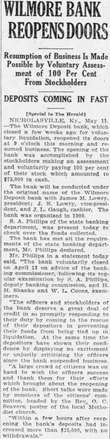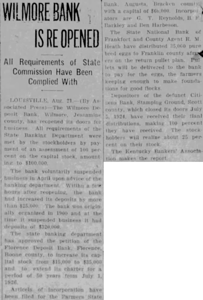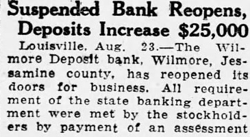 The Wilmore Deposit Bank, Wilmore, Jessamine county, ras reopenits doors for business. All requirements of State Banking Department were met by the stockholders by payment of an assessment of 100 percent on the capital stock, amounting to $100,000. The bank voluntarily suspended business in April upon advice of the banking department. Within few hours after reopening, the bank had increased its deposits by more than $25,000. The bank was originally organized in 1900 and at the time suspended business had deposits of $320,000.