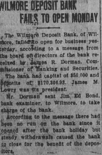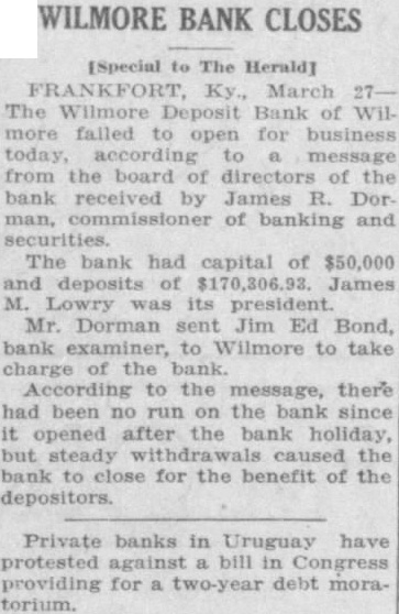 WILMORE DEPOSIT BANK FAILS TO OPEN MONDAY The Wilmore Deposit Bank, of Willmore. failed Ro open for business yesterday. according to a message from the board of directors of the bank reinfasioner of Banking and Securities. The bank had capital of $50 000 and Peposits of: $170,306.93. James M Lowry was tta president. Mr. Dorman sent Jim, Ed Bond, bank examiner. to Wilmore, to take charge of the bank. According to the message there had been no run on the bank since it opened after the bank holiday but steady withdrawals caused the bank ER close for the benefit of the depos-