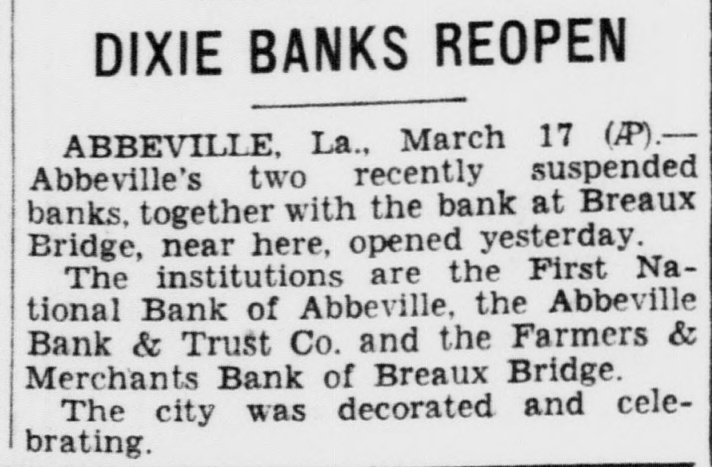 DIXIE BANKS REOPEN ABBEVILLE, La., March 17 (AP).Abbeville's two recently suspended banks, together with the bank at Breaux Bridge, near here, opened yesterday. The institutions are the First National Bank of Abbeville, the Abbeville Bank & Trust Co. and the Farmers & Merchants Bank of Breaux Bridge. The city was decorated and celebrating.