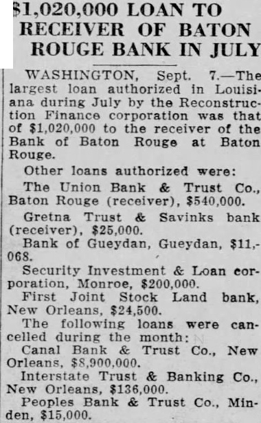 R. F. C. Loans in July in Louisiana Announced Sept )-The largest loan in Louisiana during July by the Reconstruction Finance Corporation was that of to the receiver of the Bank of Baton Rouge at Baton Rouge Other loans authoribed were: The Union Bank and Trust Company, Baton Rouge (receiver), $540.000 Gretna Trust and Savings Bank, (receiver) Bank of Gueydan, Gueydan. $11.- Security Investment and Lean First Joint Stock Land Bank. New Orleans, The following loans were cancelled during the month: Canal Bank and Trust Company, Interstate Trust and Banking Company. New Peoples Bank and Trust Company Minden, 15,000. Use Town Talk Classified Ads.