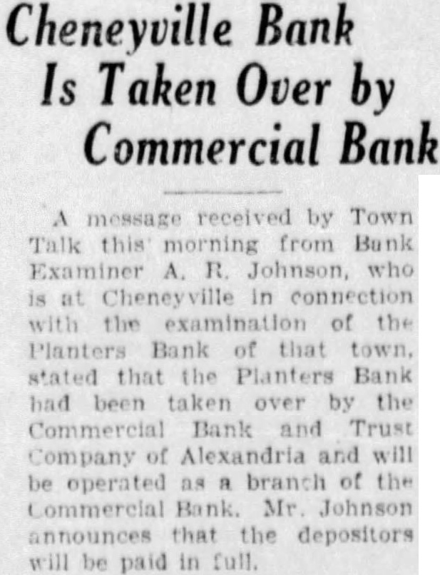 Cheneyville Bank Is Taken Over by Commercial Bank received by Town Talk this from Bank in the of the Planters Bank that stated the Planters had taken the Bank of Alexandria and will be operated Mr Johnson announces that depositors be in