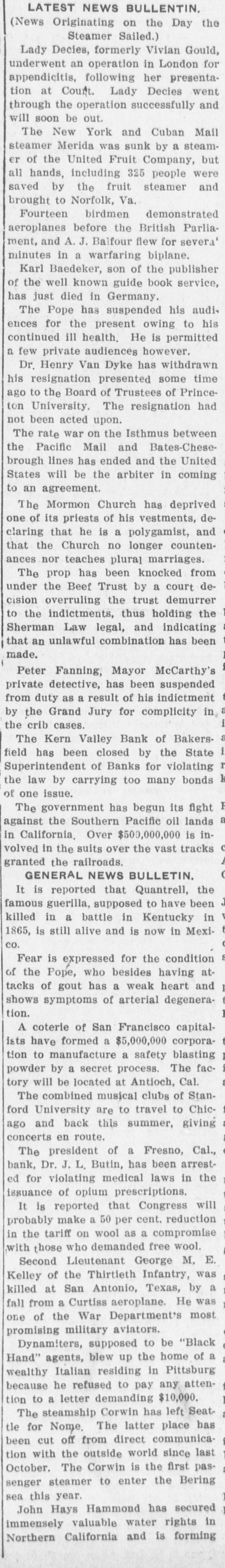 LATEST NEWS BULLENTIN. (News Originating on the Day the Steamer Sailed.) Lady Decies, formerly Vivian Gould, underwent an operation in London for appendicitis, following her presentation at Court. Lady Decies went through the operation successfully and will soon be out. The New York and Cuban Mail steamer Merida was sunk by a steamer of the United Fruit Company, but all hands, including 325 people were saved by the fruit steamer and brought to Norfolk, Va. Fourteen birdmen demonstrated aeroplanes before the British Parliament, and A. J. Balfour flew for severa' minutes in a warfaring biplane. Karl Baedeker, son of the publisher of the well known guide book service, has just died in Germany. The Pope has suspended his audiences for the present owing to his continued ill health. He is permitted a few private audiences however. Dr. Henry Van Dyke has withdrawn his resignation presented some time ago to the Board of Trustees of Princeton University. The resignation had not been acted upon. The rate war on the Isthmus between the Pacific Mail and Bates-Chesebrough lines has ended and the United States will be the arbiter in coming to an agreement. The Mormon Church has deprived one of its priests of his vestments, declaring that he is a polygamist, and that the Church no longer countenances nor teaches plura] marriages. The prop has been knocked from under the Beef Trust by a court decision overruling the trust demurrer to the indictments, thus holding the Sherman Law legal, and indicating that an unlawful combination has been made. Peter Fanning, Mayor McCarthy's private detective, has been suspended from duty as a result of his indictment by the Grand Jury for complicity in a i the crib cases. The Kern Valley Bank of Bakers- a field has been closed by the State i Superintendent of Banks for violating r the law by carrying too many bonds k of one issue. The government has begun its fight B against the Southern Pacific oil lands a in California. Over $500,000,000 is involved in the suits over the vast tracks o A granted the railroads. ( GENERAL NEWS BULLETIN. It is reported that Quantrell, the famous guerilla, supposed to have been J killed in a battle in Kentucky in t 1865, is still alive and is now in MexiCO. Fear is expressed for the condition S of the Pope, who besides having attacks of gout has a weak heart and I t shows symptoms of arterial degeneration. I A coterie of San Francisco capitalt ists have formed a $5,000,000 corporaI tion to manufacture a safety blasting powder by a secret process. The fac- i M tory will be located at Antioch, Cal. The combined musical clubs of Stanford University are to travel to Chica ago and back this summer, giving concerts en route. The president of a Fresno, Cal., bank, Dr. J. L. Butin, has been arrested for violating medical laws in the issuance of opium prescriptions. It is reported that Congress will probably make a 50 per cent. reduction in the tariff on wool as a compromise with those who demanded free wool. Second Lieutenant George M. E. Kelley of the Thirtieth Infantry, was killed at San Antonio, Texas, by a fall from a Curtiss aeroplane. He was one of the War Department's most promising military aviators. Dynamiters, supposed to be "Black Hand" agents, blew up the home of a wealthy Italian residing in Pittsburg because he refused to pay any attention to a letter demanding $10,000. The steamship Corwin has left Seattle for Nome. The latter place has been cut off from direct communication with the outside world since last October. The Corwin is the first passenger steamer to enter the Bering sea this year. John Hays Hammond has secured immensely valuable water rights in Northern California and is forming