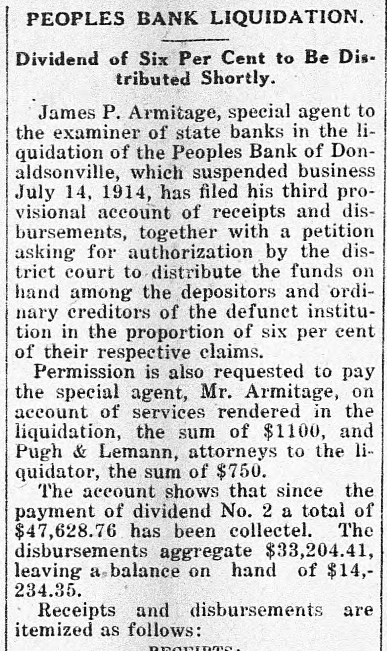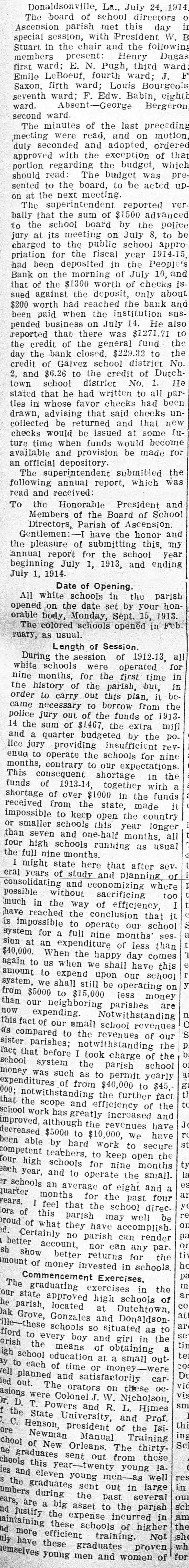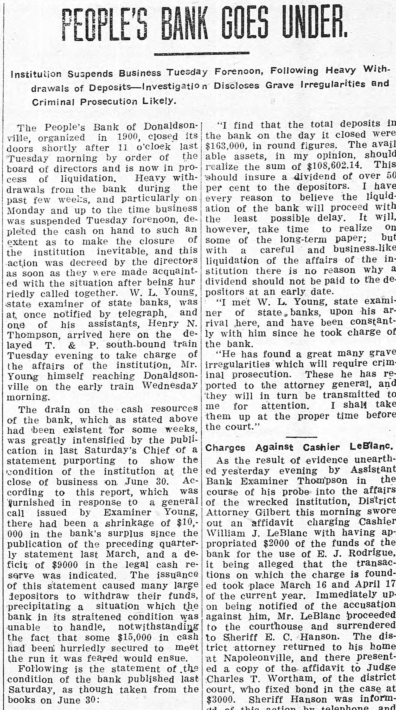 relative department findings to the latest bank. of this prior In the examination enclosed report of to made Oct. you of of 1913, there of the 18, certified this copy was of Donaldsonville statement . response a Bank office in condiPeople's called this the as the rendered to for report of on Sept. to a at the close of with a publication. statement clipping tion 10, 1913, screpancies evidencing together between its the pubon Many discremancie and the of the bank shown were lished statement by the books pointed out to you as day that date. in my that October report of 24, of 1913, board Jonaldsonville; visited the in On Bank meeting of its matter convened People's a went into them this that the the atdirectors; detail matter and general. had advised been the reported bank to show credited on torney books of payable was Orleans July The 1, bills and the bank New was debit- on, correspondent $10,000 of amount. this Later made by with a cross entry was was debited credit- with ed July 10, a payable amount correand the New to explain which $10,000 back bills to When the same asked Orleans cashier, Mr. ed the of spondent. this LeBlanc, cross credit was entry, unable from the and this to on furnish New being Orle- loan furwas in such an employe ans ther advise Questioned fact spondent stated entry effected that on the the of I sub- part the of of bank is 1910. mit of any that officer in violation or of section 9 of minutes Act 193 examination of the fails bank to show have An directors directors of this of secthat the complied the with the 193 provisionwinn of 1910, of every re11 of Act the directors at intervals quires bank, twice a examine or to invesstate tion that shall members year business, cause months, its paya into the the bank, joans, tigate commitlee fully and affairs of attention of books, to the with the particular investments the value ing discounts and ascertaining that this render after special view It of is required a sworn writ- its committee thereof. shall within ten days of the same the ten ten report and a report minutes is of recompletion al shall be at watch in the the report appeared what purports full ceived. meeting .On April 16, to dated 1914, be a there report Feb. and 26, of such 1914, com- law, of but a committee, the SO report as to signed comply is not or with sworn no record the to by plete is it appears held during neither There meeting 1914, when July 14, was held, any until meeting suspension 179 ordered 25 of Act diwhich a this special year meeting bank. called Section the a board of in- in of the that banking stitution s each month. of rectors 1902 provides of every shall meet state at least once of Donaldson Donaldsonville, People's in Bank the town of of Ascenville The is located in the parish as are direction sion. Its officers A. and Dalferes, J. C. Bouchefollow to Blanc, J. cashier; cashier. Directors Netter, L. W. J. assistant Adolphe F. K. reau, J. A. Armitage, Dalferes, D. P. D. Armitage, Dalferes, C. D. Elmer Gon- and W. J. Braud, Colomb Hunt, Henry Sims, B. LeBlanc. dran, Trepagnier E. C. A. in accordance 13 to that W. J. the 1910, acting I of writing section submit district so the above may facts direct take whatever Act with 193 of to you the in proper action premises. Yours you attorney you deem to proper in the WM. L. State Banks. State Examiner of July 18, 1914. GenHon onville, La. Attorney Donaldson Pleasant, La. Dear Sir:- from his people's eral, R New G. Mr. Orleans, Young investigation having Bank ibeen of away of the report Donald submitted into called the affairs dsonville, La., 'to a you by him instatement since which structed of on the was 16th me desire to inst., com supplement to the of invest. his his regaltion, report sult, of with I my in investigation accordance LeBlanc, with his the indeparture, structioquestioning . Upon appeared Mr. relative to to have cer- not cashier of the which the but these tain collected items by found `that been for, follows: atcity, sum remitted drafts Sight are as drawn draft as with by 'the Geo.P. bill Lafour for Lafourche of plant lading Mill Mer- the LaMerpeople's ing cantile tached Company Company of $351.76 on and of paid this Company Bank by said of Don- by fourche on the July 3, 1914. of lading Mill- atcheck draft on with Geo. bill P. Plant MerSight drawn on by the Lafourche city, for La. the ing tached Company Company of this paid by said by of Bank of 6, howcantile sum fourche $804.50, Mercantile the People's July and Company amount, 1914. Don- The check on on ting this me in the bank the check was represent found by charged to carried and ever, had of never the been drawer asset of nor the bank. this said sight Upon check and was bill of lading draft as account a item or Mr. to LeBlanc cover this