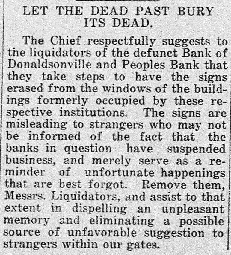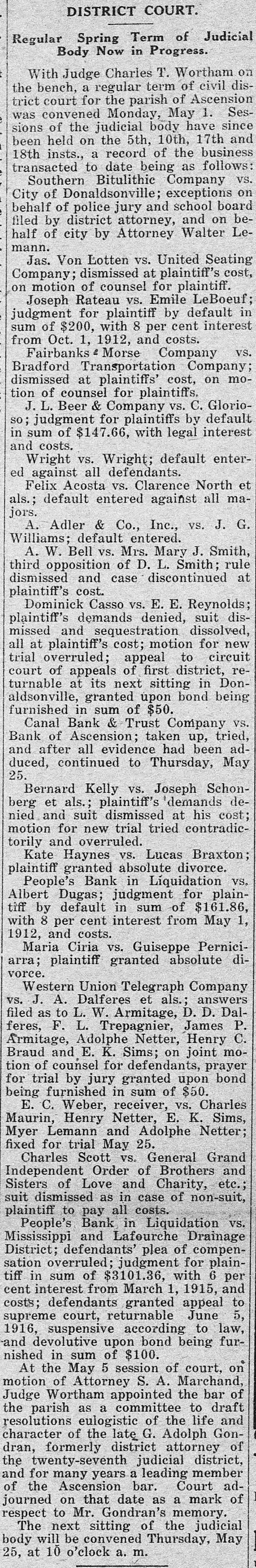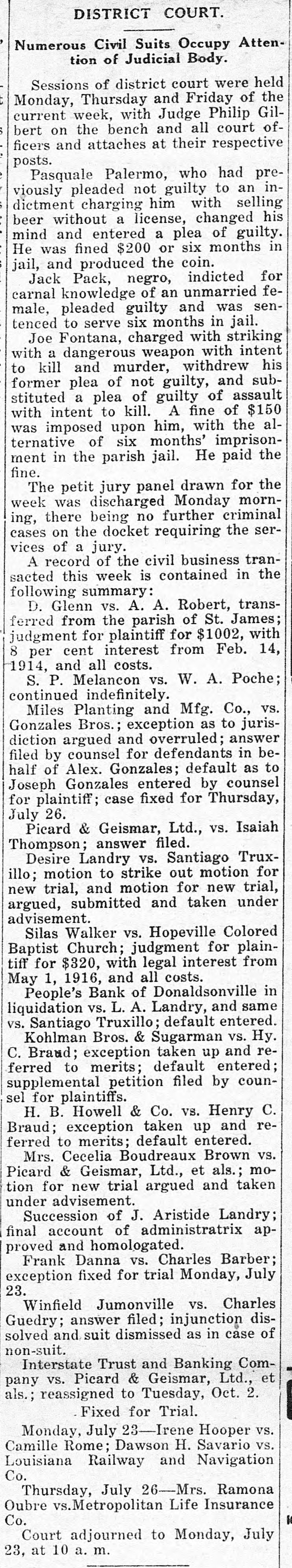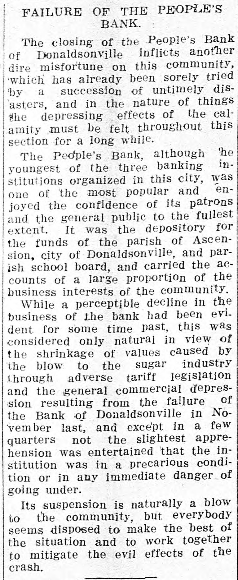 relative department findings to the latest bank. of this prior In the examination enclosed report of to made Oct. you of of 1913, there of the 18, certified this copy was of Donaldsonville statement . response a Bank office in condiPeople's called this the as the rendered to for report of on Sept. to a at the close of with a publication. statement clipping tion 10, 1913, screpancies evidencing together between its the pubon Many discremancie and the of the bank shown were lished statement by the books pointed out to you as day that date. in my that October report of 24, of 1913, board Jonaldsonville; visited the in On Bank meeting of its matter convened People's a went into them this that the the atdirectors; detail matter and general. had advised been the reported bank to show credited on torney books of payable was Orleans July The 1, bills and the bank New was debit- on, correspondent $10,000 of amount. this Later made by with a cross entry was was debited credit- with ed July 10, a payable amount correand the New to explain which $10,000 back bills to When the same asked Orleans cashier, Mr. ed the of spondent. this LeBlanc, cross credit was entry, unable from the and this to on furnish New being Orle- loan furwas in such an employe ans ther advise Questioned fact spondent stated entry effected that on the the of I sub- part the of of bank is 1910. mit of any that officer in violation or of section 9 of minutes Act 193 examination of the fails bank to show have An directors directors of this of secthat the complied the with the 193 provisionwinn of 1910, of every re11 of Act the directors at intervals quires bank, twice a examine or to invesstate tion that shall members year business, cause months, its paya into the the bank, joans, tigate commitlee fully and affairs of attention of books, to the with the particular investments the value ing discounts and ascertaining that this render after special view It of is required a sworn writ- its committee thereof. shall within ten days of the same the ten ten report and a report minutes is of recompletion al shall be at watch in the the report appeared what purports full ceived. meeting .On April 16, to dated 1914, be a there report Feb. and 26, of such 1914, com- law, of but a committee, the SO report as to signed comply is not or with sworn no record the to by plete is it appears held during neither There meeting 1914, when July 14, was held, any until meeting suspension 179 ordered 25 of Act diwhich a this special year meeting bank. called Section the a board of in- in of the that banking stitution s each month. of rectors 1902 provides of every shall meet state at least once of Donaldson Donaldsonville, People's in Bank the town of of Ascenville The is located in the parish as are direction sion. Its officers A. and Dalferes, J. C. Bouchefollow to Blanc, J. cashier; cashier. Directors Netter, L. W. J. assistant Adolphe F. K. reau, J. A. Armitage, Dalferes, D. P. D. Armitage, Dalferes, C. D. Elmer Gon- and W. J. Braud, Colomb Hunt, Henry Sims, B. LeBlanc. dran, Trepagnier E. C. A. in accordance 13 to that W. J. the 1910, acting I of writing section submit district so the above may facts direct take whatever Act with 193 of to you the in proper action premises. Yours you attorney you deem to proper in the WM. L. State Banks. State Examiner of July 18, 1914. GenHon onville, La. Attorney Donaldson Pleasant, La. Dear Sir:- from his people's eral, R New G. Mr. Orleans, Young investigation having Bank ibeen of away of the report Donald submitted into called the affairs dsonville, La., 'to a you by him instatement since which structed of on the was 16th me desire to inst., com supplement to the of invest. his his regaltion, report sult, of with I my in investigation accordance LeBlanc, with his the indeparture, structioquestioning . Upon appeared Mr. relative to to have cer- not cashier of the which the but these tain collected items by found `that been for, follows: atcity, sum remitted drafts Sight are as drawn draft as with by 'the Geo.P. bill Lafour for Lafourche of plant lading Mill Mer- the LaMerpeople's ing cantile tached Company Company of $351.76 on and of paid this Company Bank by said of Don- by fourche on the July 3, 1914. of lading Mill- atcheck draft on with Geo. bill P. Plant MerSight drawn on by the Lafourche city, for La. the ing tached Company Company of this paid by said by of Bank of 6, howcantile sum fourche $804.50, Mercantile the People's July and Company amount, 1914. Don- The check on on ting this me in the bank the check was represent found by charged to carried and ever, had of never the been drawer asset of nor the bank. this said sight Upon check and was bill of lading draft as account a item or Mr. to LeBlanc cover this