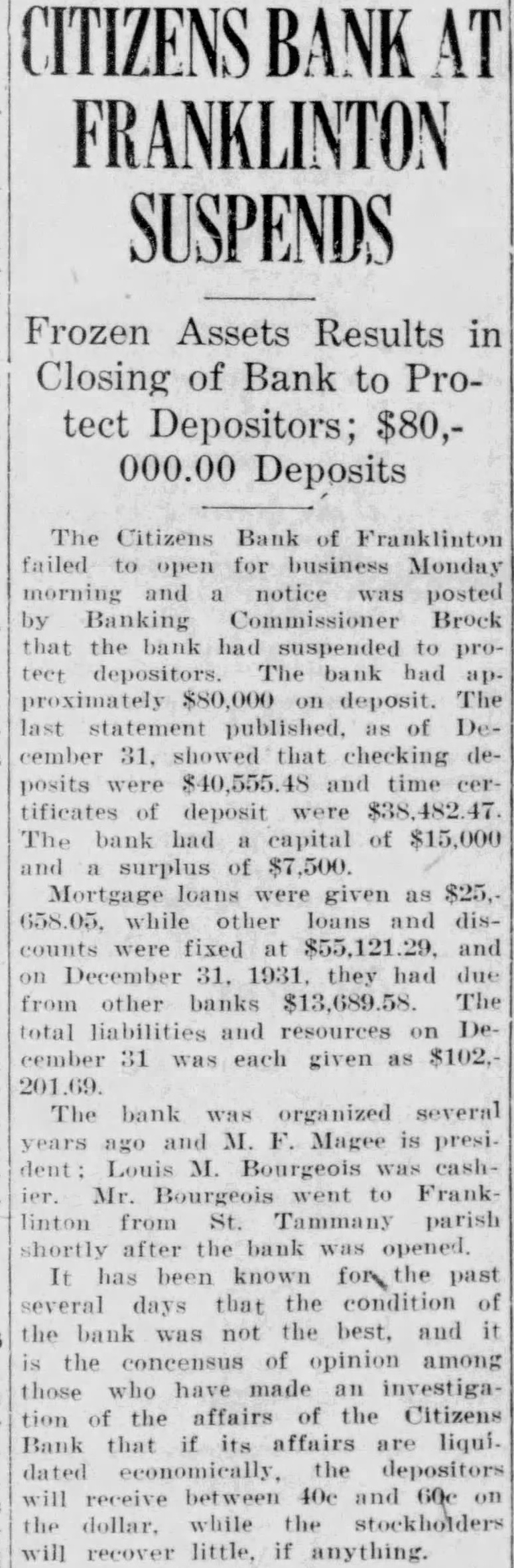 BY BROCK (State Bank Commissioner) (Written for Associated Press) NEW ORLEANS, April banksituation in Louisiana may be regarded with considerable satisfaction view of general conditions that prevailed for sometime, and compared with the banking situation throughout the country whole. During 1931 there only five small banks, close in into judicial liquidation. Since the beginning of 1932 other small banks the most their suspension practically one hundred per having by reorganization, merger refinancing. Changes among State Banks Louisiana since January 1932 are follows: Planters Bank Cheneyville, with deposits approximately suspended January 1932. Reopened January 1932, Branch the Commercial Bank Trust Company Alexandria, Parish Bank Trust Company Opelousas, with total deposits aproximately $390,000.00, suspended January 1932. Reorganized and opened March Parish Trust Savings Bank. Following close of the Parish Bank Trust Company of Opelousas on Saturday January 23, considerable proportions developed and continued throughout the day Planters Trust Savings Bank, with total deposits $850,000.00. bank demand uninterruptedduring the day but deemed for the proper protection all depositoors, reorganization be effected. This was accordIngly completed over the week end, after only on the Monday following, viz January 1932, the the Planters Trust Savings Bank Opelousas. Breaux Bridge Bank Trust Comof Breaux Bridge, with total deposits of approximately suspended January 1932, reorganized and reopened March 16th, under name of Farmers Merchants Bank. Bank of La., deposits of suepended February 1932, March 16th Bank of Abbeville & Trust Company. Bank Maurice of Maurice, La., with total deposits approximately suspended February 1932, reopened March branch Bank Abbeville Trust Company. Bank of Loreauville of Loreauville, with total deposits suspended February 1932, now of and process within The Citizens Franklinton, with deposits of $72,000.00, February 15, 1932, has been placed in liquidation, and the only year to forced into liquidation. In case, however, perfected whereby the are to receive fifty per of their funds without with fair eventually more. In addition to the above, one other which suspended in December 1931, has reopened by merger bank in the town. Also of the banks that closed in Novemwhich since been in process completed its plans for and its being tingent only upon its loan from the Finance Corporation. been reported that there were some thirty hundred bank failures the United States past number eight in Louisiana. the several reorganizations and reopenings of banks mentioned, found necessary in order to better conserve the all concerned, to provide that depositors funds be made available only time payment basis. Eight banks three branches have been reopened using this plan, and more than certificates deposit have been issued. This includes one during latter part 1931. In this manner some twenty thousand depositors having approximately deposit have been protected for the full one hundred per centum of their deposits. Records forced judicial liquidations of banks show average to depositors of from forty fifty centum. Therefore, through the method reorganization used the of eight banks listed resulted saving nearly million dollars to depositors. Finance Corporacontributed material aid to many banks throughout section. Louisiana and Mississippi bankers fortunate having local office this located this to facilitate for loans; officials that the and composed and business this who well know the values the held by are converwith local conditions. The National Corporation valued many our banks prior the inauguration the Finance Corporation.