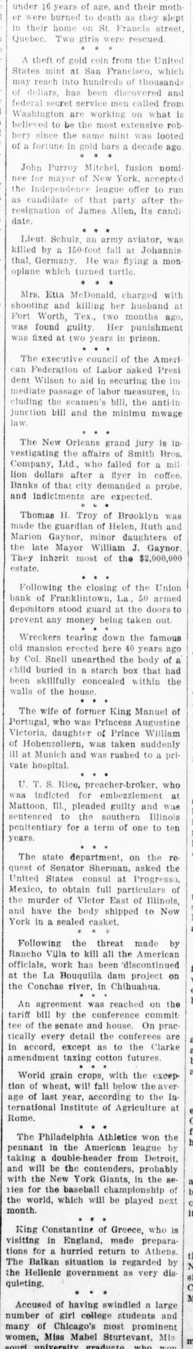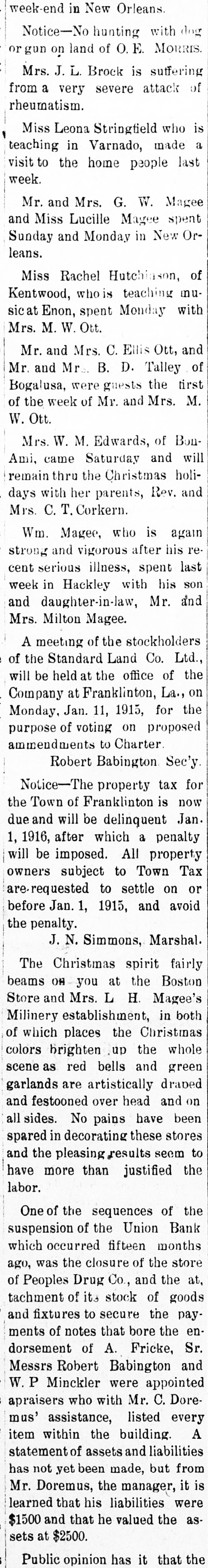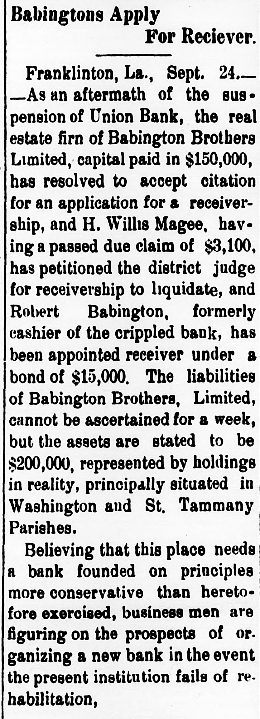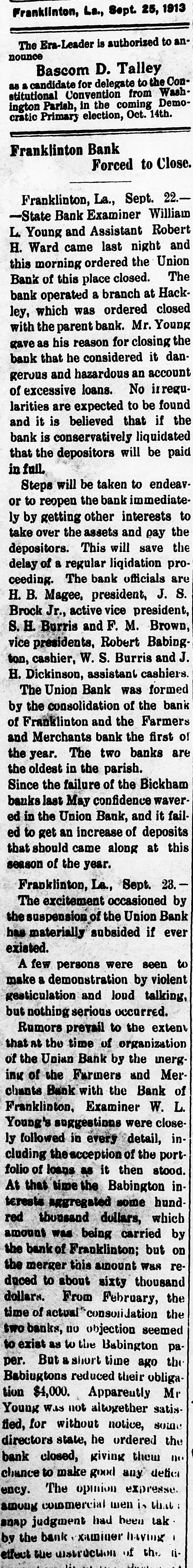 Franklinton, La., Sept. 25, 1913 The Era-Leader is authorized to announce Bascom D. Talley as a candidate for delegate to the Constitutional Convention from Washington Parish, in the coming Democratic Primary election, Oct. 14th. Franklinton Bank Forced to Close. Franklinton, La., Sept. 22.-State Bank Examiner William L. Young and Assistant Robert H. Ward came last night and this morning ordered the Union Bank of this place closed. The bank operated a branch at Hackley, which was ordered closed with the parent bank. Mr. Young gave as his reason for closing the bank that he considered it dangerous and hazardous an account of excessive loans. No regularities are expected to be found and it is believed that if the bank is conservatively liquidated that the depositors will be paid in full. Steps will be taken to endeavor to reopen the bank immediate ly by getting other interests to take over the assets and pay the depositors. This will save the delay of a regular liqidation proceeding. The bank officials are H. B. Magee, president, J. S. Brock Jr., active vice president, S.H. Burris and F. M. Brown, vice presidents, Robert Babington, cashier, W. S. Burris and J. H. Dickinson, assistant cashiers. The Union Bank was formed by the consolidation of the bank of Franklinton and the Farmers and Merchants bank the first of the year. The two banks are the oldest in the parish. Since the failure of the Bickham banks last May confidence wavered in the Union Bank, and it failed to get an increase of deposits that should came along at this season of the year. Franklinton, La., Sept. 23. The excitement occasioned by the suspension of the Union Bank has materially subsided if ever existed. A few persons were seen to make a demonstration by violent gesticulation and loud talking, but nothing serious occurred. Rumors prevail to the exten that at the time of organization of the Unian Bank by the inergink of the Farmers and Merchants Bank with the Bank of Franklinton, Examiner W. L. Young's suggestions were closely followed in every detail, including the acception of the portfolio of loans as it then stood. At that time the Babington interests aggregated some hundred thousand dollars, which amount was being carried by the bank of Franklinton; but on the merger this amount was reduced to about sixty thousand dollars. From February, the time of actual consolidation the two banks, no objection seemed to exist as to the Babington paper. But a short time ago the Babiugtons reduced their obligation $4,000. Apparently Mr Young was not aitogether satis. tied, for without notice, some directors state, he ordered the bank closed, giving thew no chance to make good any detier ency. The opinion expresse. among commercial wen is thise snap judgment had been tak by the bank xaminer having effect the DISTRUCTION of the ii
