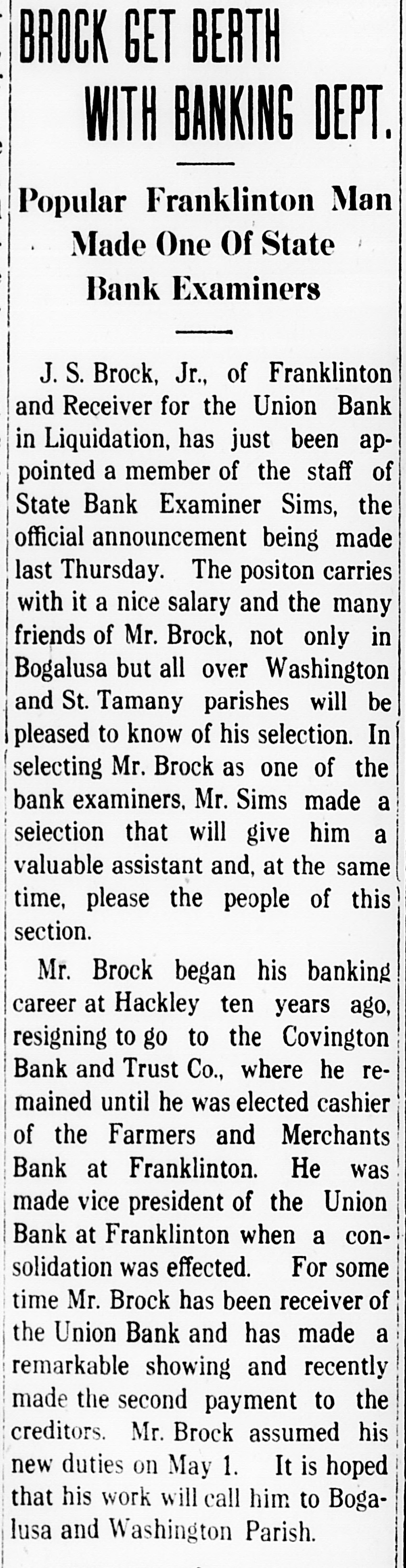 # BROCK GET BERTH # WITH BANKING DEPT. Popular Franklinton Man Made One Of State Bank Examiners J. S. Brock, Jr., of Franklinton and Receiver for the Union Bank in Liquidation, has just been appointed a member of the staff of State Bank Examiner Sims, the official announcement being made last Thursday. The positon carries with it a nice salary and the many friends of Mr. Brock, not only in Bogalusa but all over Washington and St. Tamany parishes will be pleased to know of his selection. In selecting Mr. Brock as one of the bank examiners, Mr. Sims made a selection that will give him a valuable assistant and, at the same time, please the people of this section. Mr. Brock began his banking career at Hackley ten years ago, resigning to go to the Covington Bank and Trust Co., where he remained until he was elected cashier of the Farmers and Merchants Bank at Franklinton. He was made vice president of the Union Bank at Franklinton when a consolidation was effected. For some time Mr. Brock has been receiver of the Union Bank and has made a remarkable showing and recently made the second payment to the creditors. Mr. Brock assumed his new duties on May 1. It is hoped that his work will call him to Bogalusa and Washington Parish.