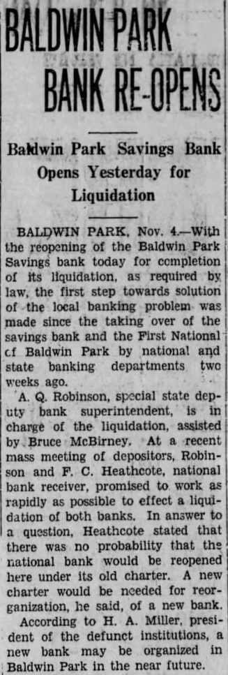 Baldwin Park Savings Bank Opens Yesterday for Liquidation BALDWIN PARK, Nov. the reopening of the Baldwin Park Savings bank today for completion of its as required by law, the first step towards solution local banking problem was made since the taking over of the savings bank and the First National Baldwin Park by national and state banking departments two weeks special state uty bank superintendent, charge of the liquidation, assisted McBirney. recent mass meeting of depositors, Robinand Heathcote, national bank receiver, promised to work rapidly possible to effect liquidation of both banks. In answer to question, Heathcote stated that there no probability that the national bank would be reopened here under its old charter. new charter would be needed for reorganization, he said, of bank. According to H. president of the defunct institutions, new bank may be organized Baldwin Park in the near future.